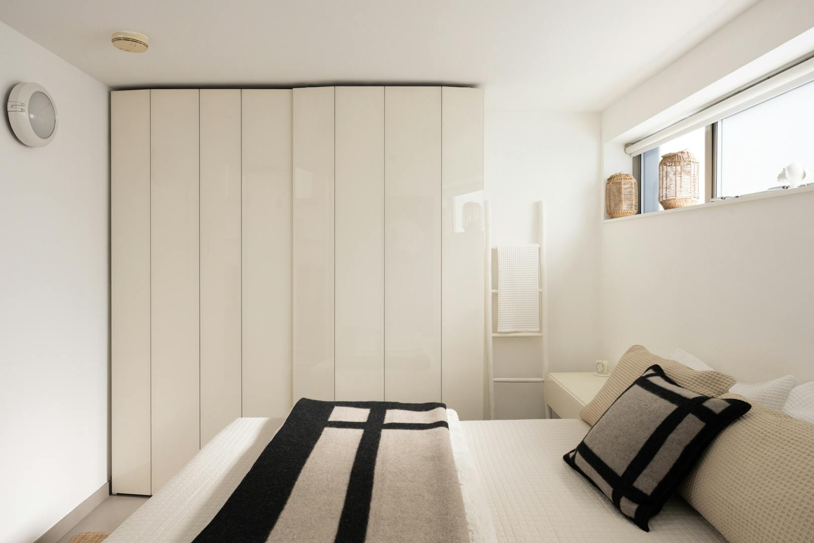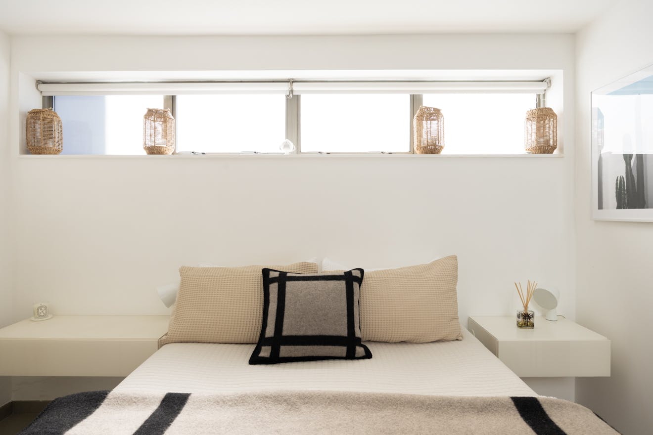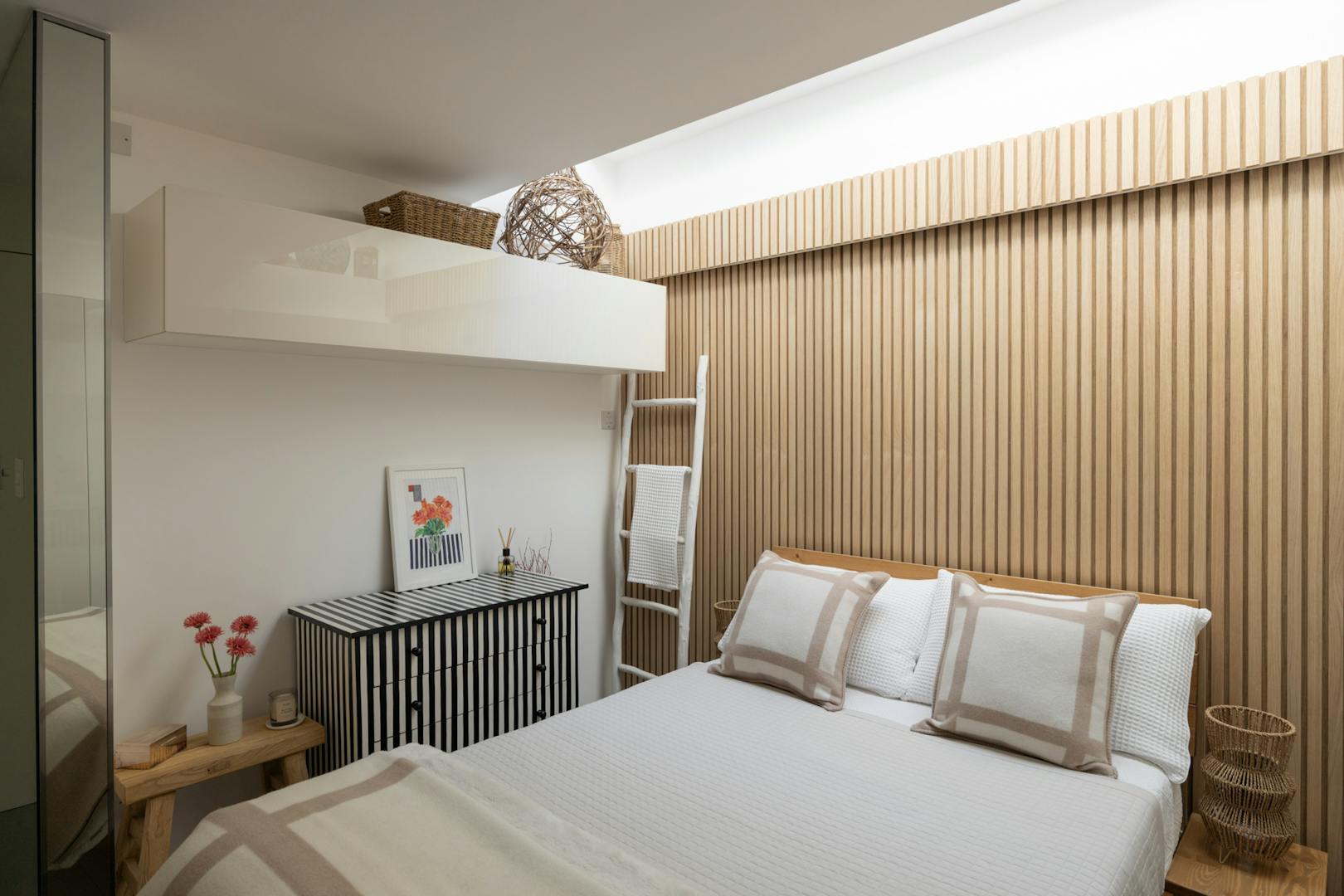 On this floor, towards the rear of the plan, there is a double bedroom set apart and thoughtfully designed with pocket doors to maximise space. Integrated storage helps to maintain the clean, uncluttered feel, while clerestory glazing draws in soft natural light, lending the room a calming atmosphere.