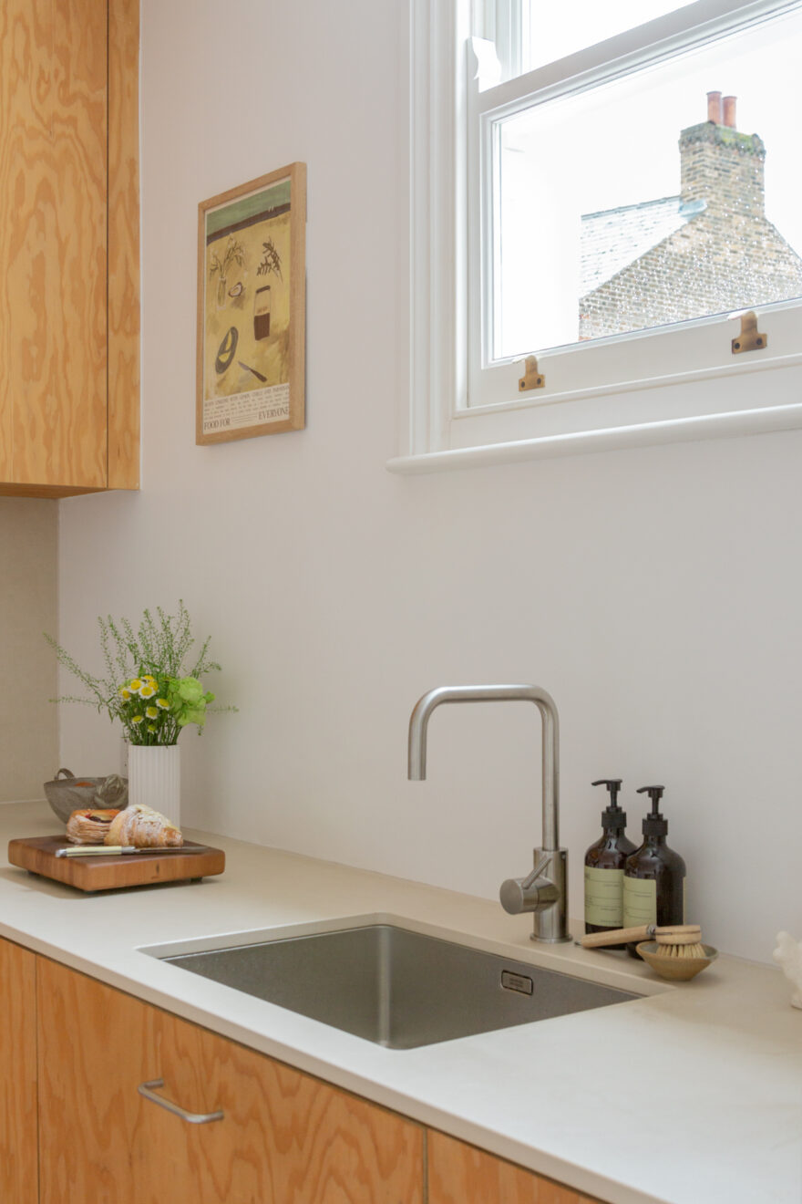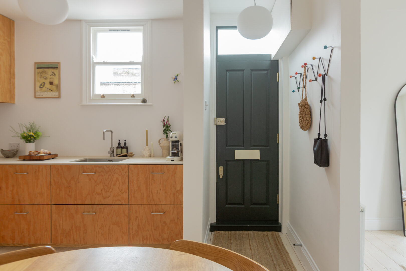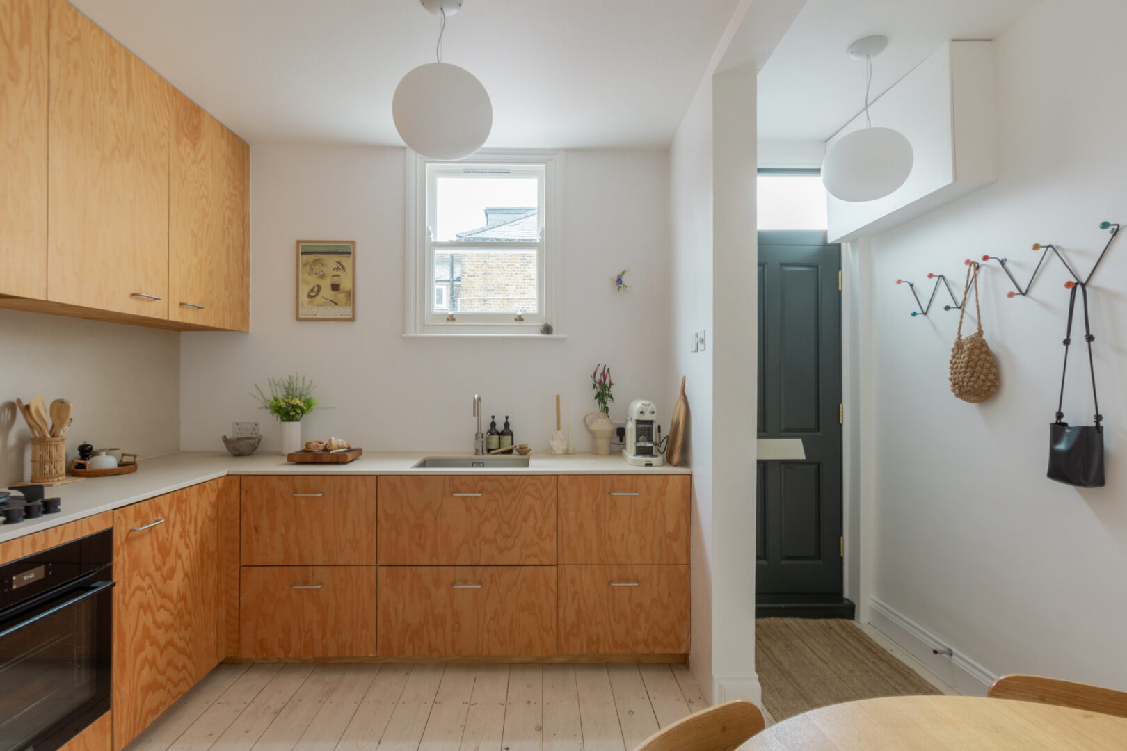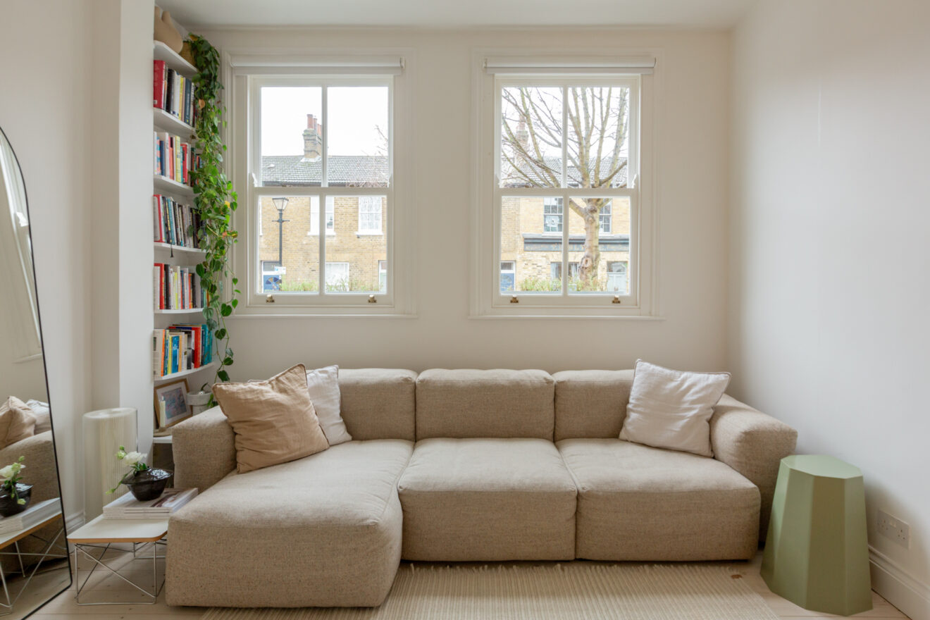 The property is accessed via its own private front door on Barclay Road. Positioned at the end of the terrace, the apartment benefits from abundant natural light entering from the front, side and rear. Inside, an open-plan layout brings together a bespoke Douglas fir kitchen, dining area and living space. To the front, double-glazed sash windows allow west-facing sunlight to pour in throughout the day, while whitewashed floorboards sit comfortably beneath crisp white walls and ceilings.