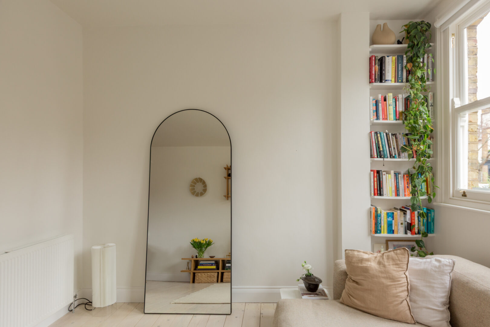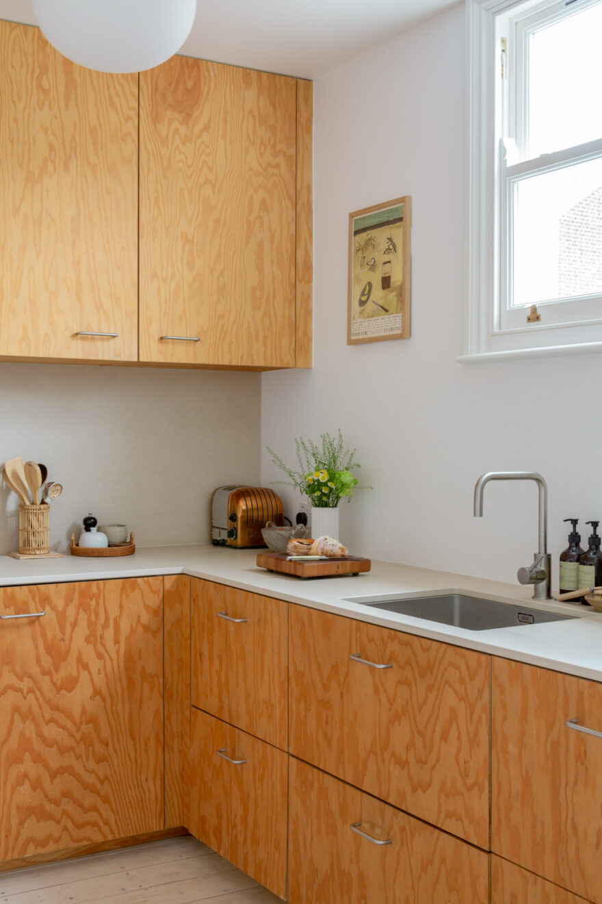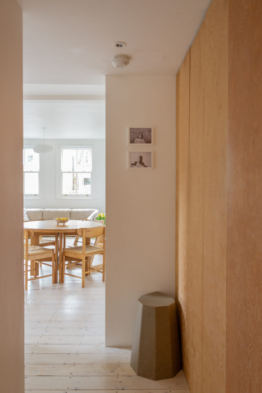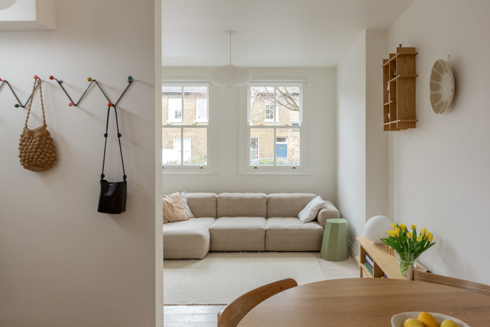 The property is accessed via its own private front door on Barclay Road. Positioned at the end of the terrace, the apartment benefits from abundant natural light entering from the front, side and rear. Inside, an open-plan layout brings together a bespoke Douglas fir kitchen, dining area and living space. To the front, double-glazed sash windows allow west-facing sunlight to pour in throughout the day, while whitewashed floorboards sit comfortably beneath crisp white walls and ceilings.