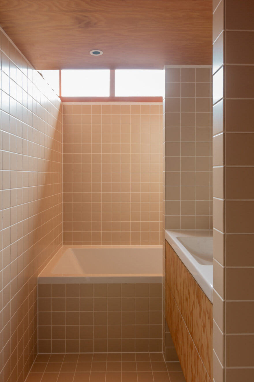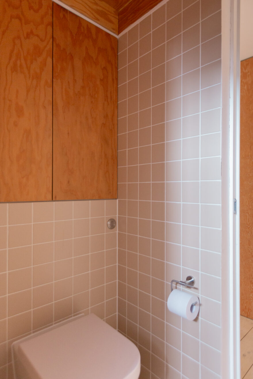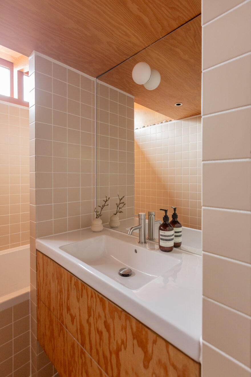 The bathroom continues the same design language, softened with dusty-pink tiling that provides a calm counterpoint to the richness of the surrounding wood textures. Underfloor heating has been introduced, bringing a gentle warmth beneath the feet.