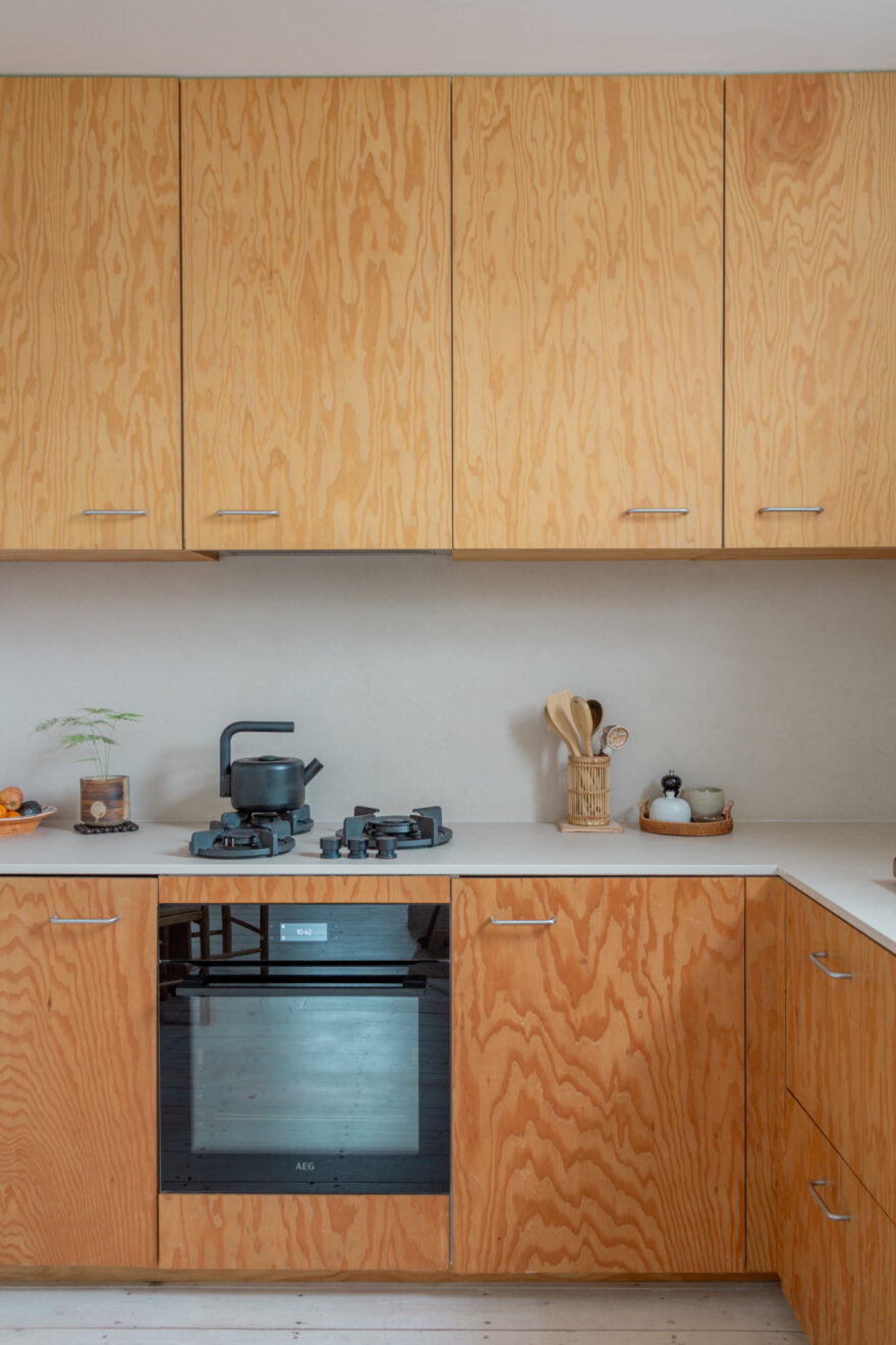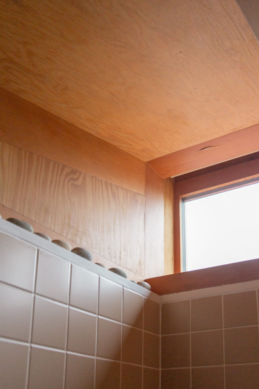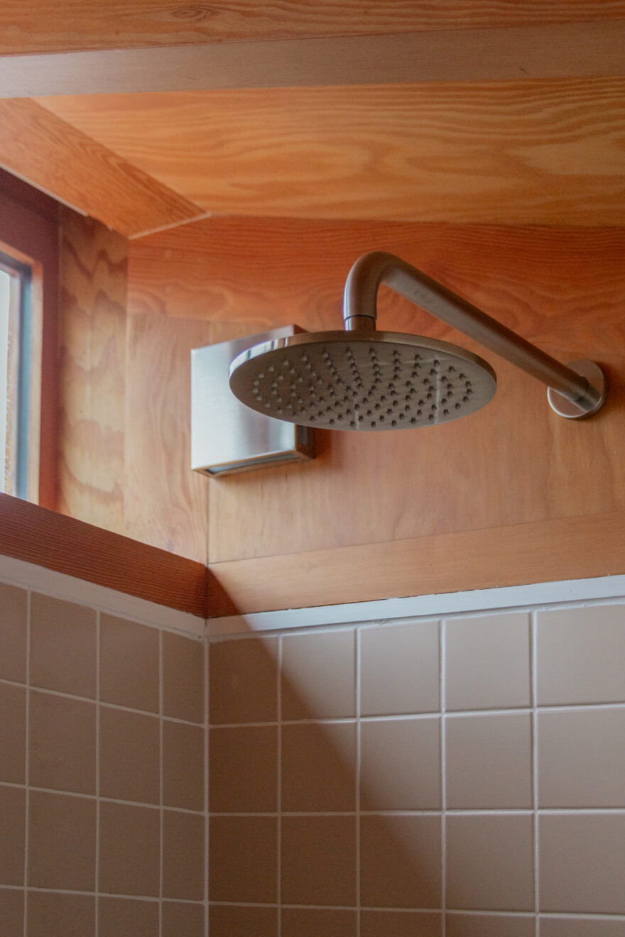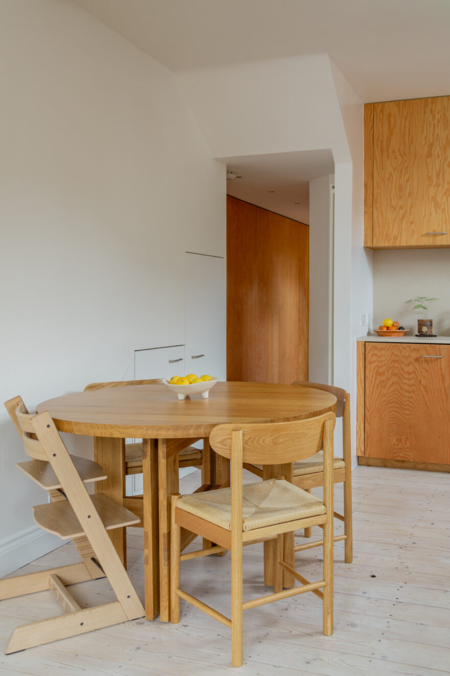 The bathroom continues the same design language, softened with dusty-pink tiling that provides a calm counterpoint to the richness of the surrounding wood textures. Underfloor heating has been introduced, bringing a gentle warmth beneath the feet.