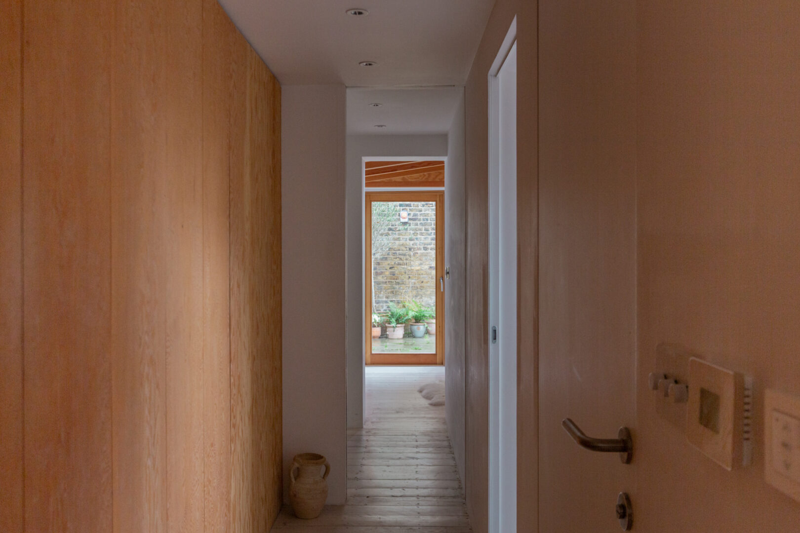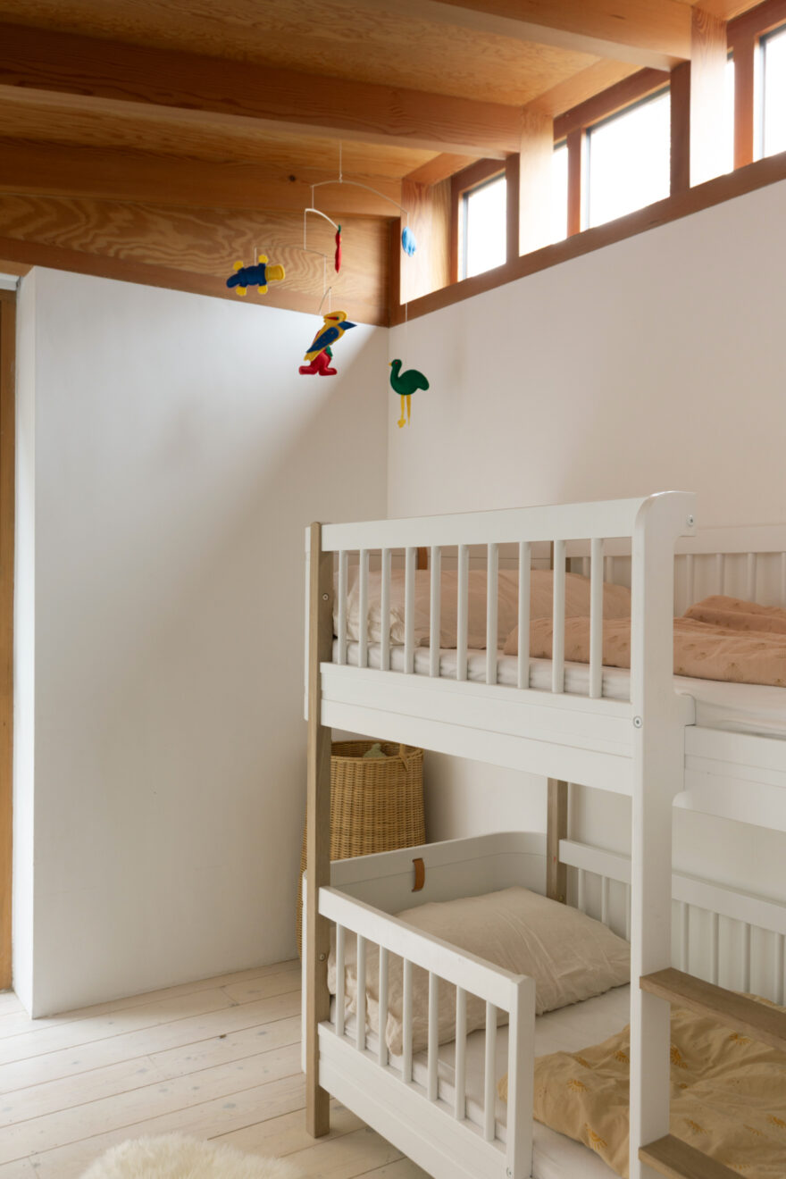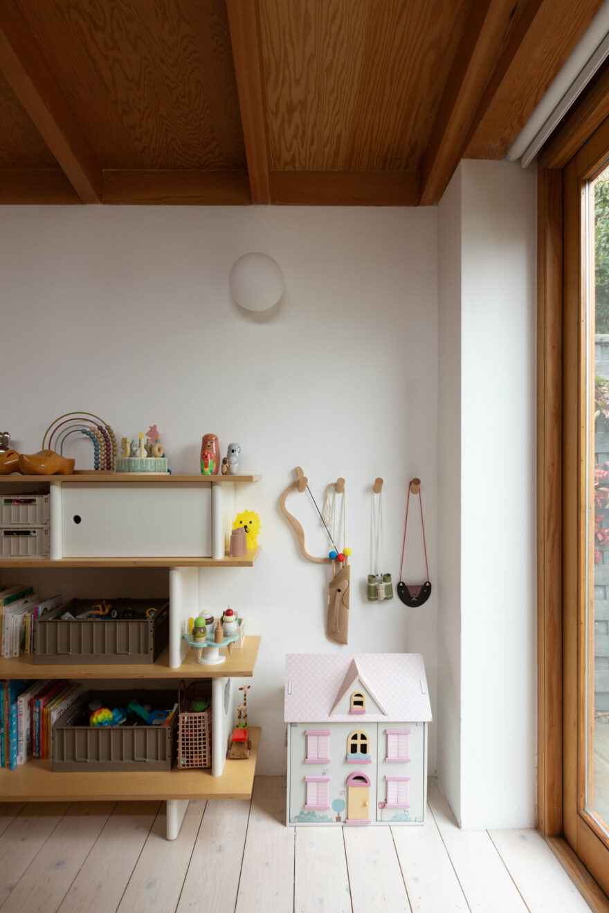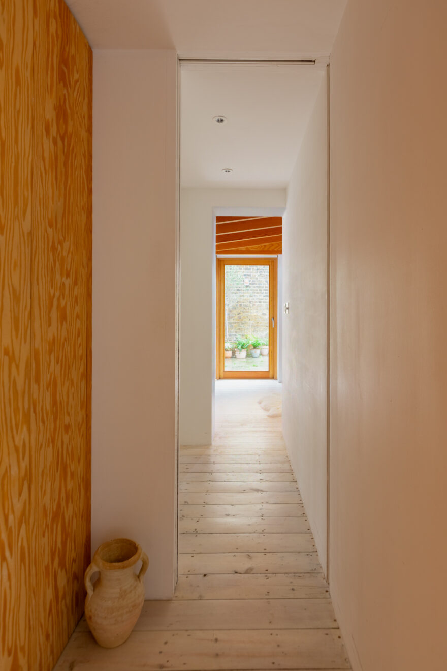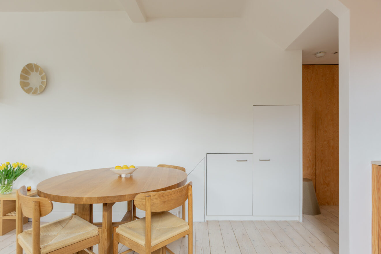 Douglas fir is a defining material throughout the home. In the hallway, it has been used to form full-height built-in cupboards, providing generous storage alongside discreetly housed utilities. From here, there is access to two bedrooms, both featuring exposed beams and timbers. A raised roofline creates an elegant apex at the clerestory windows, enhancing both volume and natural light.