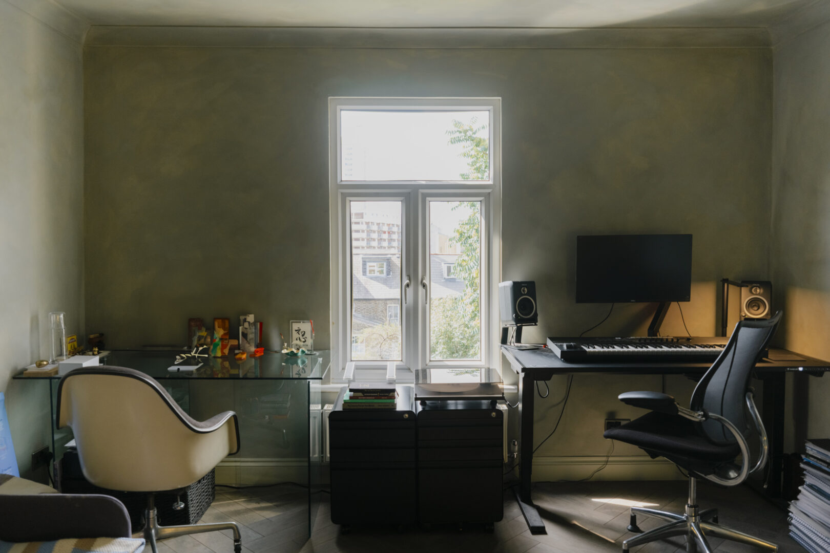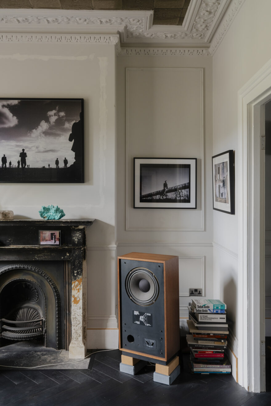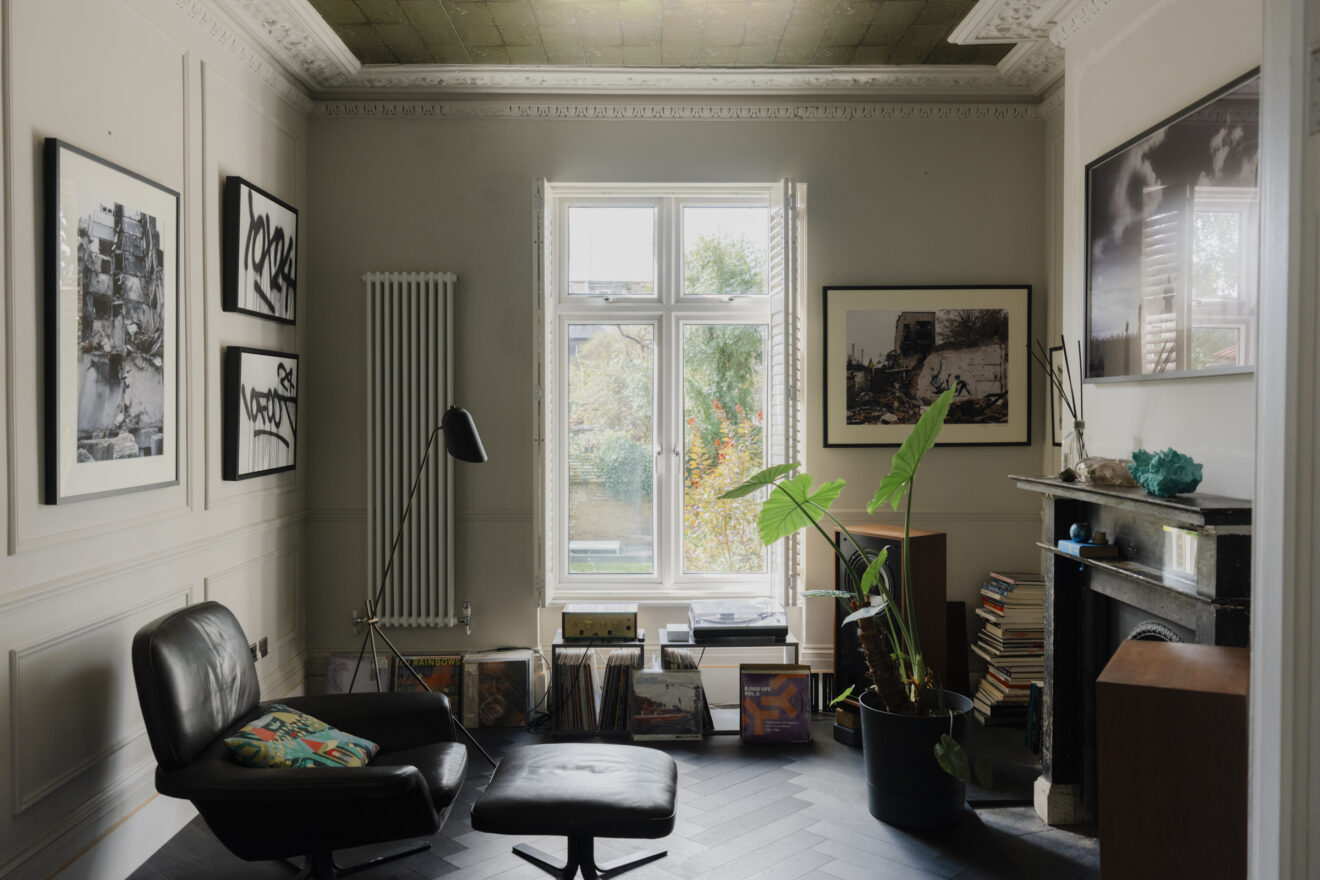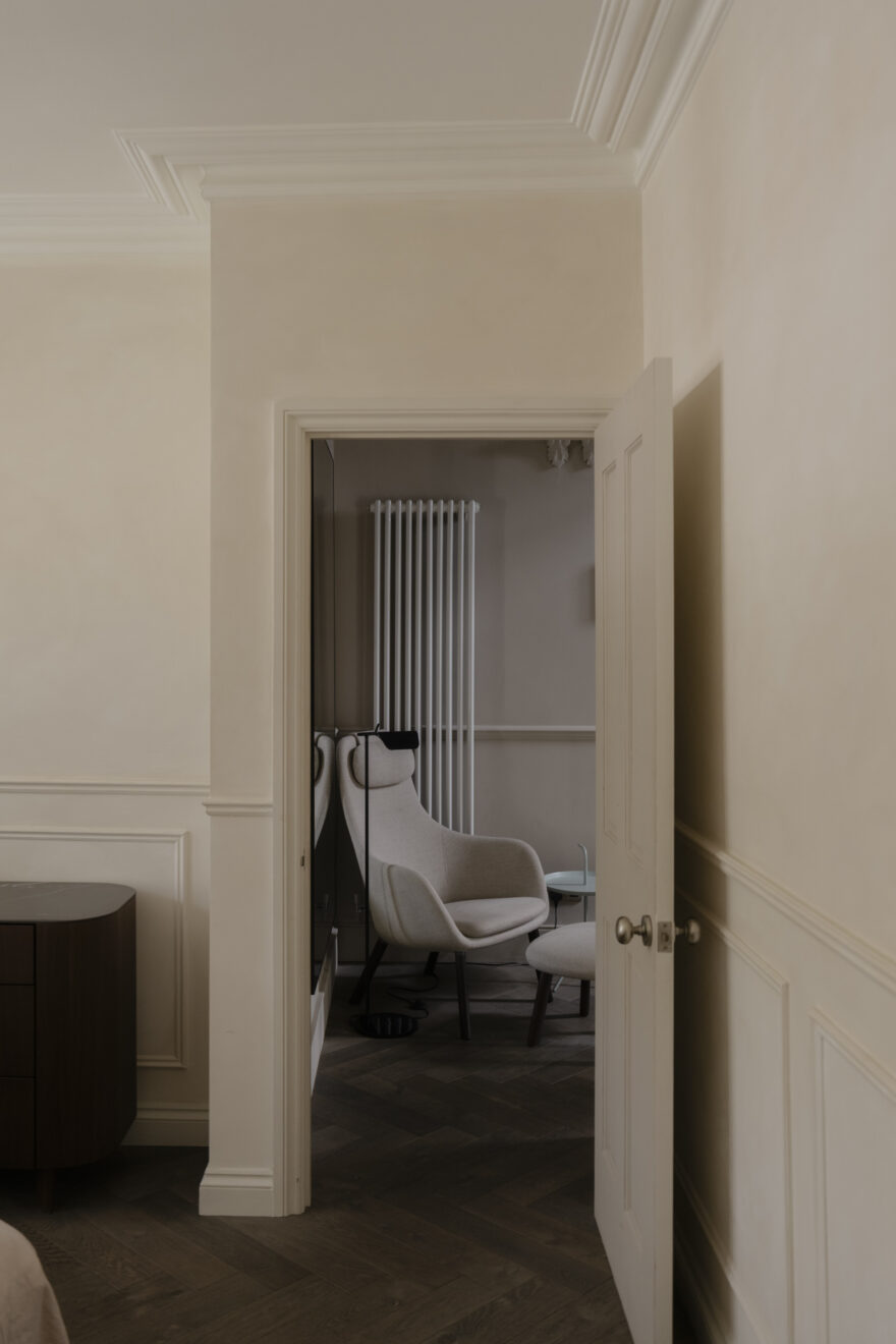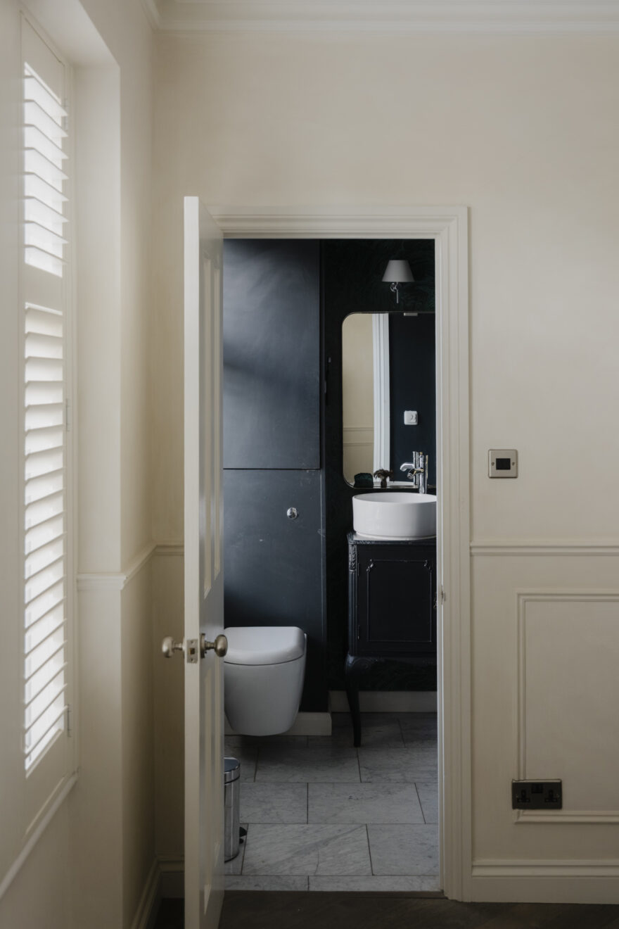 The garden-facing reception room has been designed around the current owner’s love for music. Panelled walls frame carefully selected pieces of art while a second marble fireplace anchors the space and sits between the speakers that intentionally create a space to unwind and enjoy the surroundings. From here large double glazed windows overlook the peaceful south-facing rear garden. Underfoot in both rooms, recently installed chevron flooring in a dark shade grounds the space with quiet sophistication. For added practicality, soundproofing has also been thoughtfully integrated beneath the floors. A useful W.C and cloakroom completes the tour of this impressive floor.