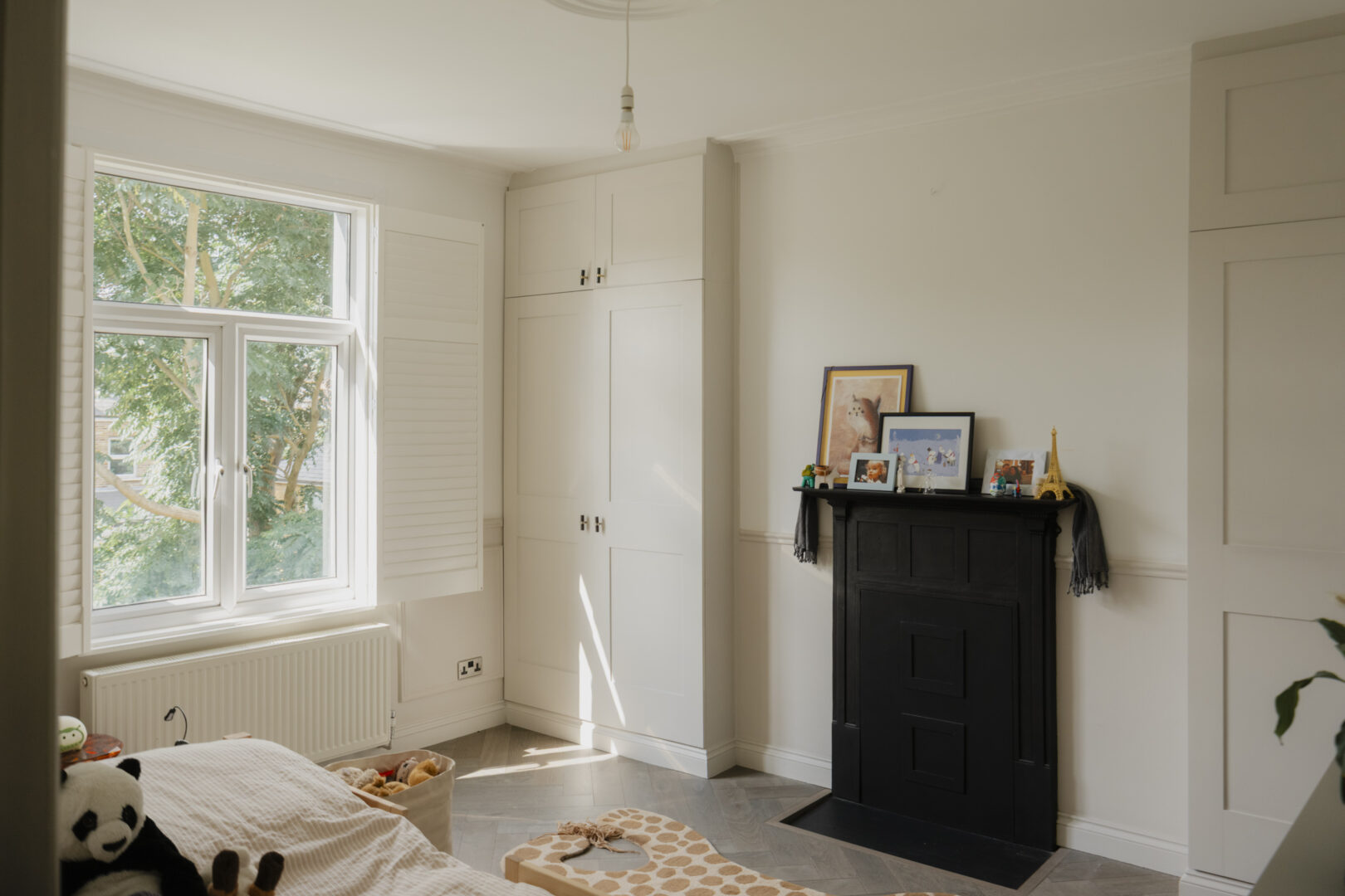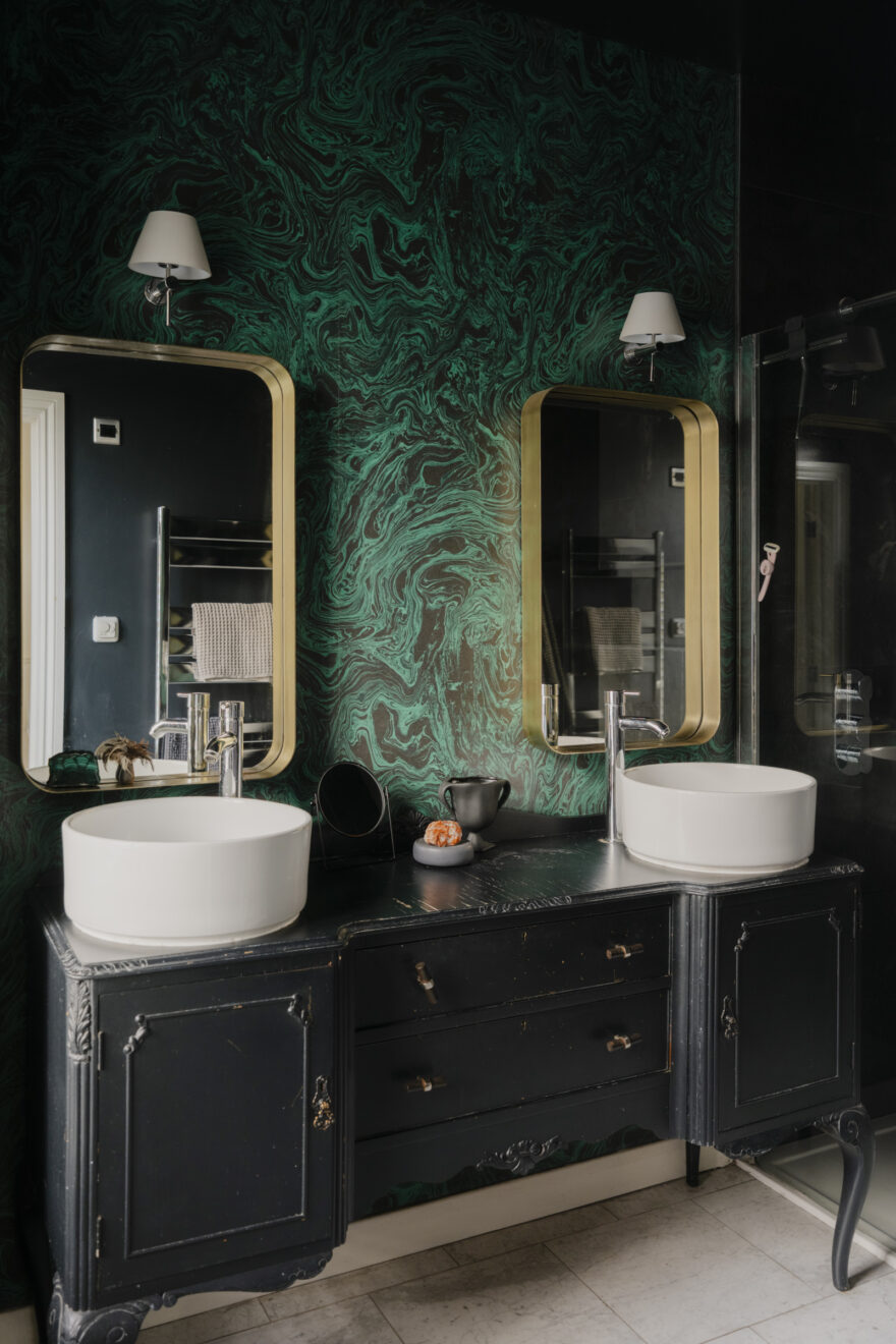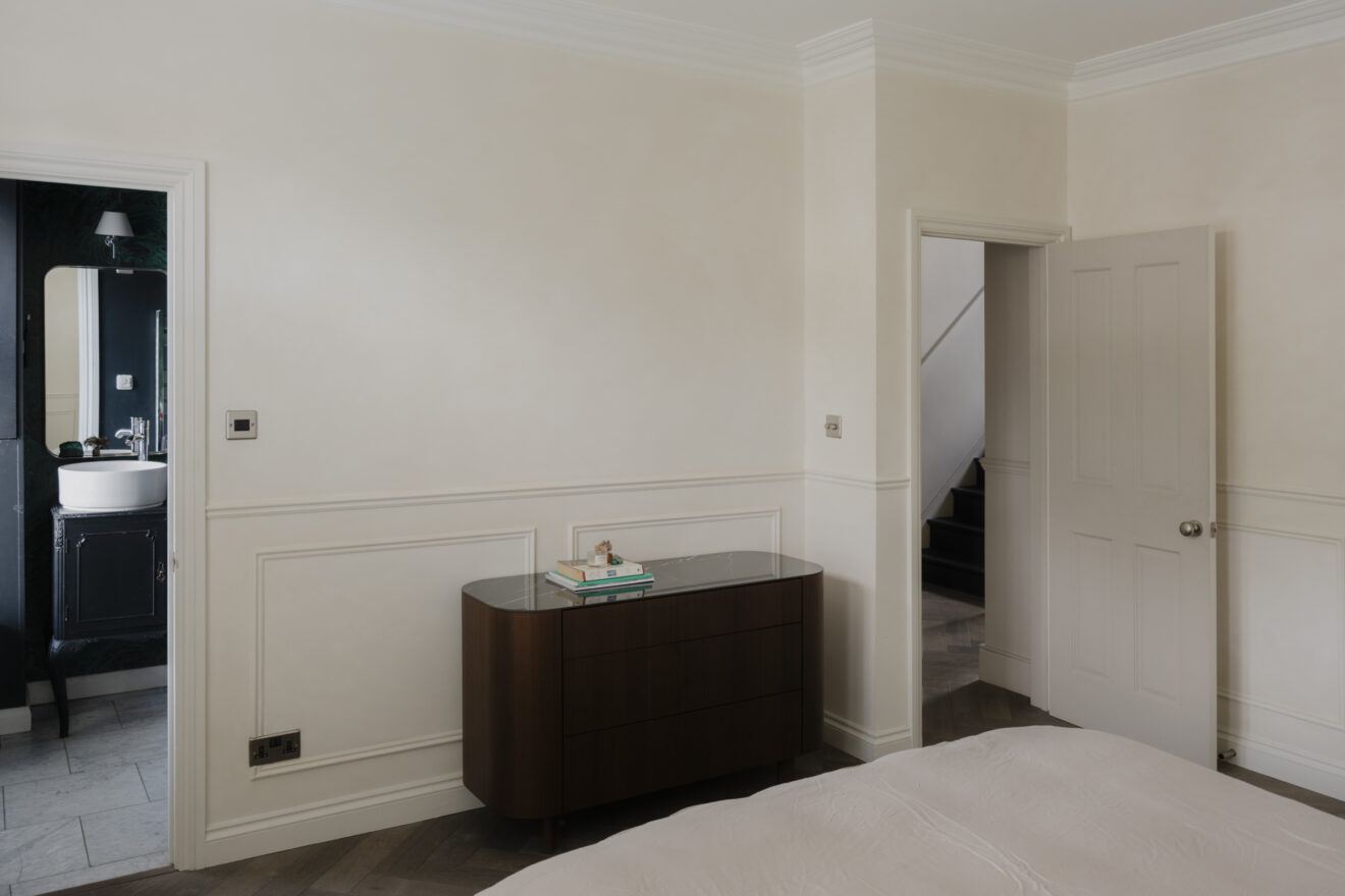 The first floor is home to the principal bedroom, a calm and elevated retreat. Finished in Bauwerk “Mykonos” limewash paint, the space is rich in texture, offering a soft, natural backdrop. The en-suite bathroom pairs vintage elegance with raw materiality. A striking malachite-effect wall sets the tone, complemented by a black antique vanity with twin vessel sinks and arched mirrors. Dark stone tiles frame the walk-in shower, while soft lighting adds a warm, atmospheric finish. Next door, a generously sized bedroom features floor-to-ceiling built-in wardrobes flanking the original fireplace (currently concealed), offering both symmetry and ample storage.