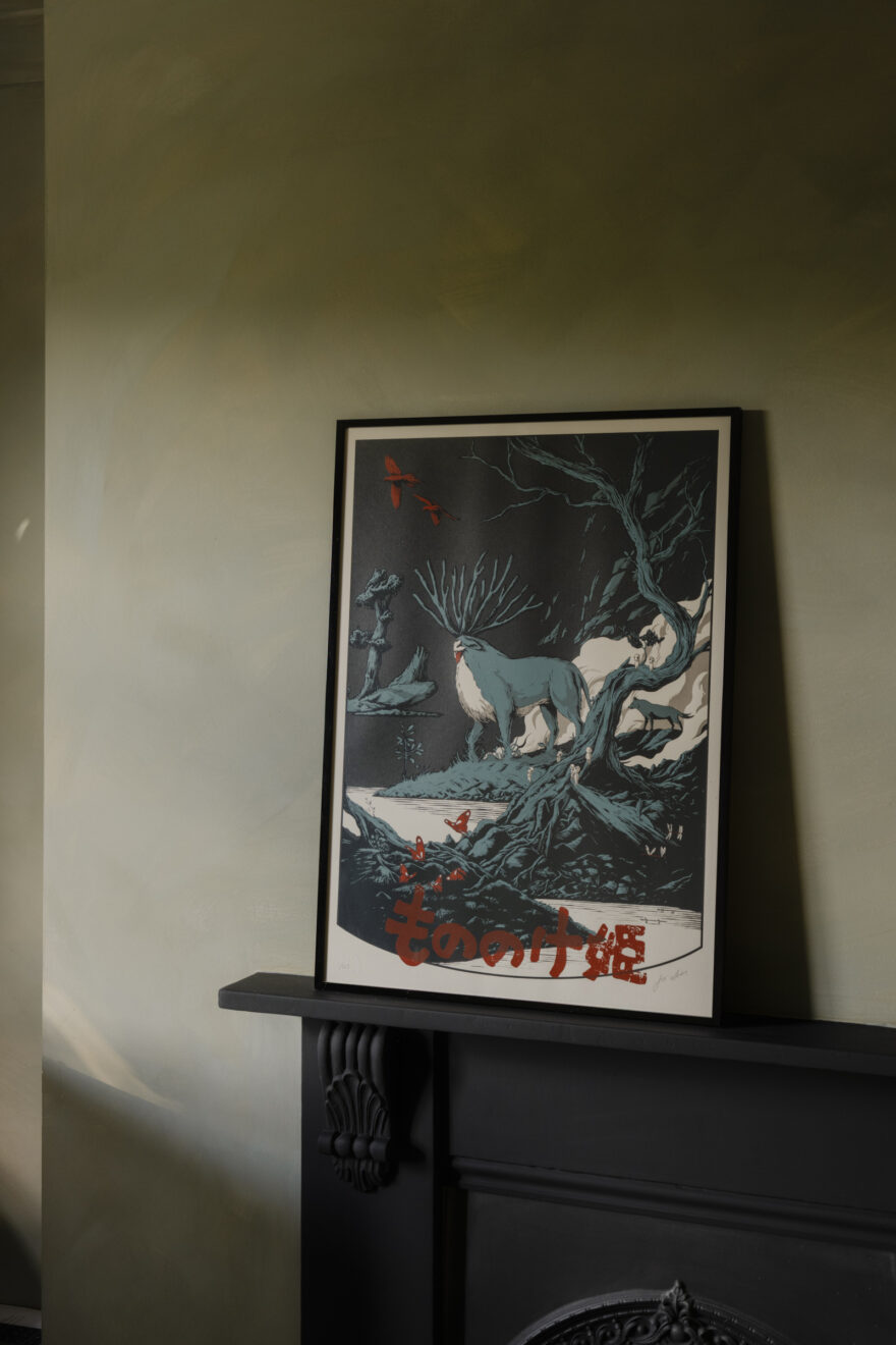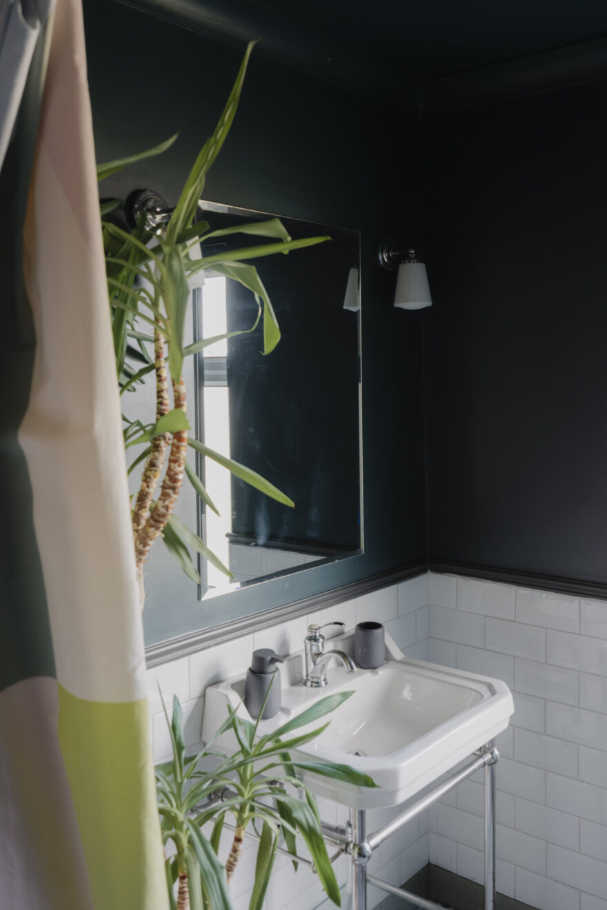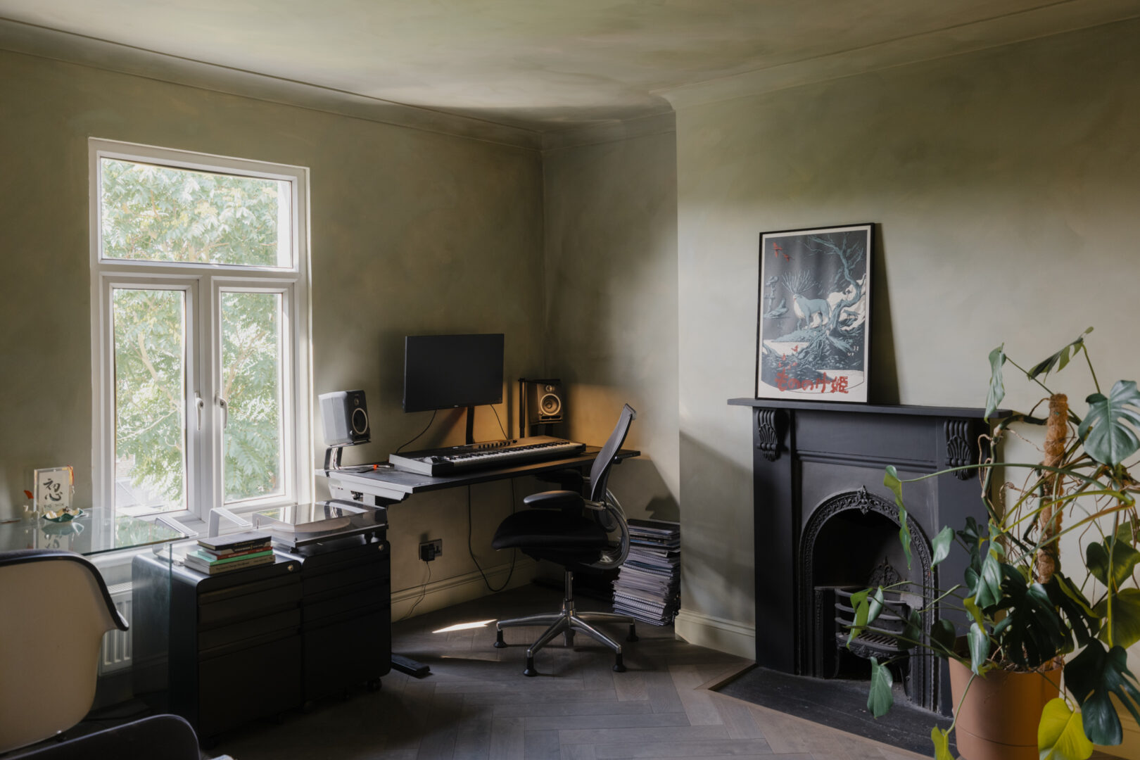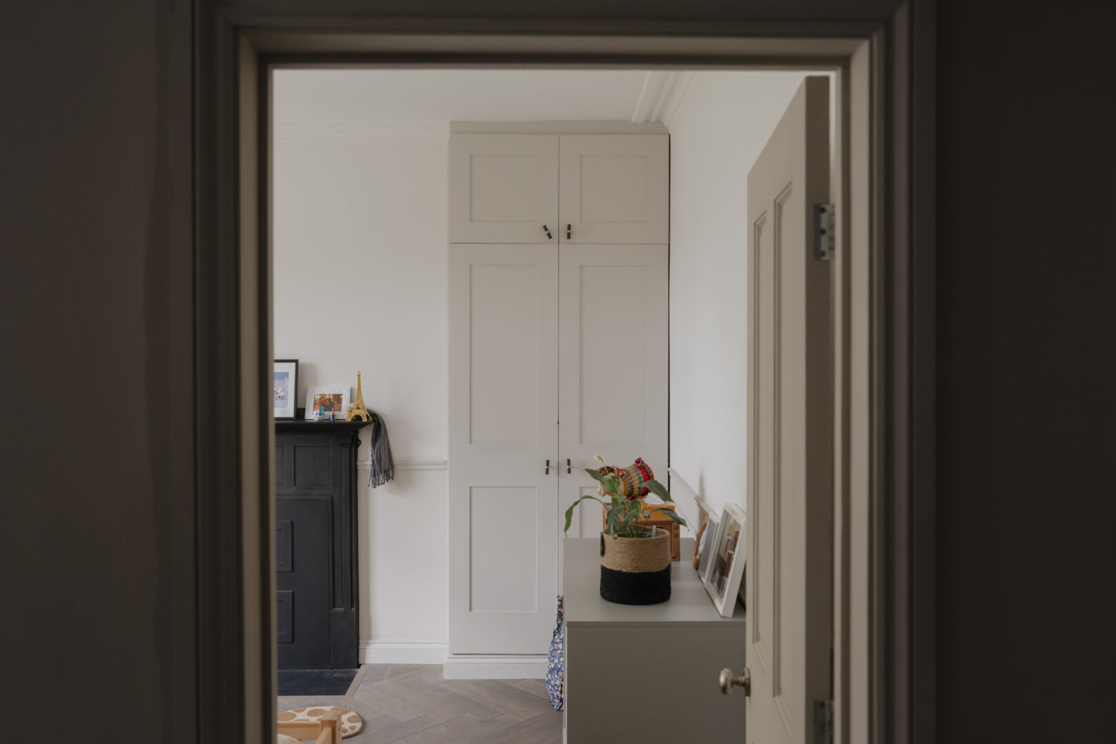 The first floor is home to the principal bedroom, a calm and elevated retreat. Finished in Bauwerk “Mykonos” limewash paint, the space is rich in texture, offering a soft, natural backdrop. The en-suite bathroom pairs vintage elegance with raw materiality. A striking malachite-effect wall sets the tone, complemented by a black antique vanity with twin vessel sinks and arched mirrors. Dark stone tiles frame the walk-in shower, while soft lighting adds a warm, atmospheric finish. Next door, a generously sized bedroom features floor-to-ceiling built-in wardrobes flanking the original fireplace (currently concealed), offering both symmetry and ample storage.