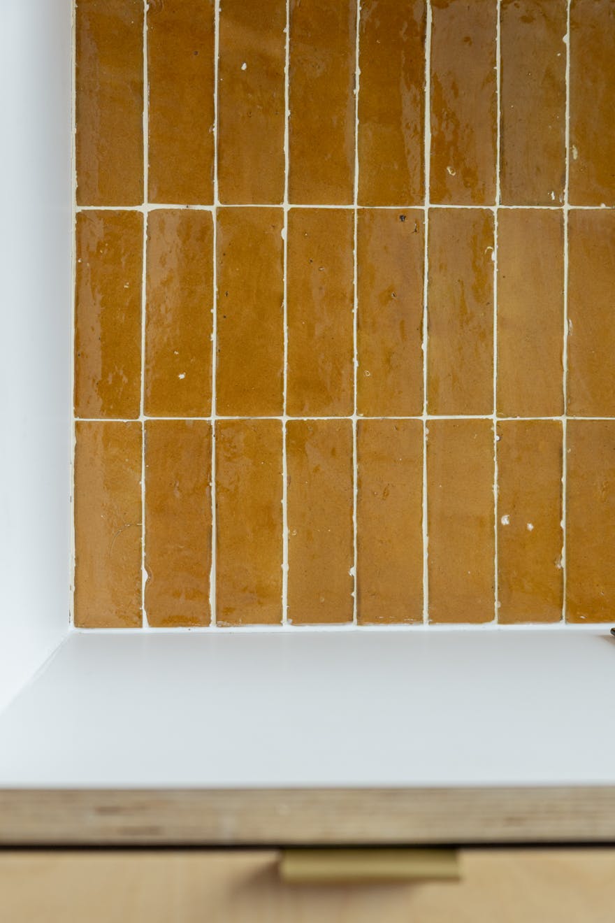 The spacious living areas are bookended by windows, allowing natural light to move freely from east to west. At one end, a cosy reception area has been defined, making use of wall space for both art and storage. The room then flows through to the dining area and onward to the kitchen. Integrated appliances are concealed behind birch ply fronts, providing ample storage, while a sustainable Fenix worktop and burnt-umber Bert & May splashback tiles contribute to a contemporary design that remains in keeping with the building’s character. Throughout the home, the original terrazzo window cills have been retained, and all tiling has been chosen to complement the Art Deco design.
