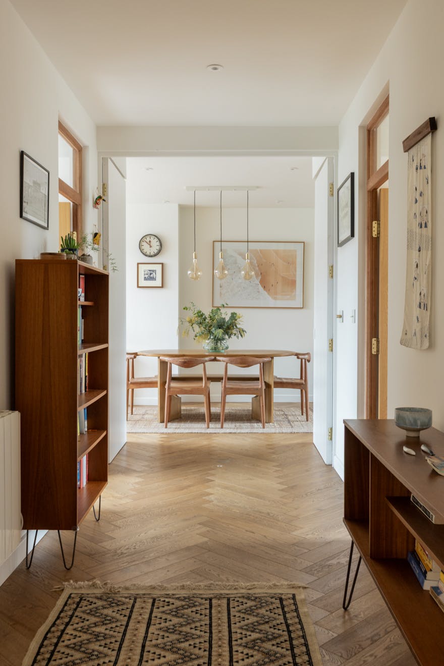 Inside, the raised ground-floor lateral apartment opens into an inviting hallway, where herringbone engineered oak floorboards from Istoria Wood by Jordan Andrews run underfoot. The eye is drawn to the near three-metre ceiling height and along the length of the apartment, with rooms arranged on either side of the passage. Little Greene paints have been used throughout, giving the calming palette a cohesive feel.