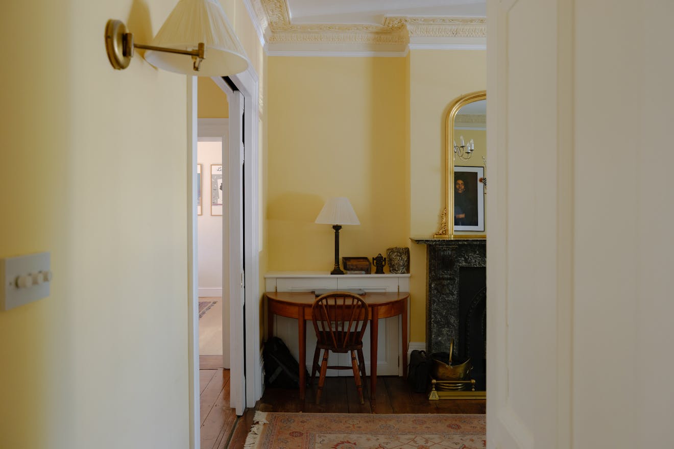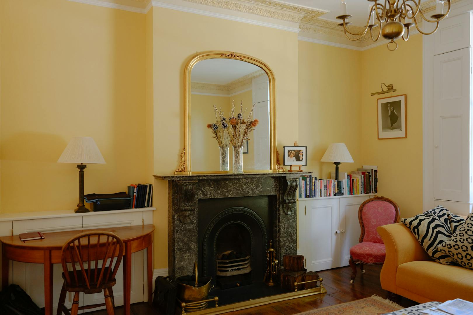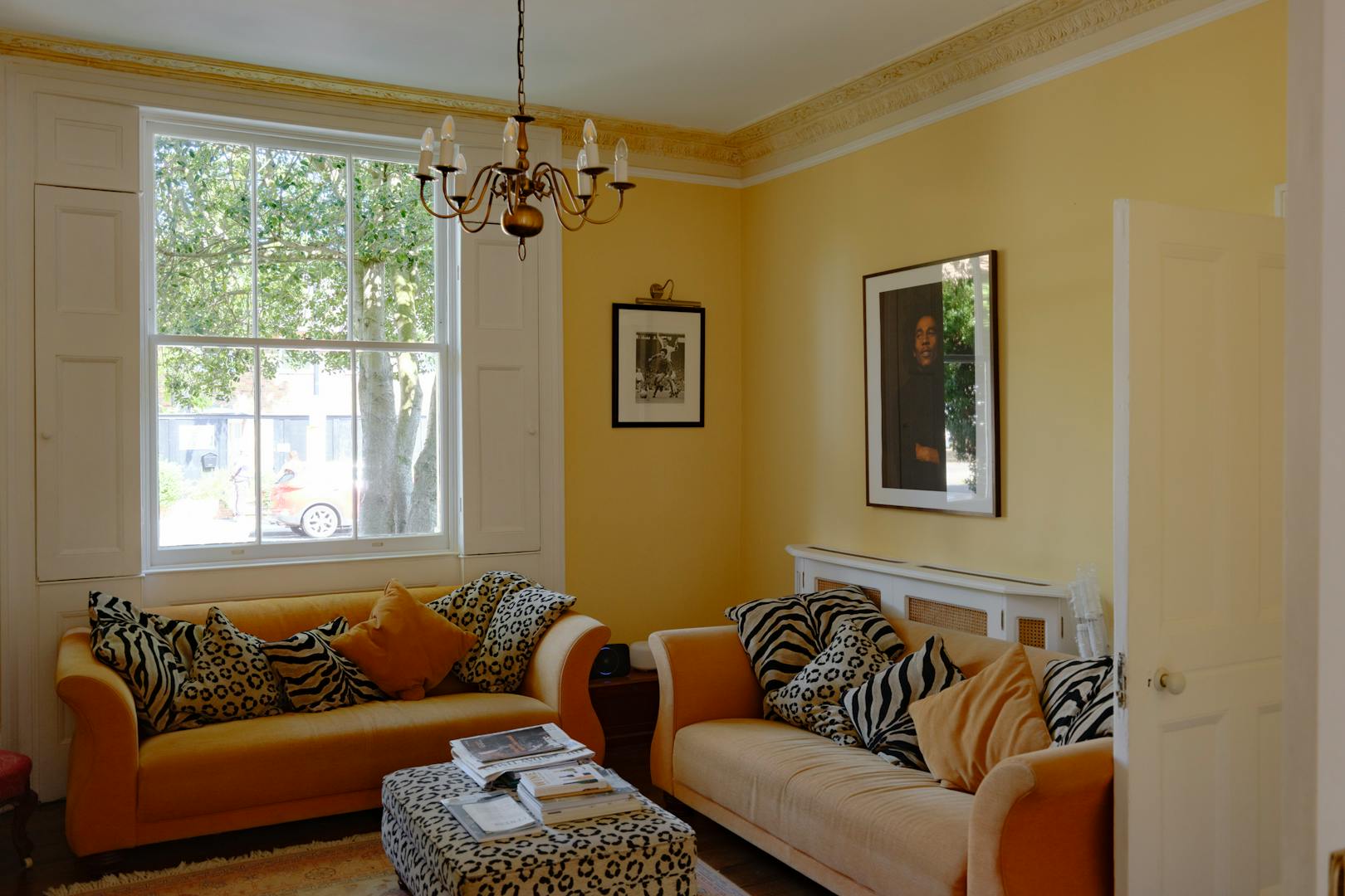Spanning approximately 220 sq m, the house unfolds over three spacious floors. On the ground floor, a wide entrance hall with traditional Victorian tiling leads to a grand double reception room, painted a zesty yellow and divided by pocket doors. Light pours in through large six-over-six sash windows framed by original shutters, while intricate cornicing encircles the ceiling. A substantial black marble fireplace is flanked by built-in cabinetry.