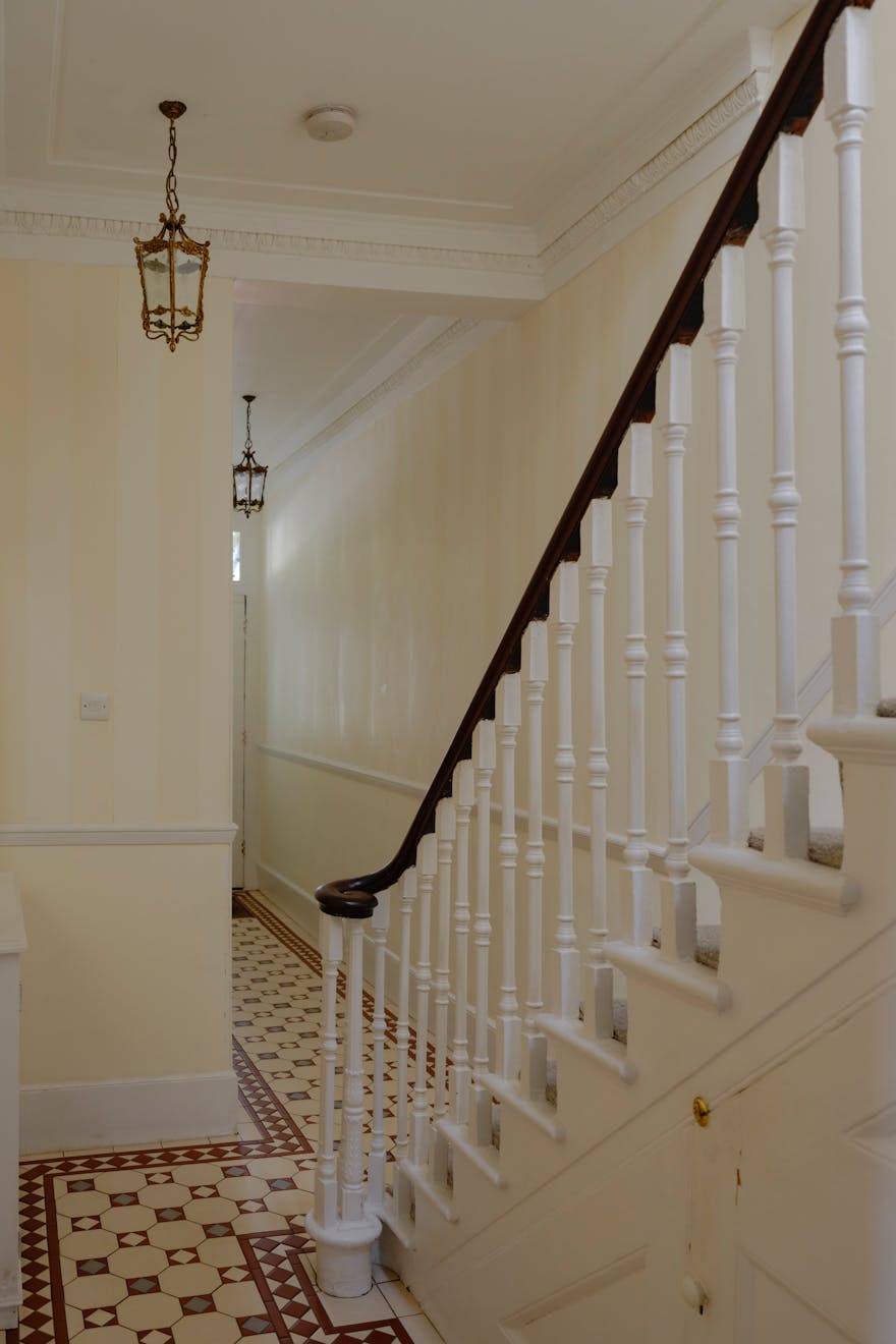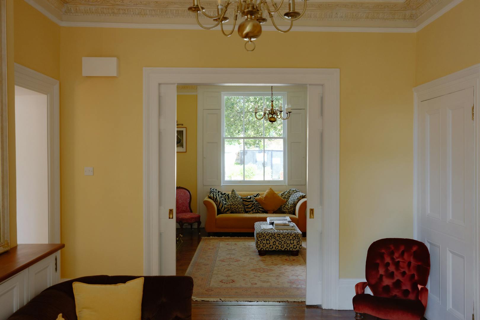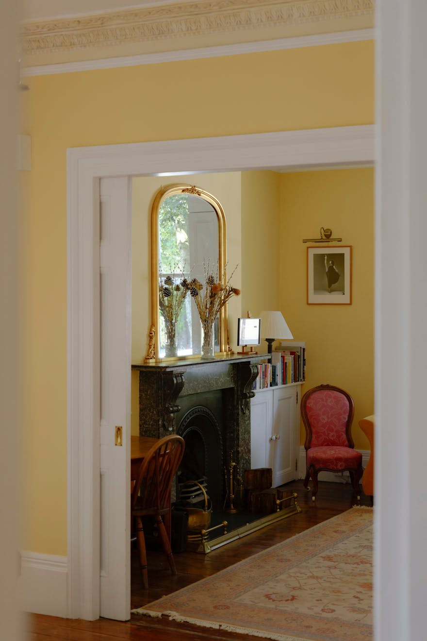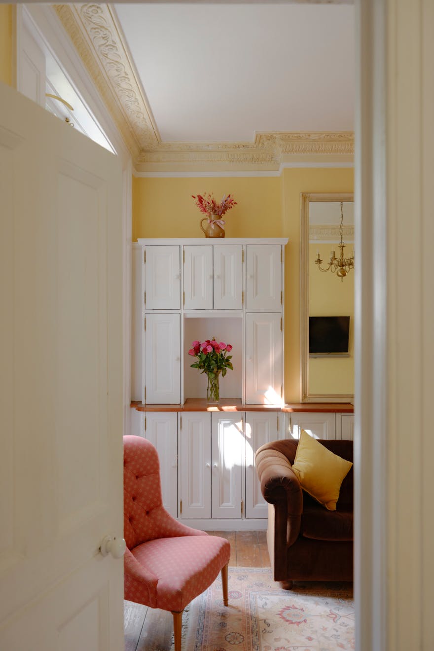 Spanning approximately 220 sq m, the house unfolds over three spacious floors. On the ground floor, a wide entrance hall with traditional Victorian tiling leads to a grand double reception room, painted a zesty yellow and divided by pocket doors. Light pours in through large six-over-six sash windows framed by original shutters, while intricate cornicing encircles the ceiling. A substantial black marble fireplace is flanked by built-in cabinetry.