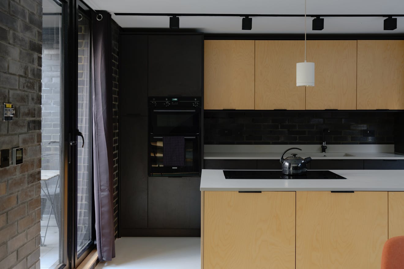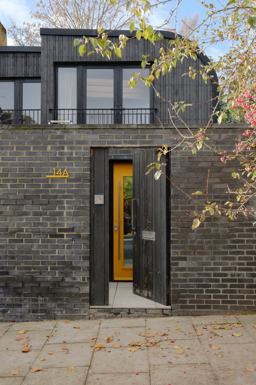 Externally, the home makes a confident statement with its striking façade of black brick and charred larch cladding, standing out elegantly against the streetscape. Beyond the forecourt and front boundary wall, the journey continues into an interior that is equally captivating. Inside, the black brick is complemented by a muted palette of soft greys and birch-faced plywood, creating a cohesive aesthetic that flows throughout the house.
