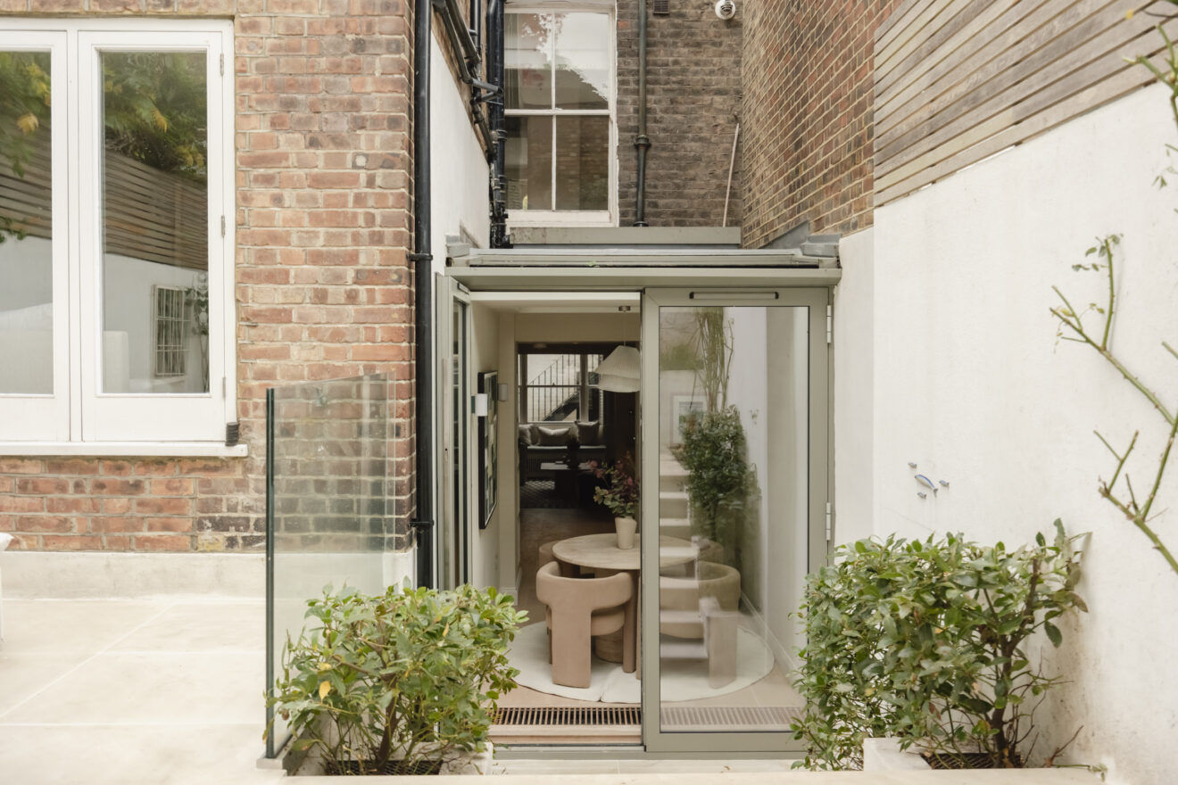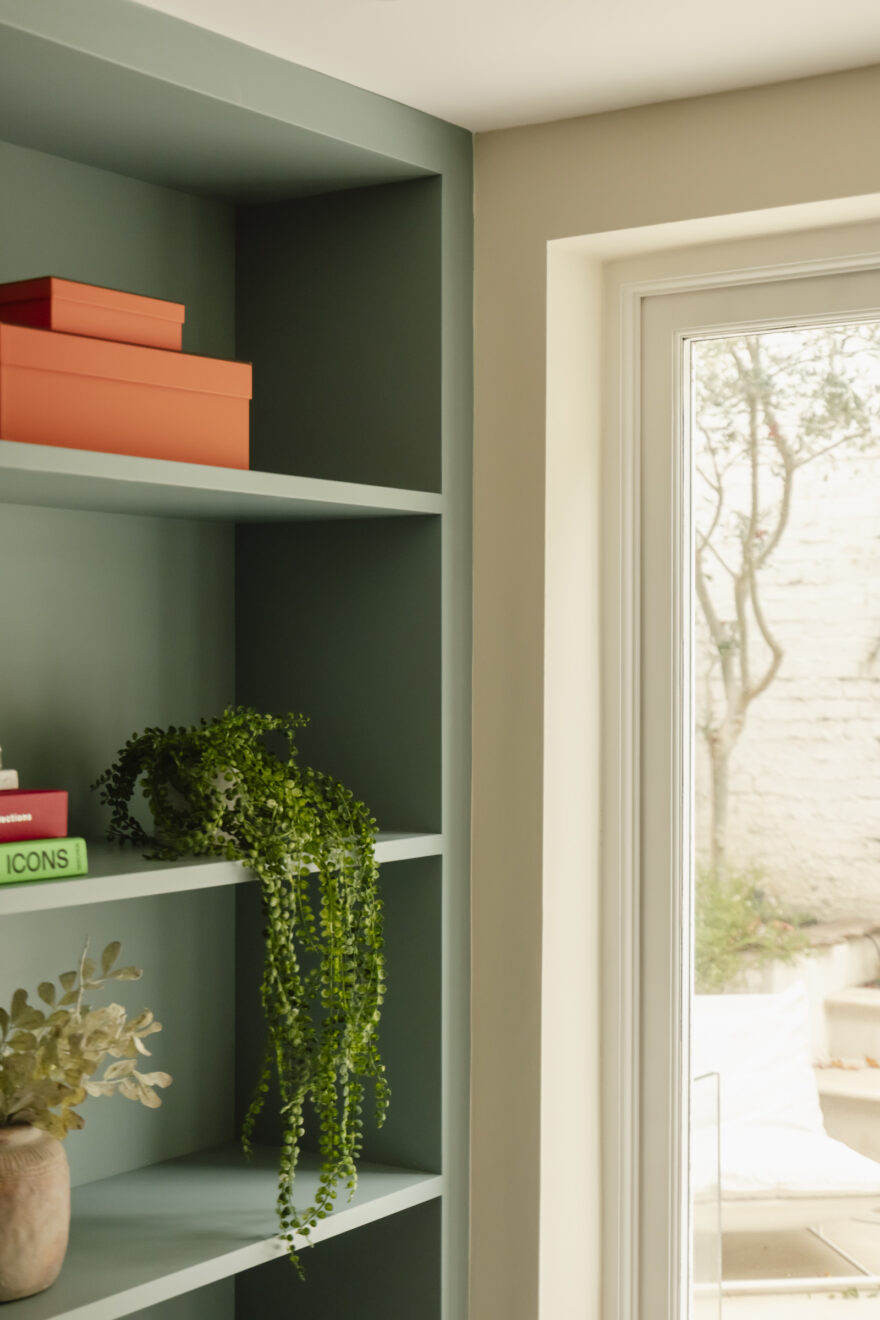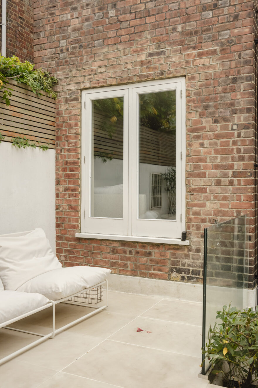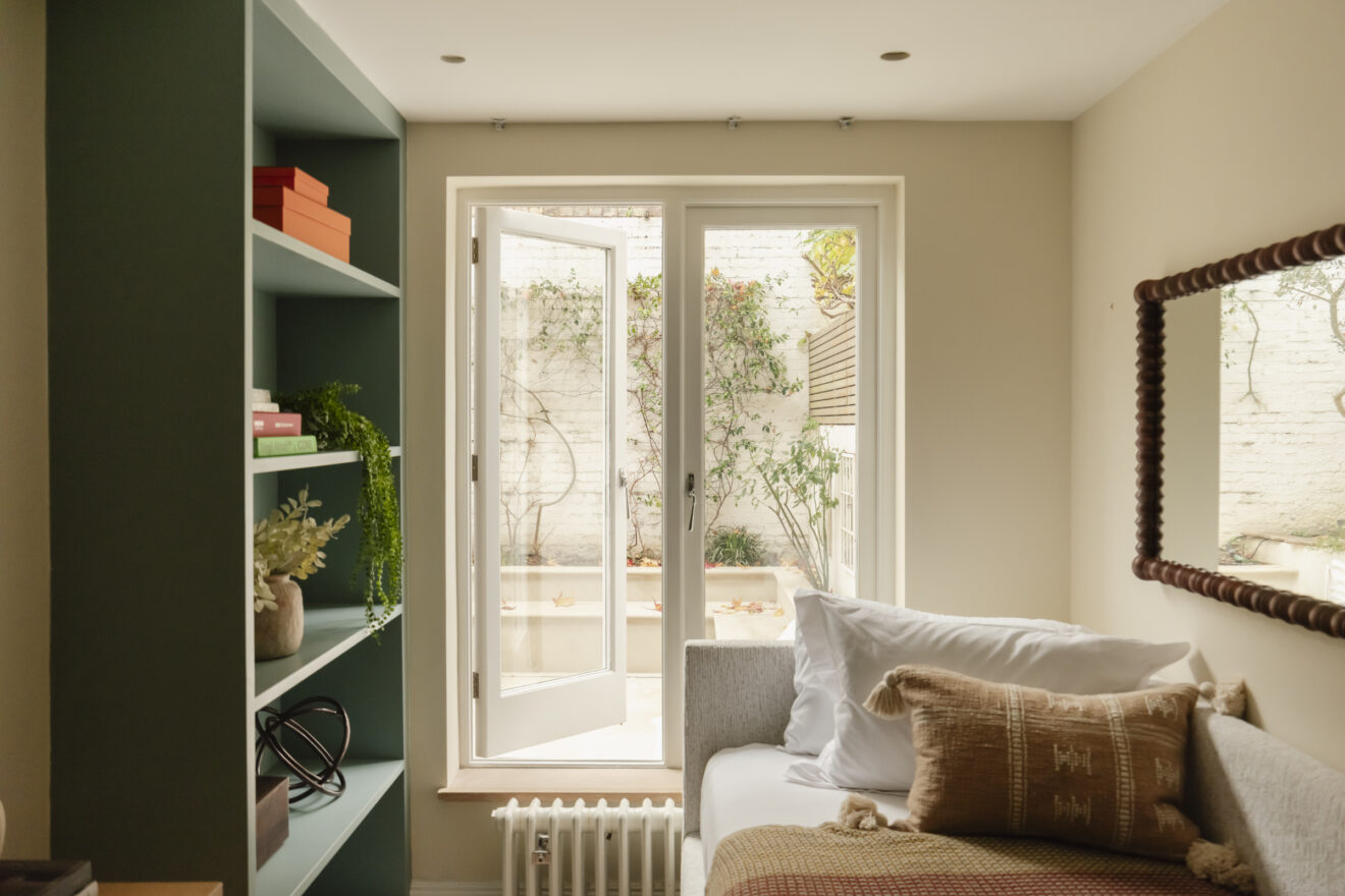 The upper levels are equally considered. Quietly tucked to the rear of the plan, this versatile room is bathed in soft natural light, with windows doors opening directly onto the courtyard garden. A calm, grounded palette is elevated by Farrow & Ball's 'Oval Blue' shelving and woven textures, while the bespoke joinery and thoughtful styling make the space equally suited to work, rest, or retreat. Whether used as a study, guest bedroom, or reading nook, it continues the home’s dialogue of warmth, materiality, and purpose.