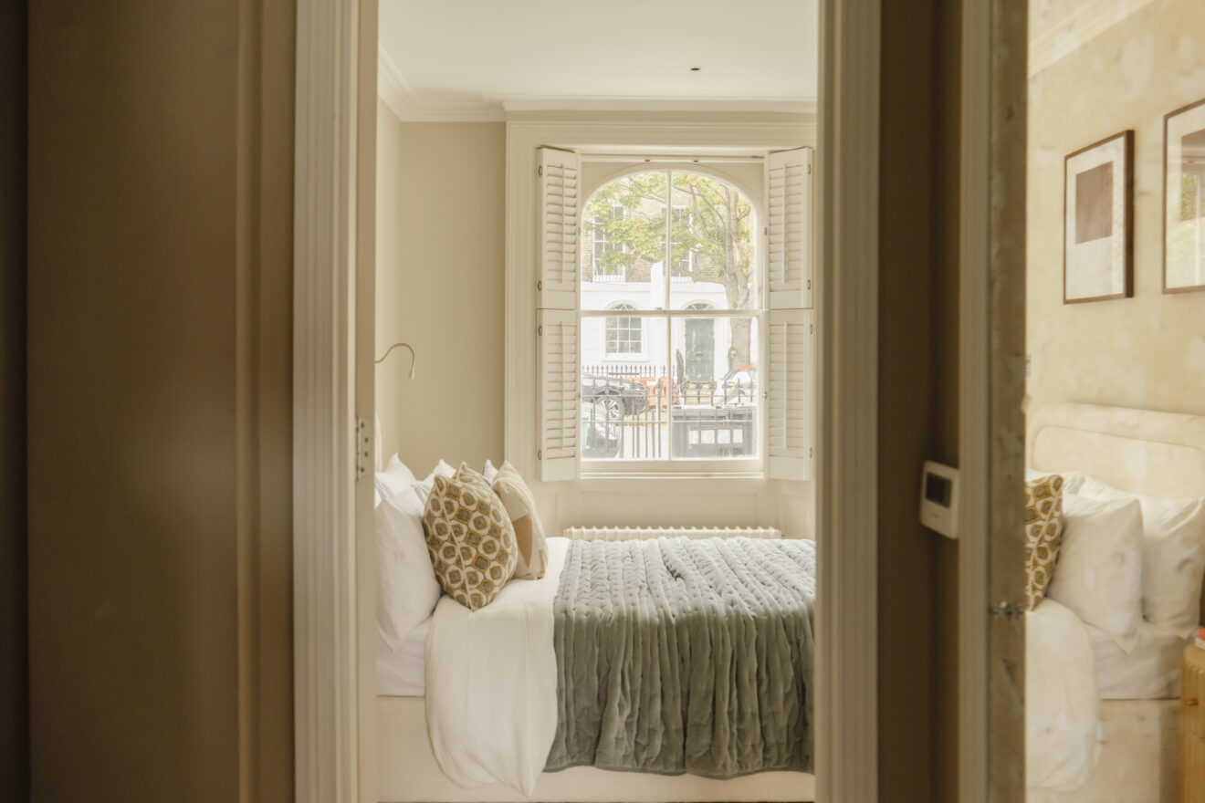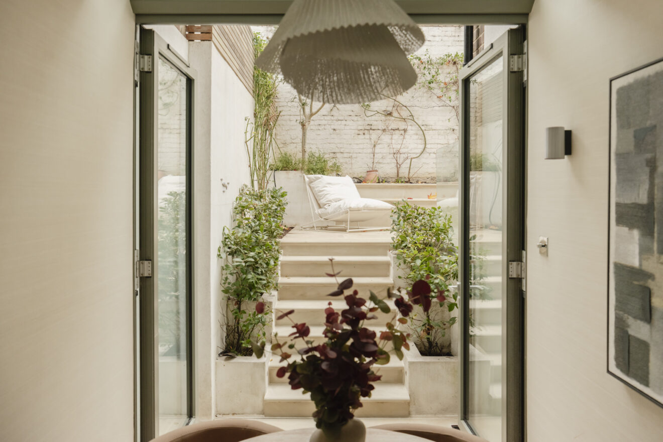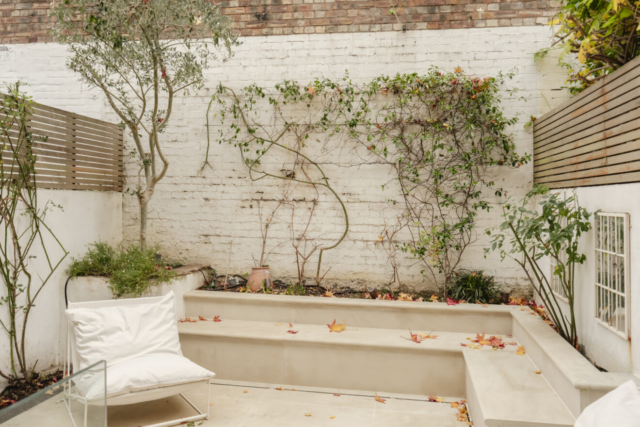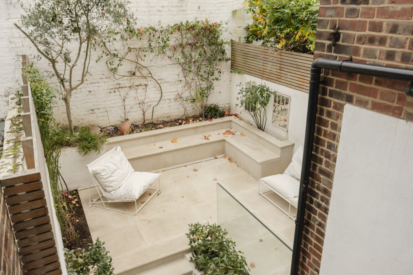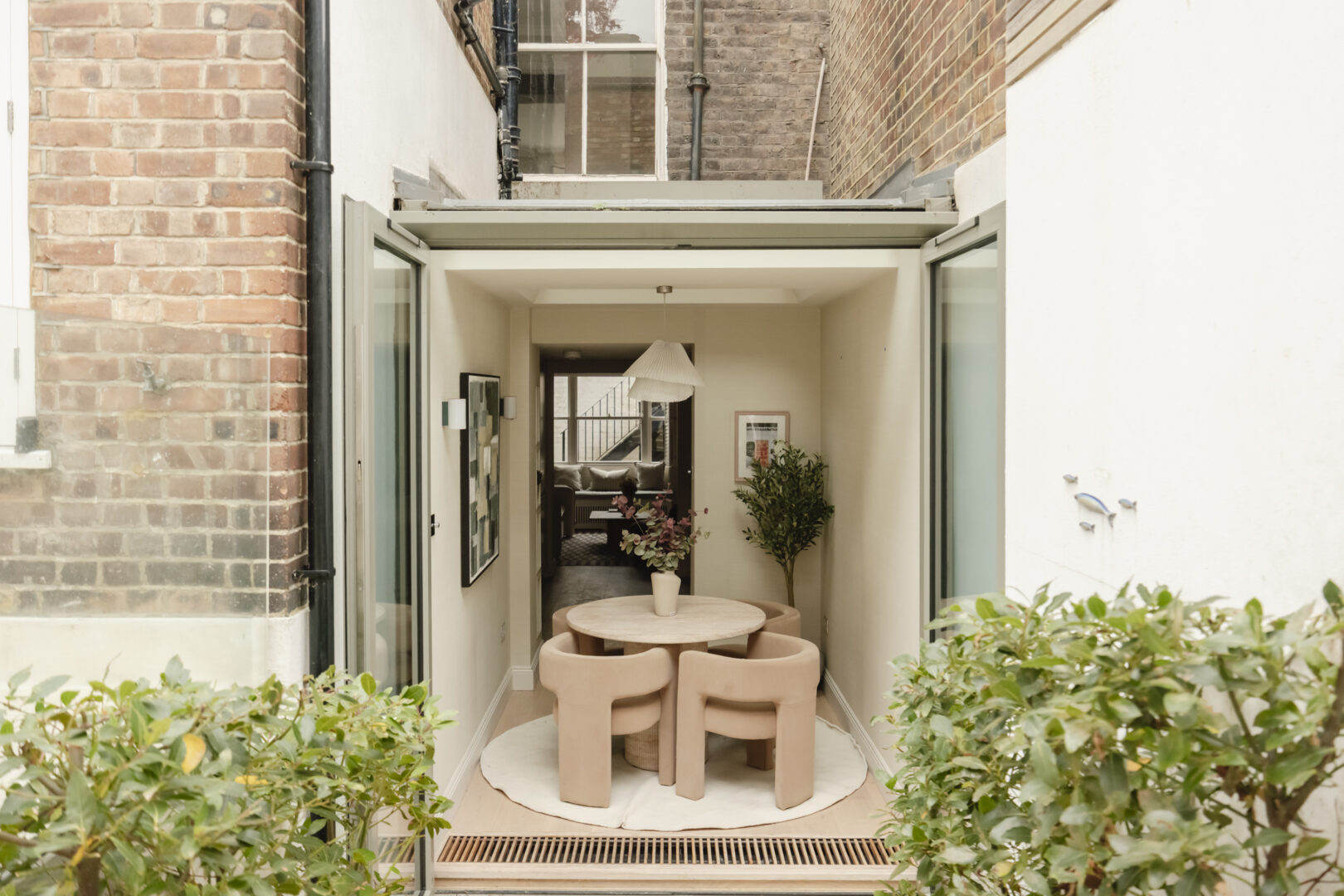The upper levels are equally considered. Quietly tucked to the rear of the plan, this versatile room is bathed in soft natural light, with windows doors opening directly onto the courtyard garden. A calm, grounded palette is elevated by Farrow & Ball's 'Oval Blue' shelving and woven textures, while the bespoke joinery and thoughtful styling make the space equally suited to work, rest, or retreat. Whether used as a study, guest bedroom, or reading nook, it continues the home’s dialogue of warmth, materiality, and purpose.