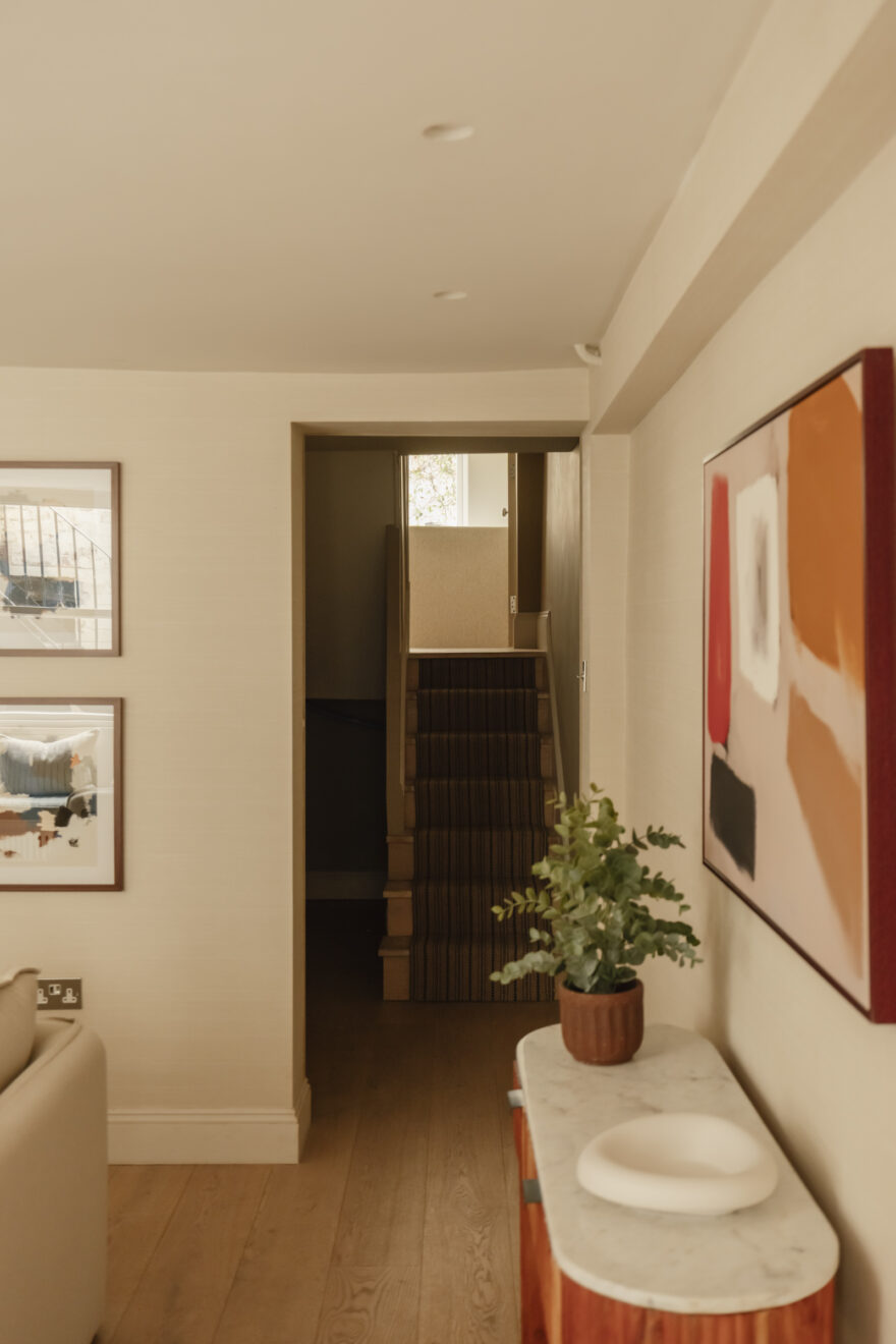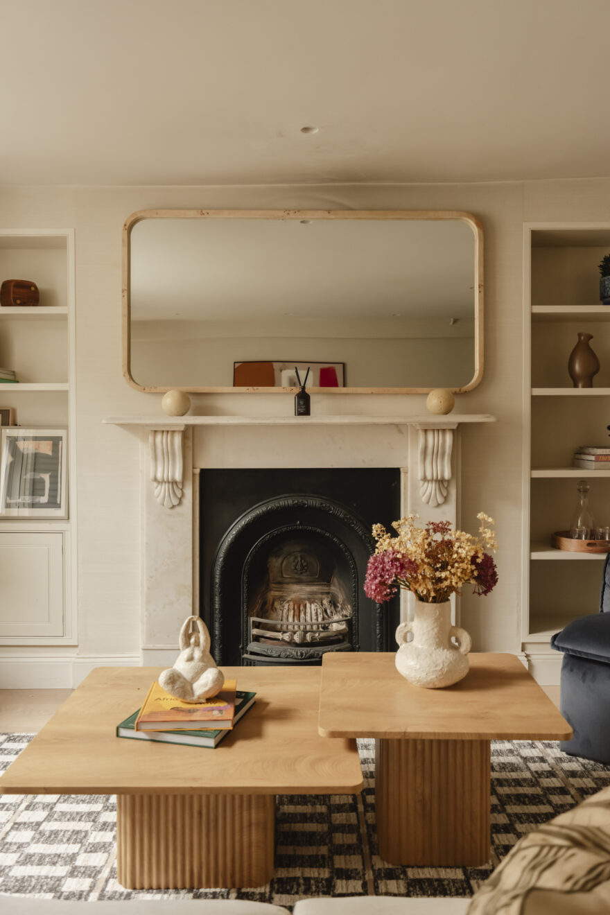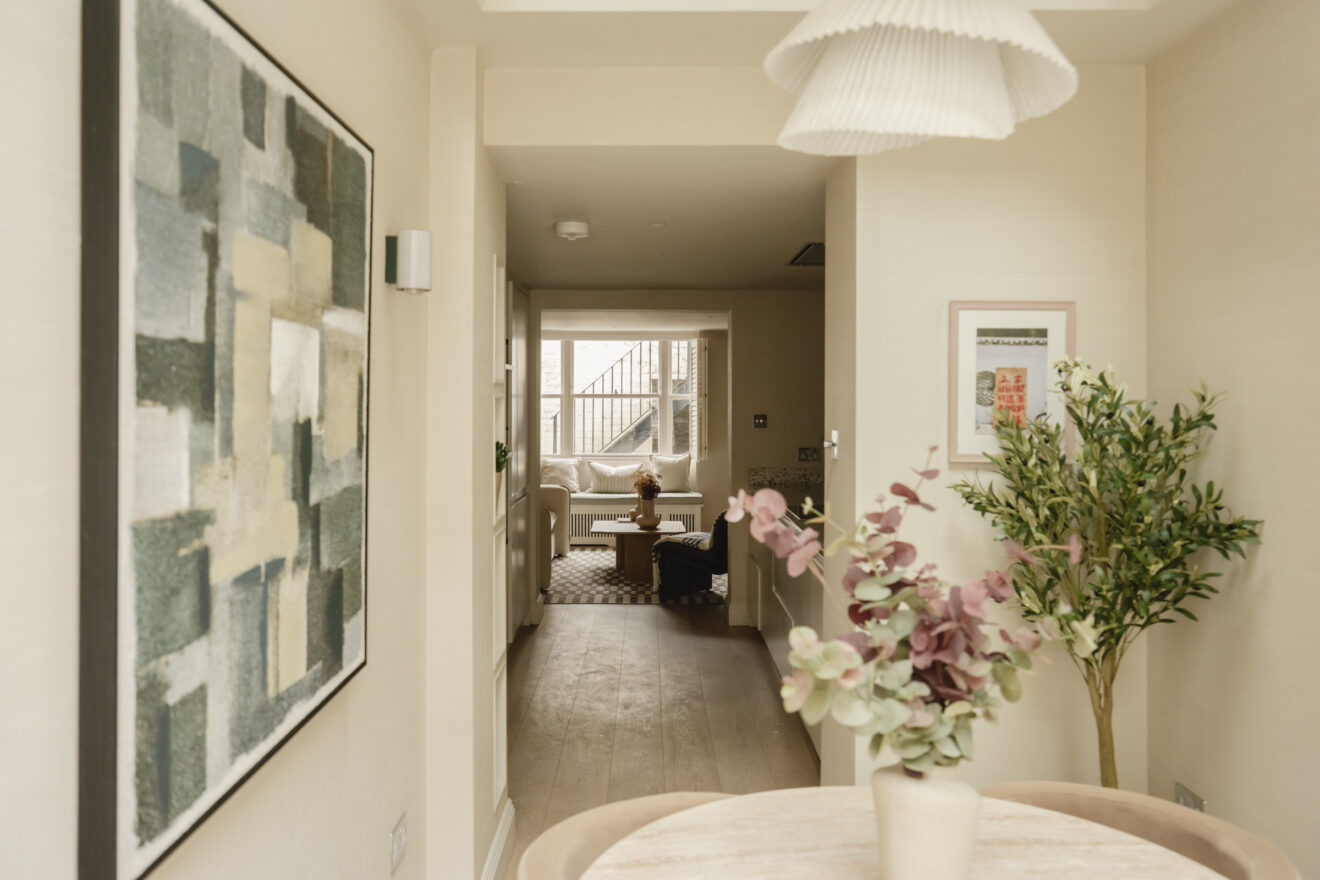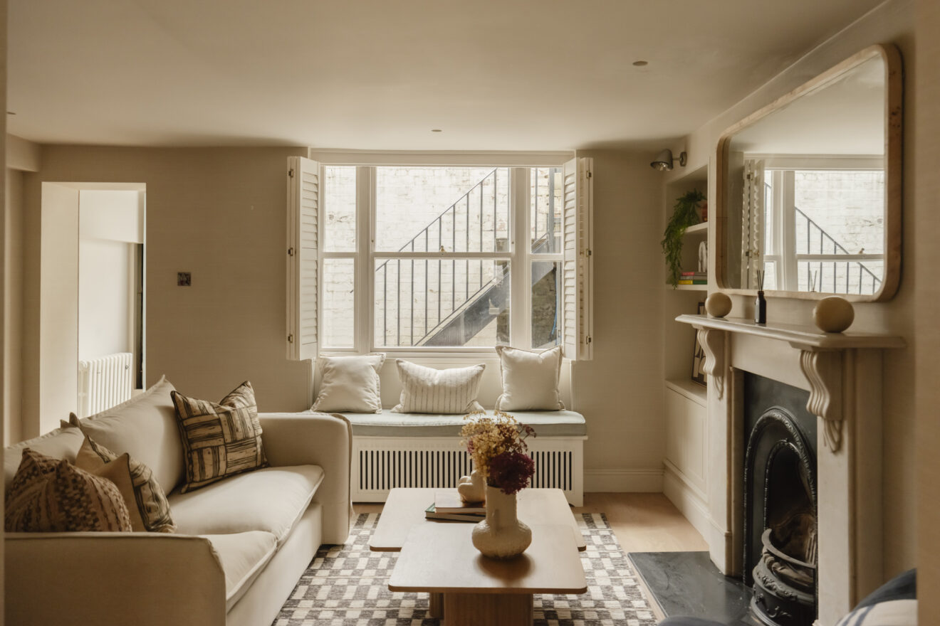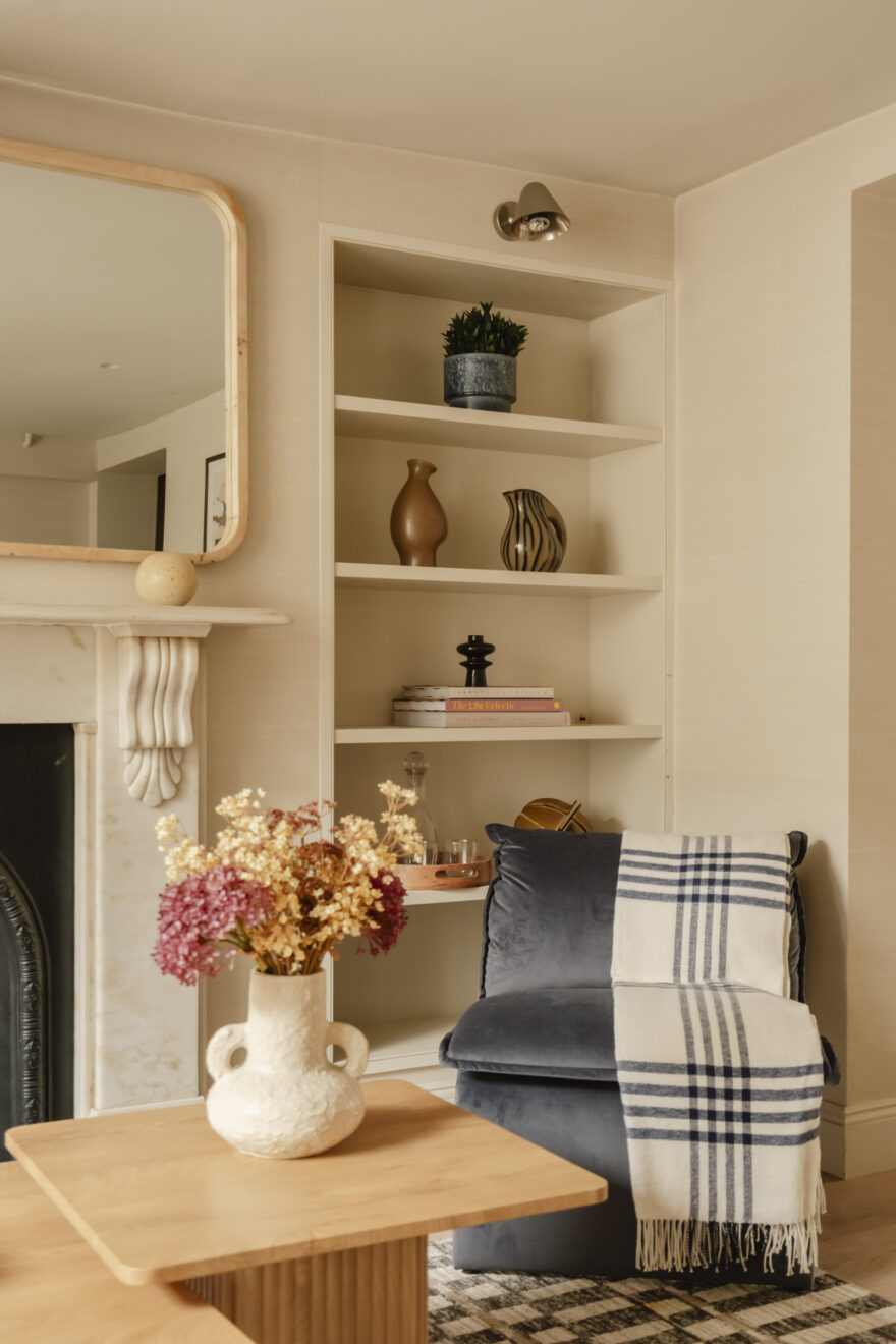 Entry is via a private front door, leading into a wide, light-filled reception space with a built-in seating area by the sash windows, that sets the tone for the rest of the interior. This living space balances classic architectural features with a refined, contemporary warmth. The original fireplace, with its elegant surround, anchors the room, while open shelving and tactile finishes create a curated yet relaxed feel.