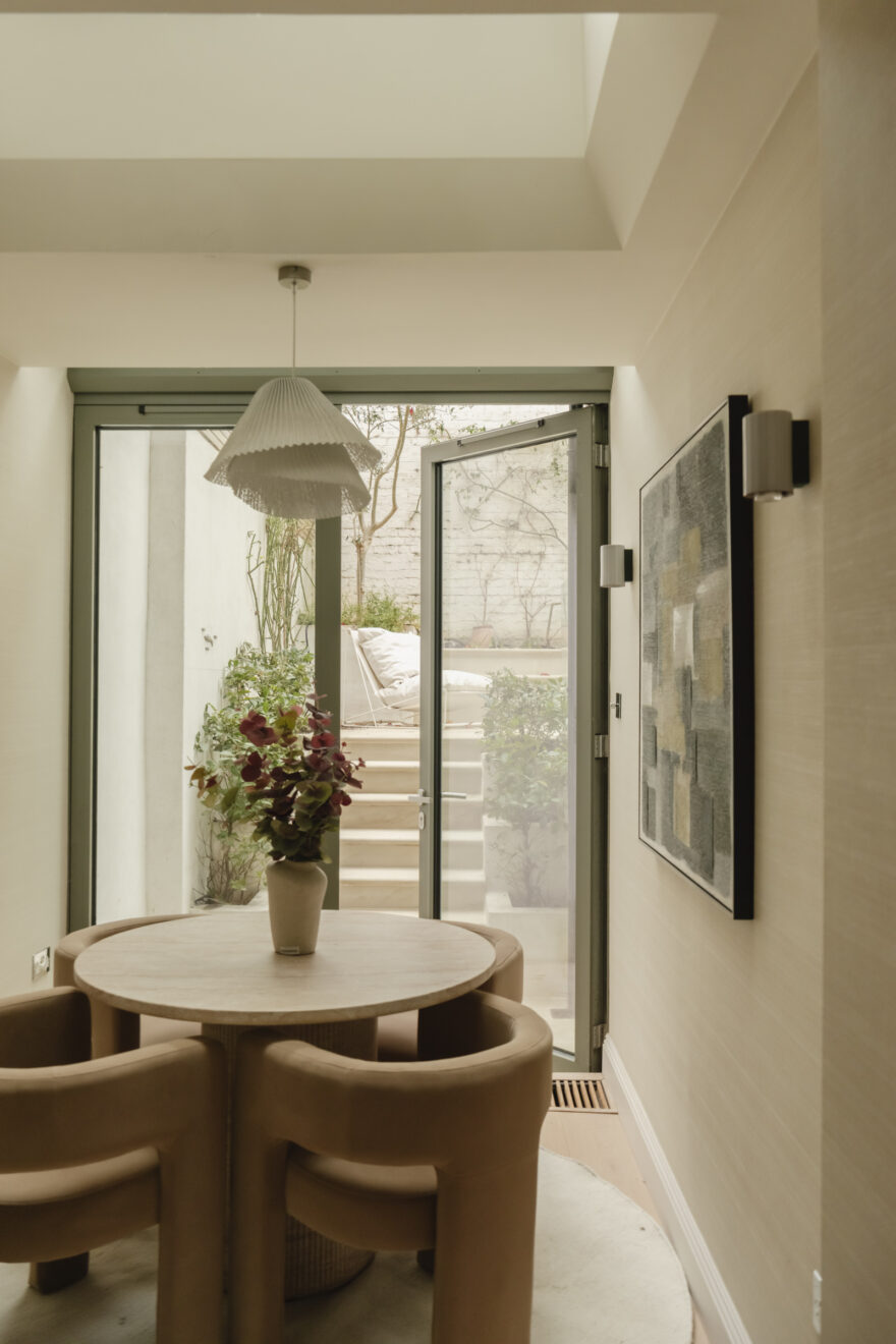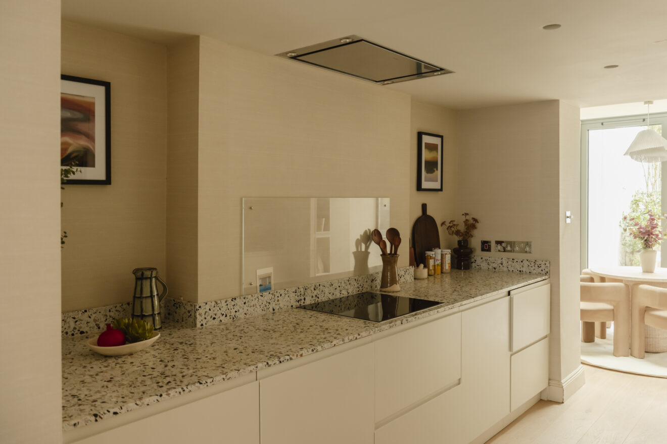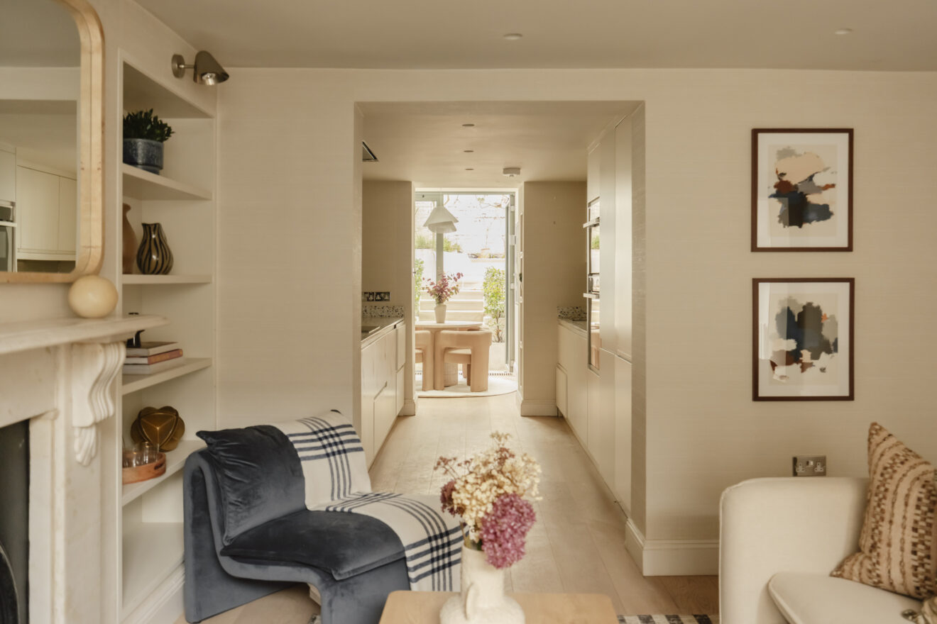 Beyond lies a sleek, handle-less kitchen with integrated appliances, transitioning into an impressive rear extension, a dining space defined by its glass ceiling and direct connection to the landscaped garden beyond. This refined addition effortlessly bridges indoor and outdoor living. A palette of muted neutrals and soft curves flows naturally from the calm sophistication of the adjacent living area, where classic features meet contemporary styling.