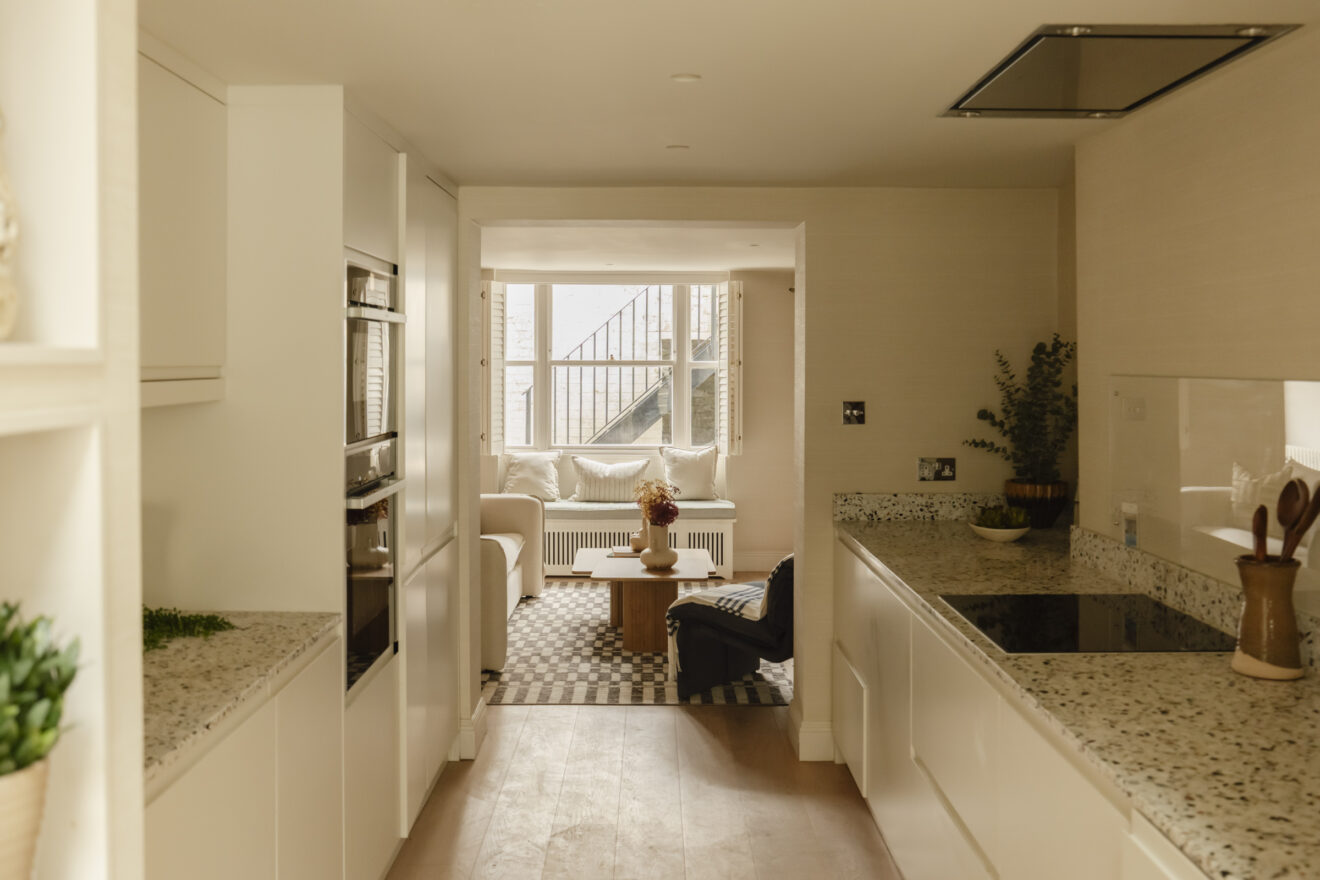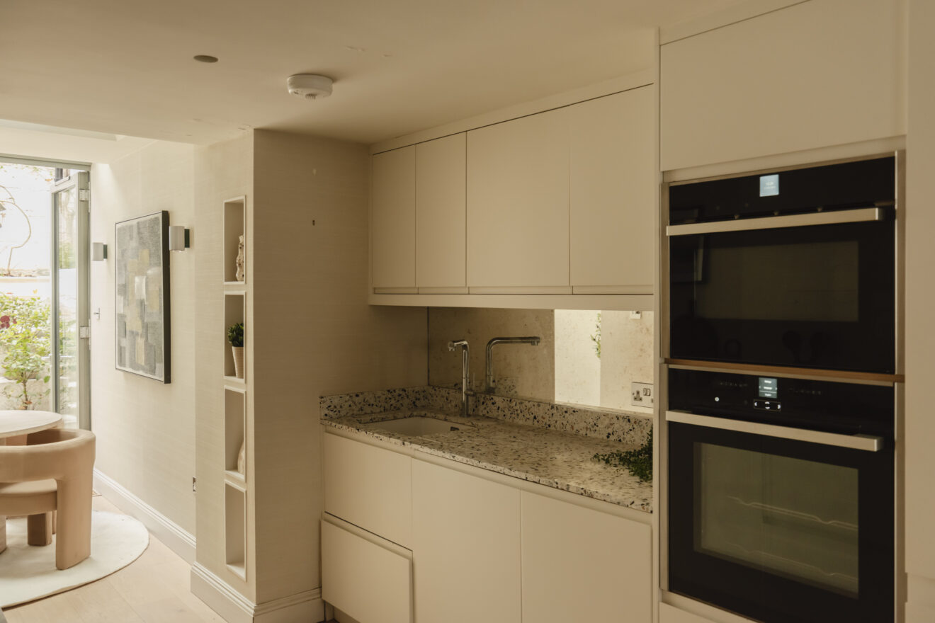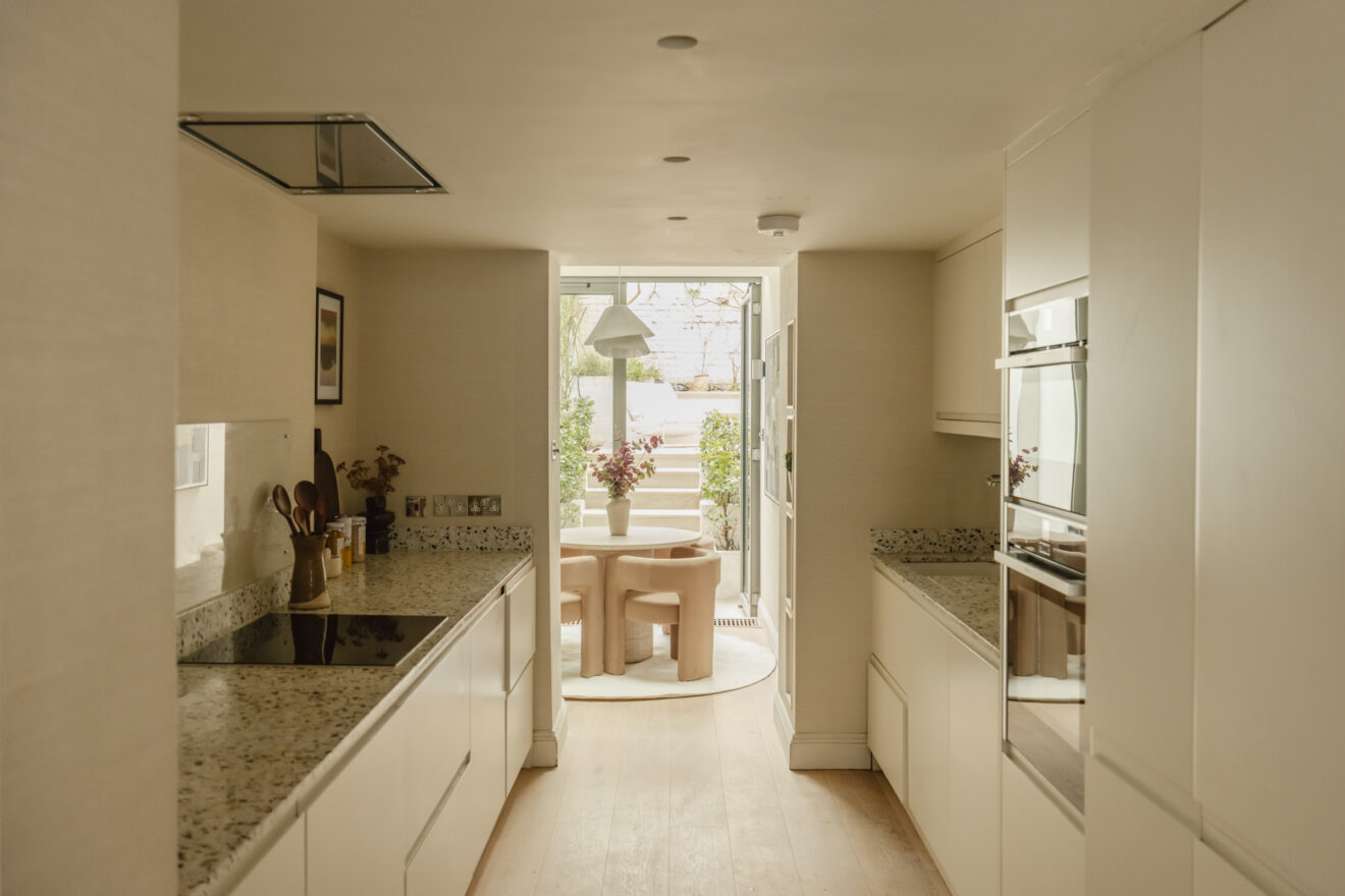 Beyond lies a sleek, handle-less kitchen with integrated appliances, transitioning into an impressive rear extension, a dining space defined by its glass ceiling and direct connection to the landscaped garden beyond. This refined addition effortlessly bridges indoor and outdoor living. A palette of muted neutrals and soft curves flows naturally from the calm sophistication of the adjacent living area, where classic features meet contemporary styling.