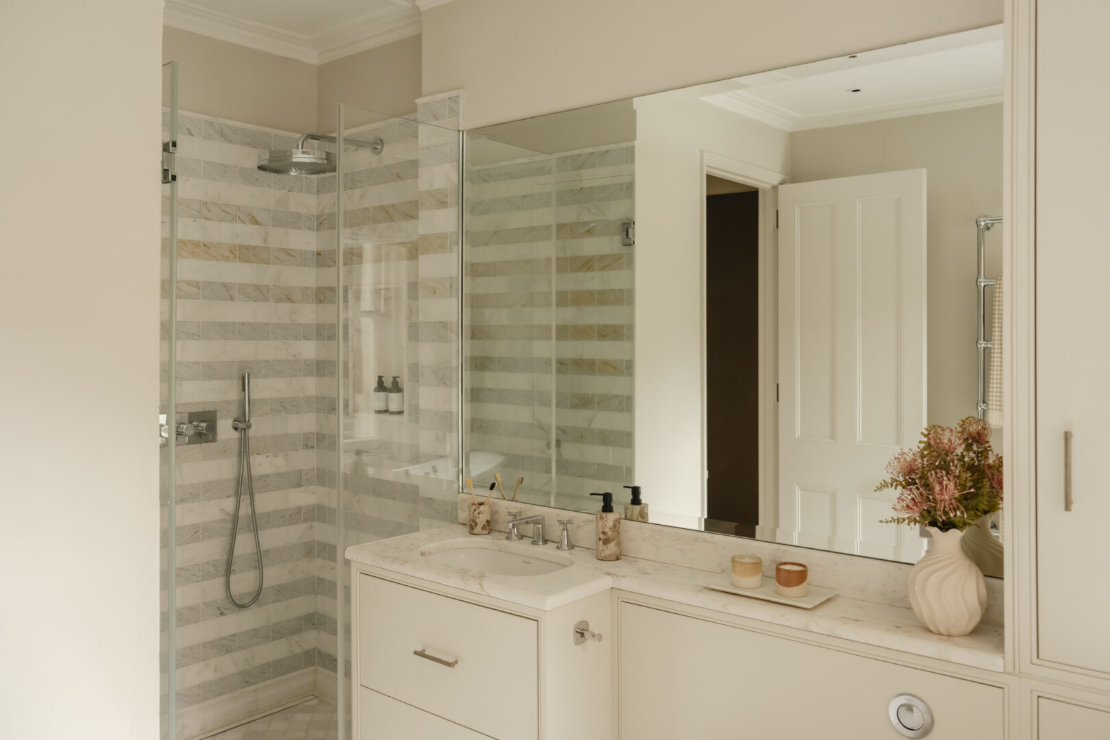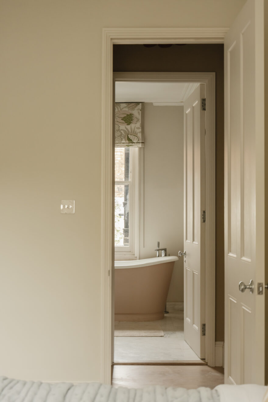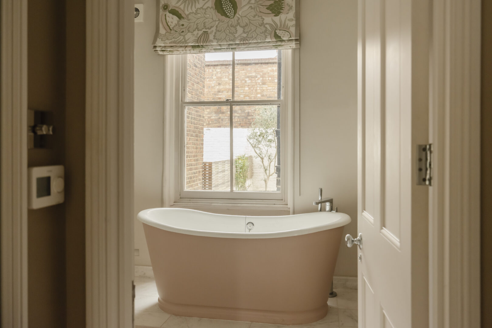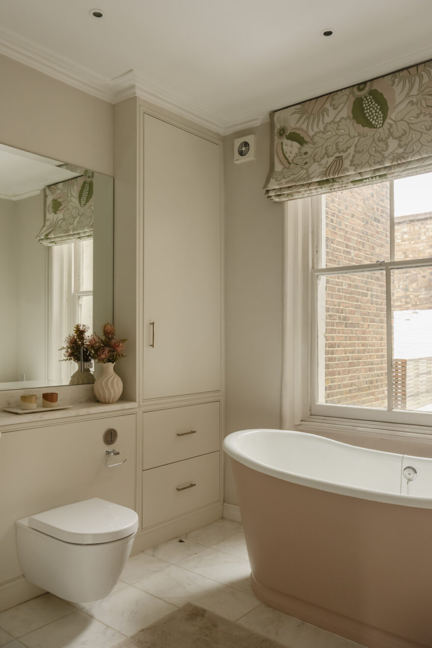 On the raised ground floor, the principal bedroom spans the full width of the house, its walls lined with bespoke cabinetry. At the rear, a serene bathroom pairs soft neutrals with natural stone tiles for a timeless, elevated feel. Thoughtful details, from the marble surfaces to the blush-toned freestanding bath.