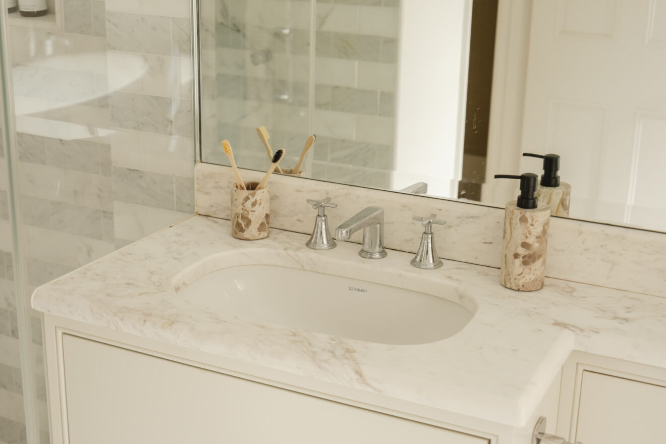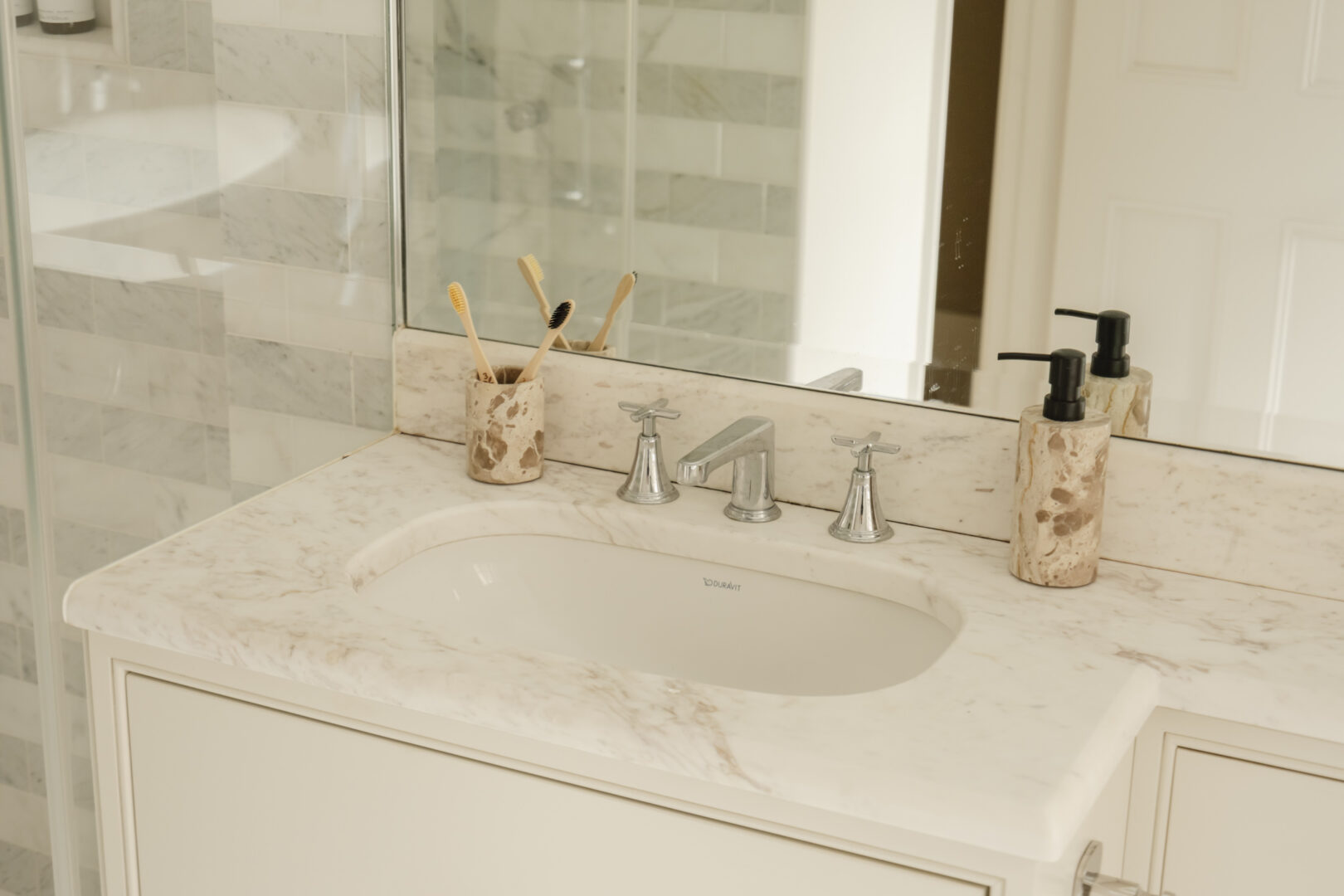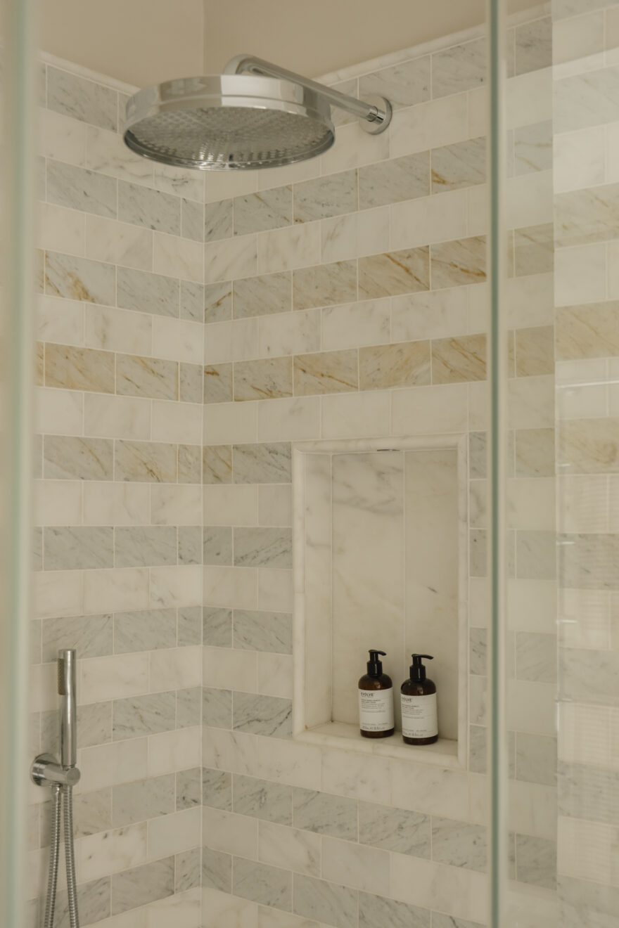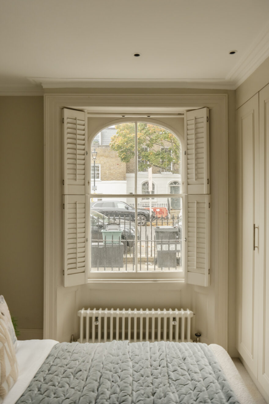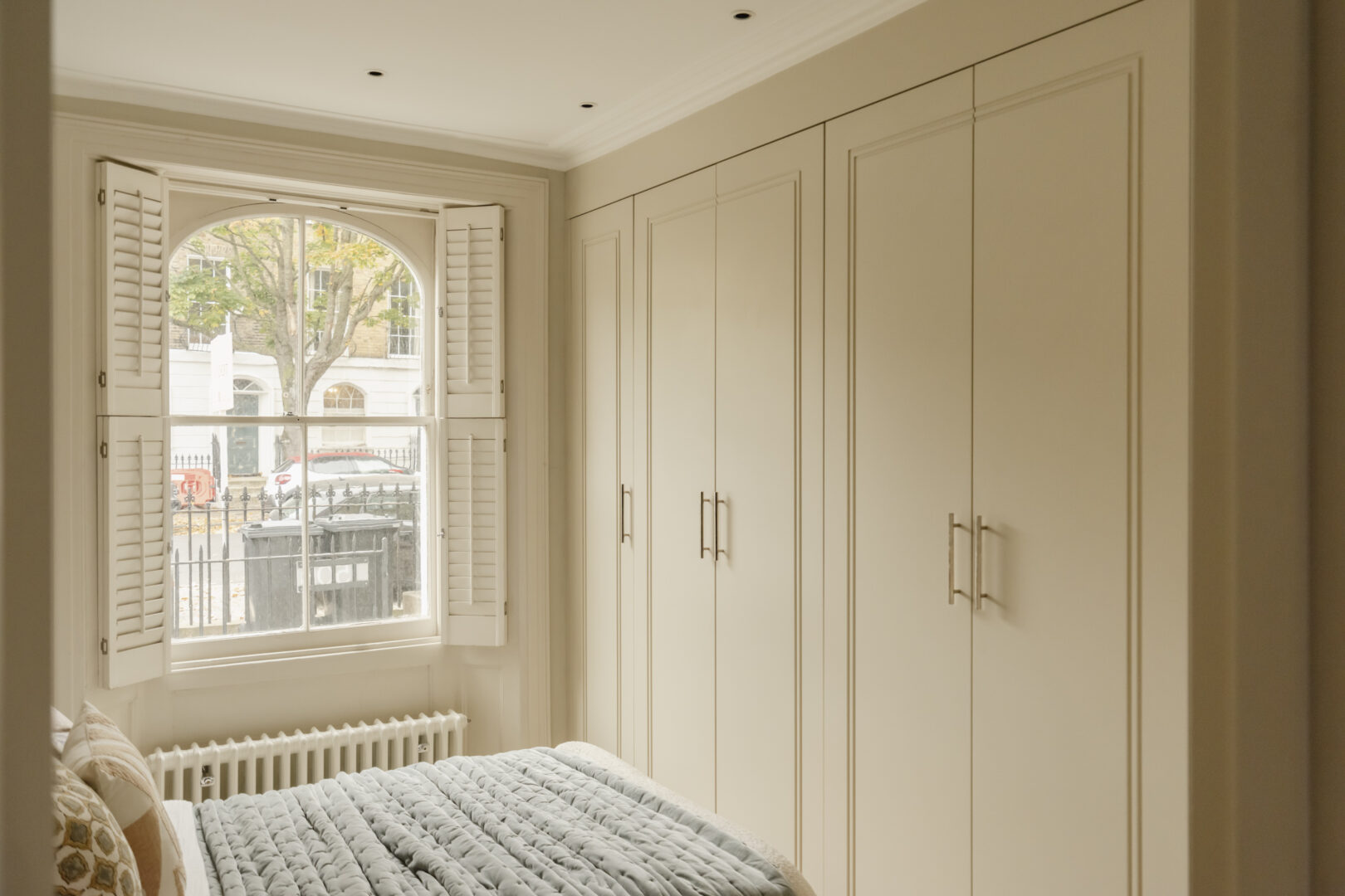 On the raised ground floor, the principal bedroom spans the full width of the house, its walls lined with bespoke cabinetry. At the rear, a serene bathroom pairs soft neutrals with natural stone tiles for a timeless, elevated feel. Thoughtful details, from the marble surfaces to the blush-toned freestanding bath.