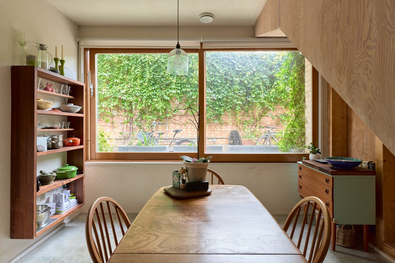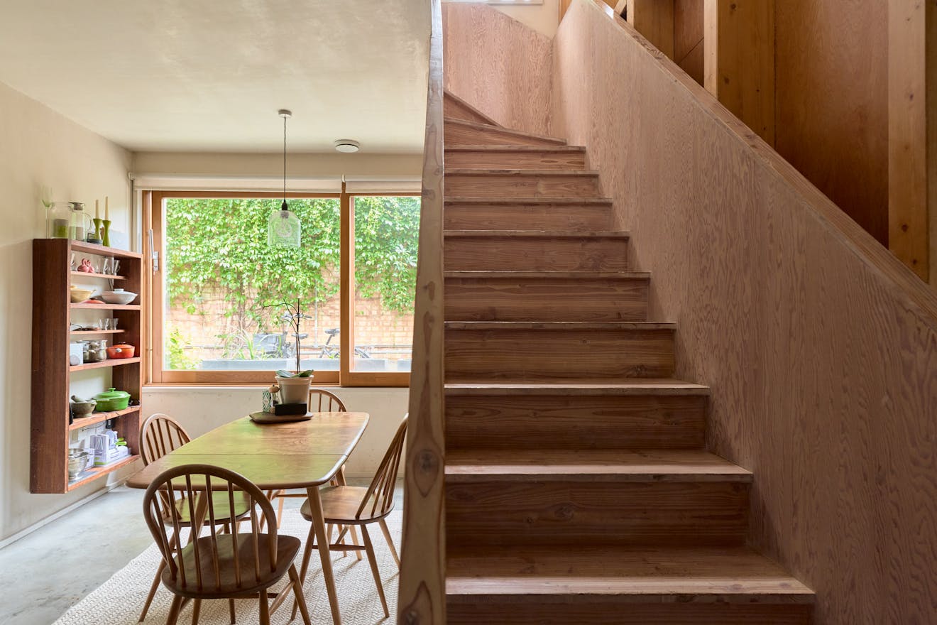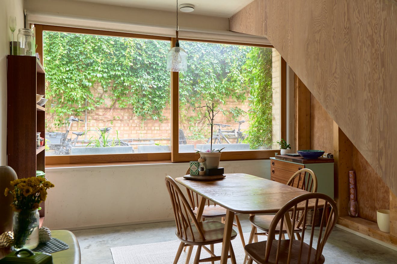 Tucked away at the end of a private path in Stoke Newington, the house is constructed from timber and brick, chosen to sit sensitively within the natural surroundings. It follows an inverted layout, with the main entrance on the upper level. Inside, the space feels both generous and serene, with glazing on three walls and a skylight drawing in natural light. The upper floor is currently arranged as two reception areas, divided by a central staircase and timber supports. A wood-burning stove and bespoke joinery create a warm, inviting atmosphere.