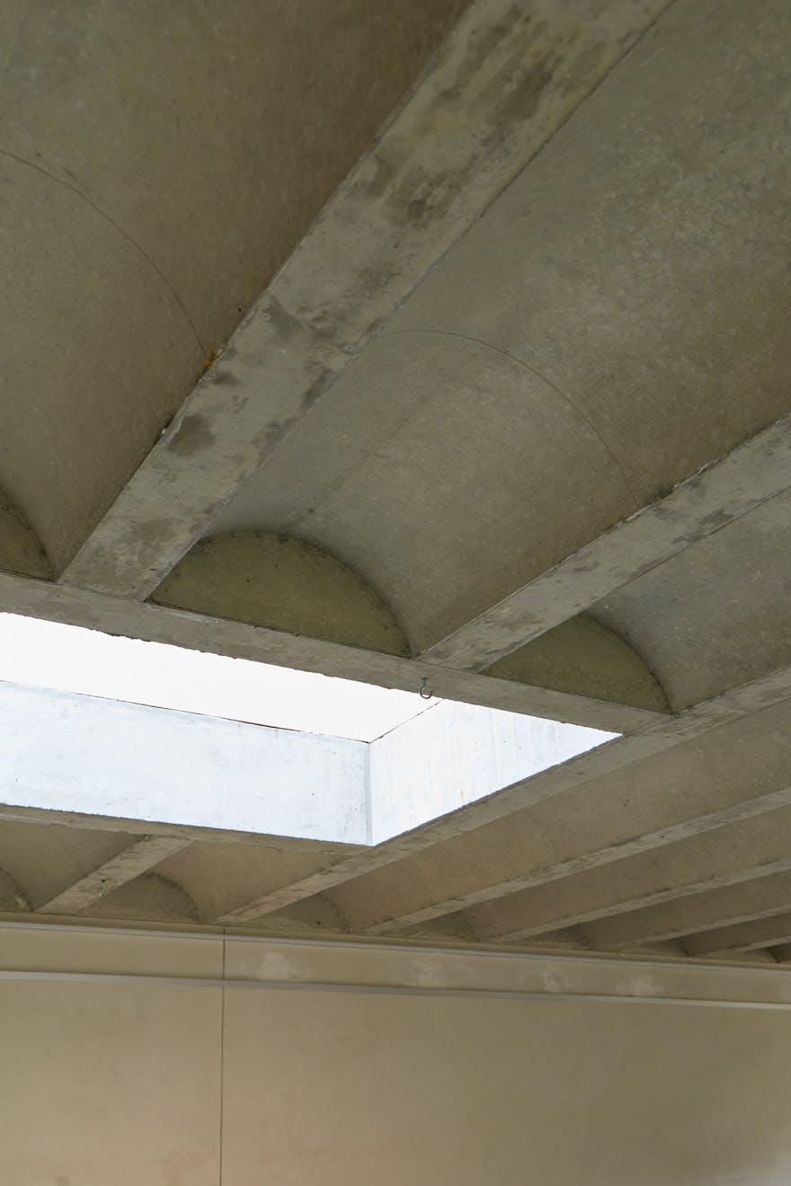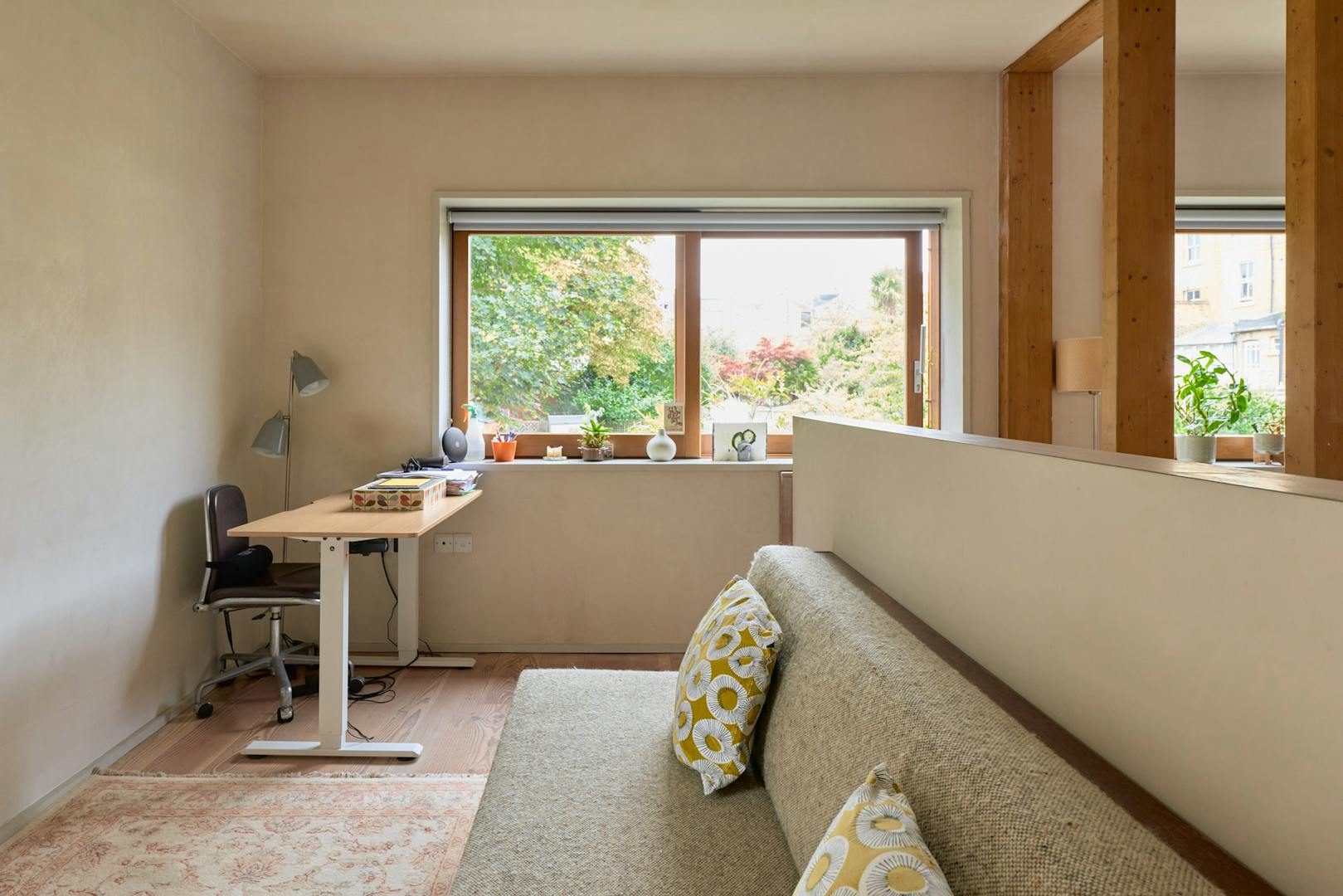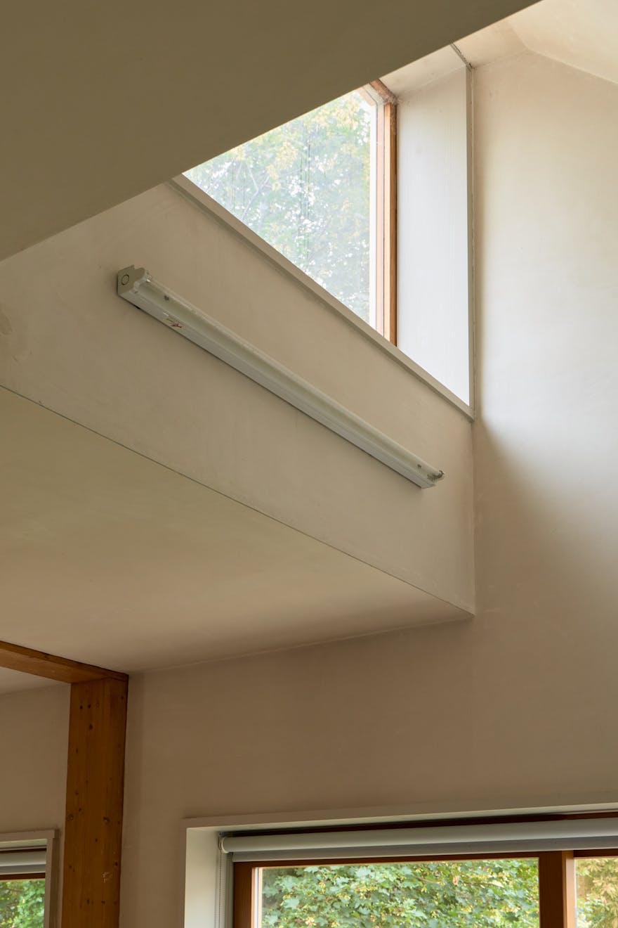 Tucked away at the end of a private path in Stoke Newington, the house is constructed from timber and brick, chosen to sit sensitively within the natural surroundings. It follows an inverted layout, with the main entrance on the upper level. Inside, the space feels both generous and serene, with glazing on three walls and a skylight drawing in natural light. The upper floor is currently arranged as two reception areas, divided by a central staircase and timber supports. A wood-burning stove and bespoke joinery create a warm, inviting atmosphere.
