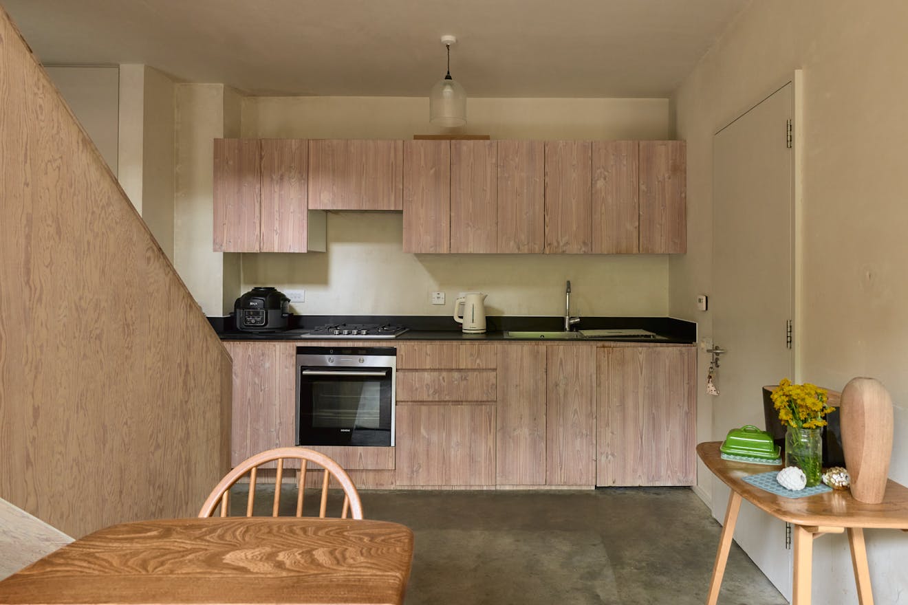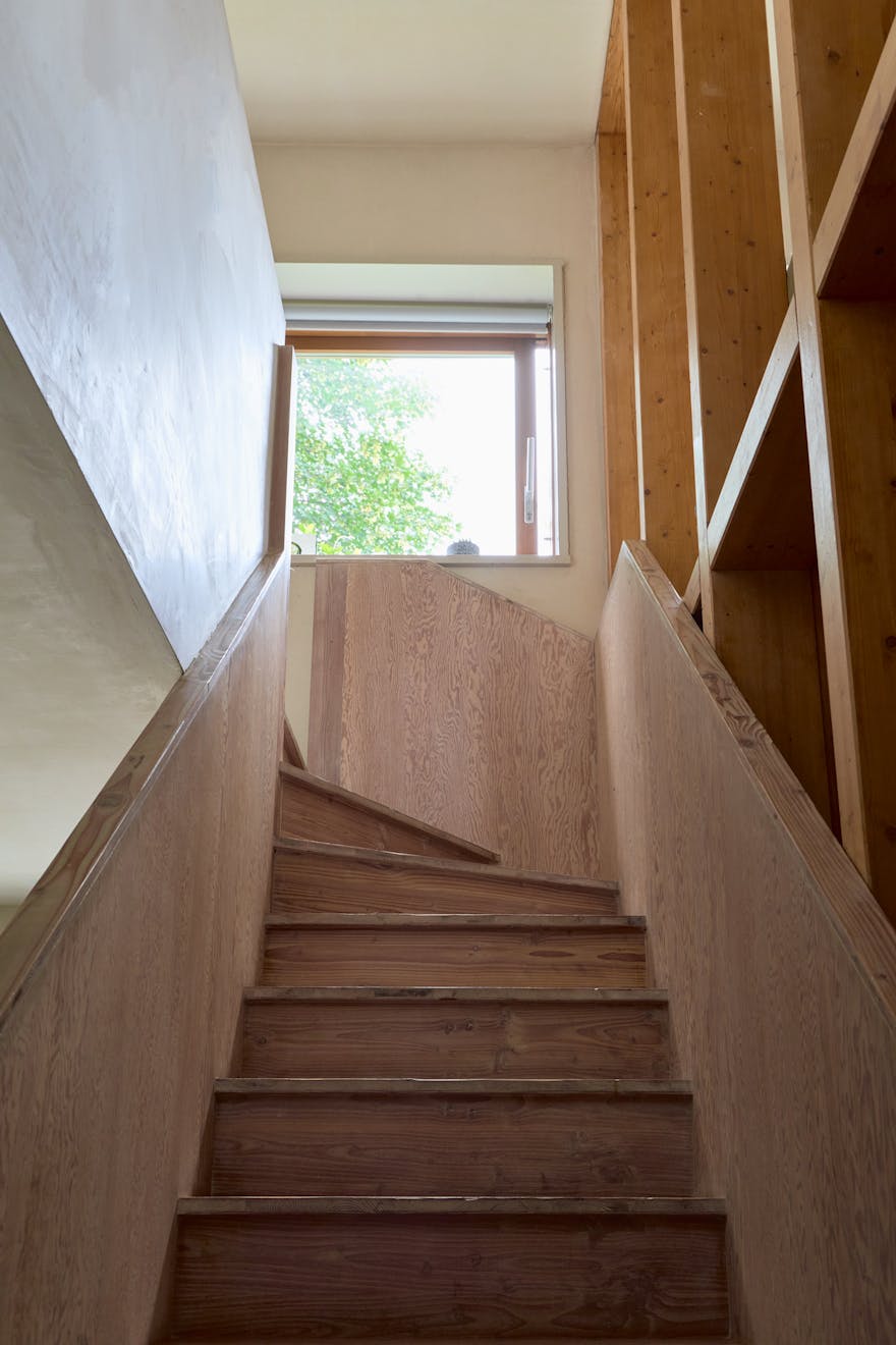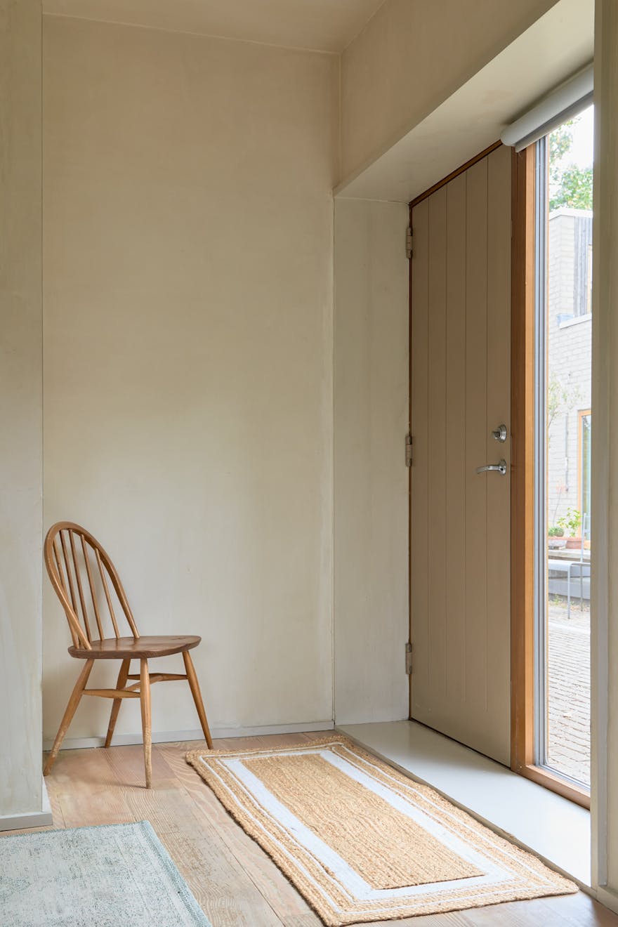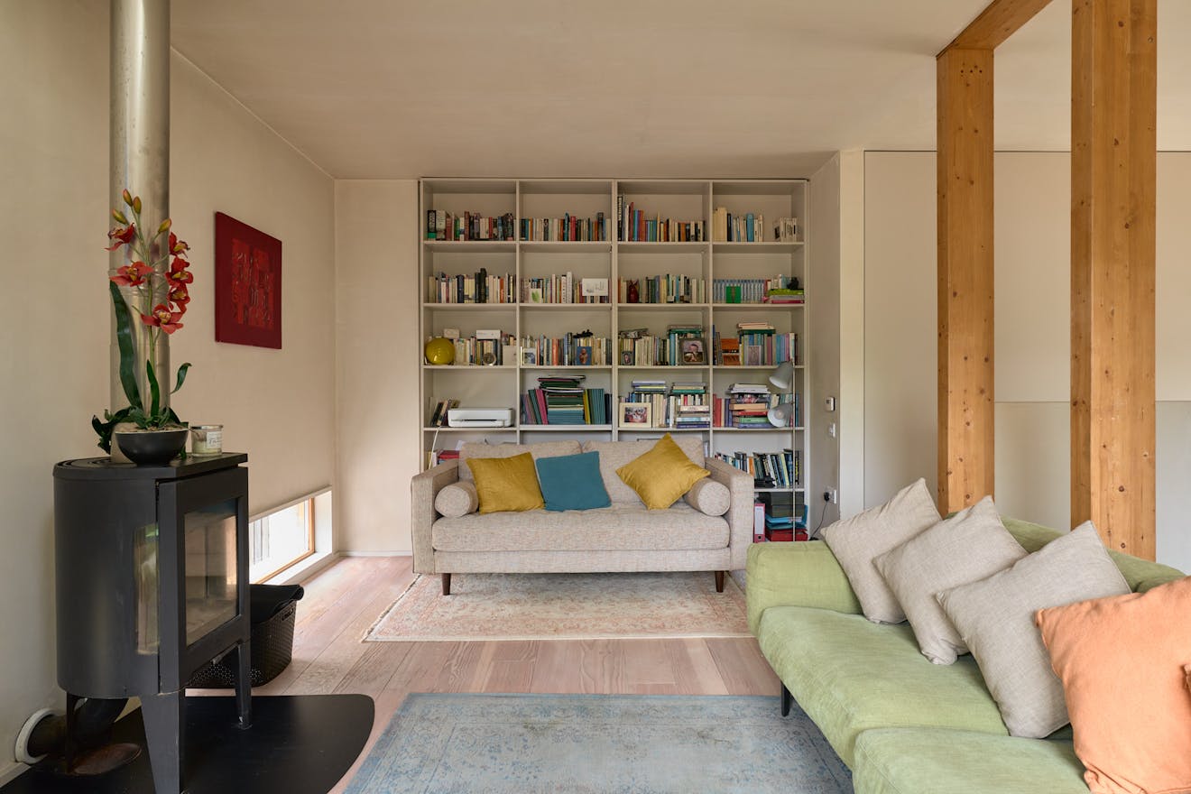 A door leads directly from the house into a large communal room that can be reserved for gatherings, exhibitions, or creative projects. Residents also benefit from shared amenities including a laundry room, workshop and shower room. Outside there is a communal greenhouse and beds for growing fruit and vegetables.