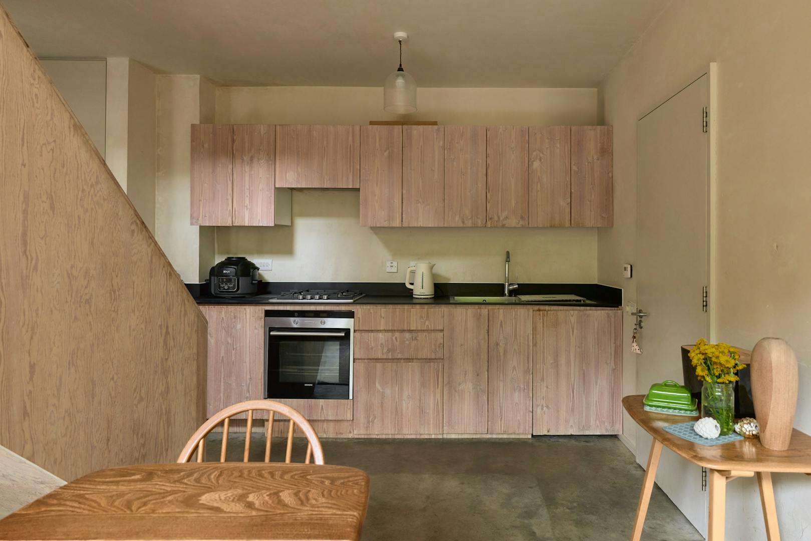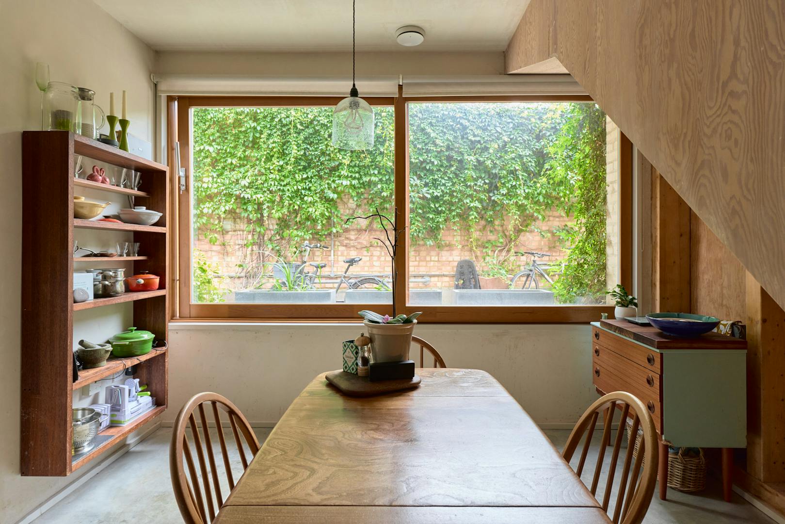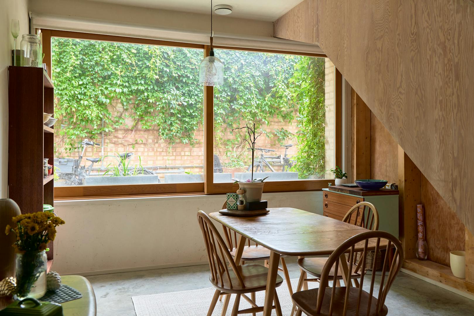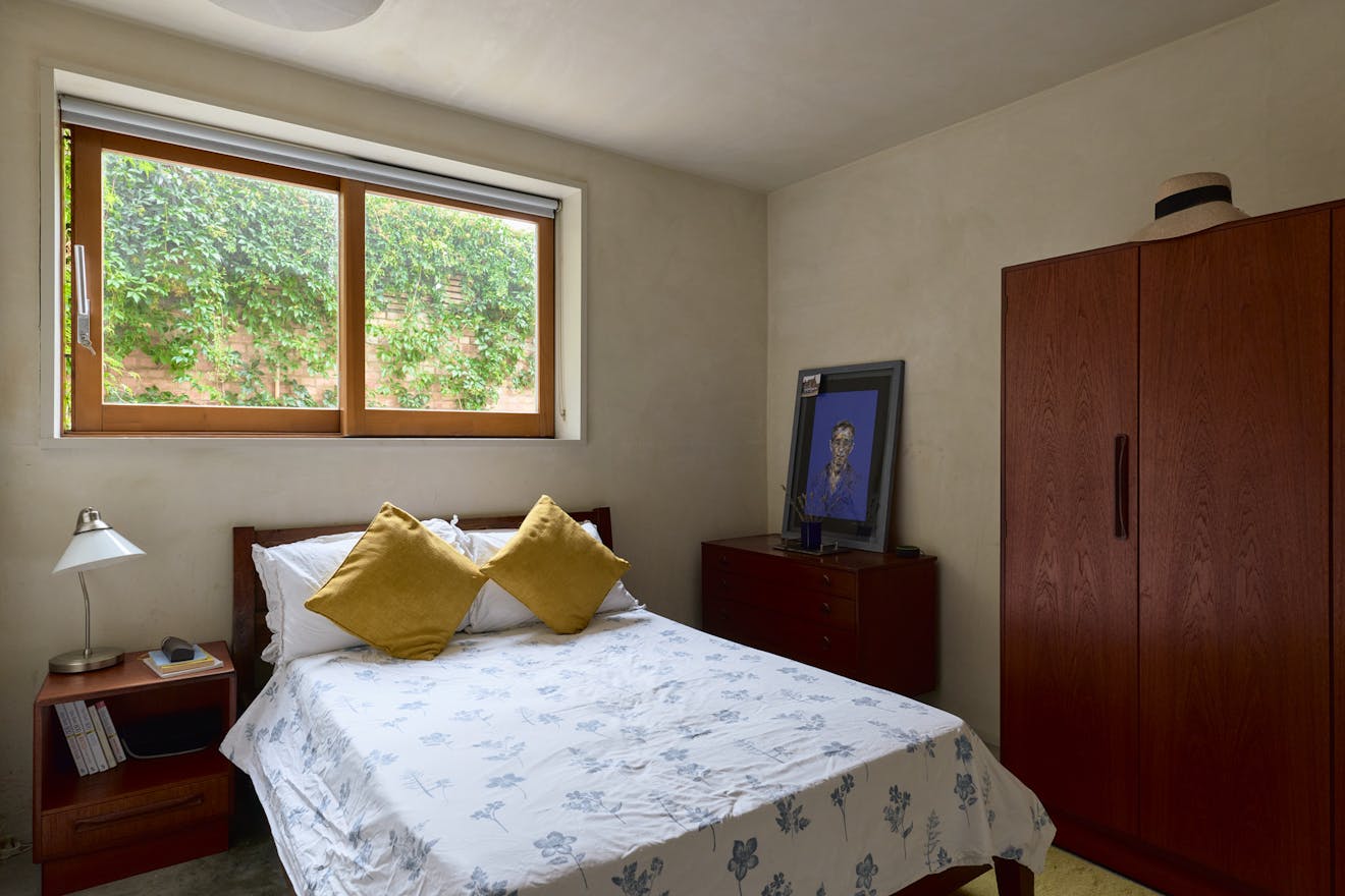 The lower level contains a galley kitchen with integrated appliances and expansive glazing that frames a view of an ivy-covered wall. Underfoot, polished concrete with underfloor heating runs throughout. The main bedroom and bathroom are also located on this level.
