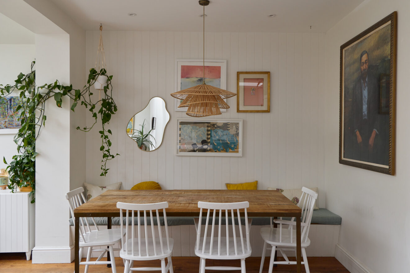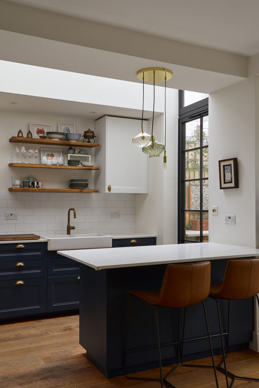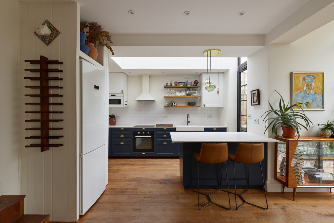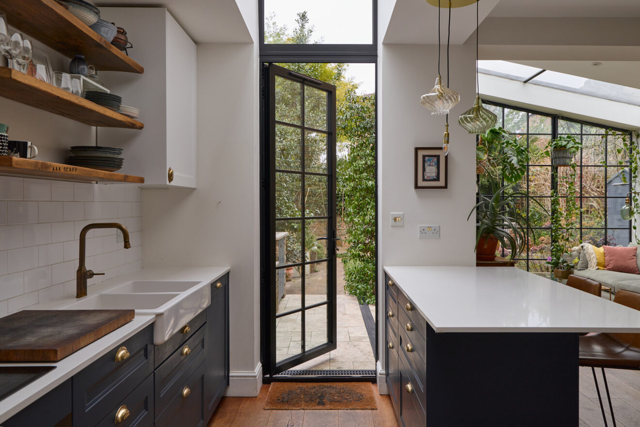 The rear of the home has been architecturally extended, transforming the kitchen and dining area into the natural heart of the property. Here, a vaulted ceiling draws the eye upward, while Crittall-style glazing frames the garden beyond, dissolving the boundary between inside and out. The kitchen itself is finished in a timeless shaker style, grounding the space with warmth and craftsmanship.