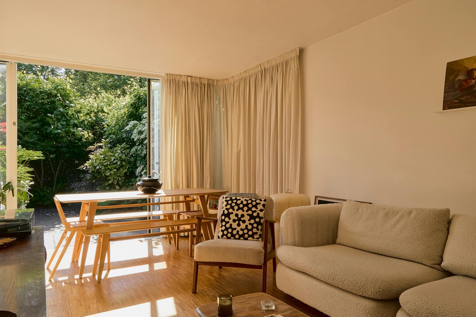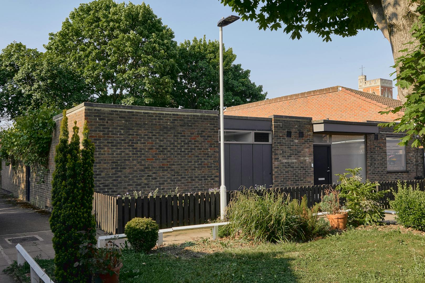 The estate itself is a quiet network of single-storey homes linked by communal lawns. A gate at the rear of the garden opens directly to these shared green areas, reinforcing the seamless connection between home and landscape. These spaces are well-tended and regularly enjoyed by residents for gatherings, play, and the simple pleasure of shared community.