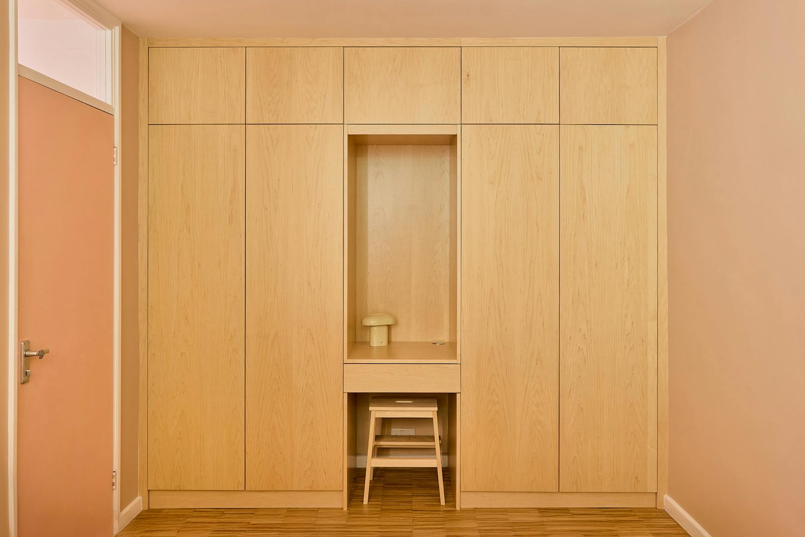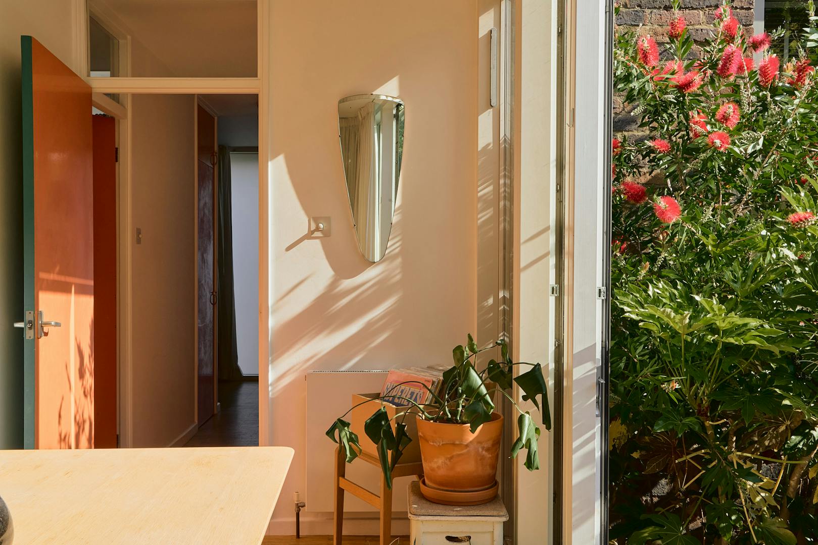 A modest brick and cement façade conceals a surprisingly spacious interior. Entry is through a glazed front door with a frosted panel, opening into a wide hallway where a cloak cupboard and full-height storage sit tucked to one side. Oak parquet flows throughout, leading into the central living and dining area - a voluminous, open space that connects directly to the garden through new wood and aluminium-framed doors.