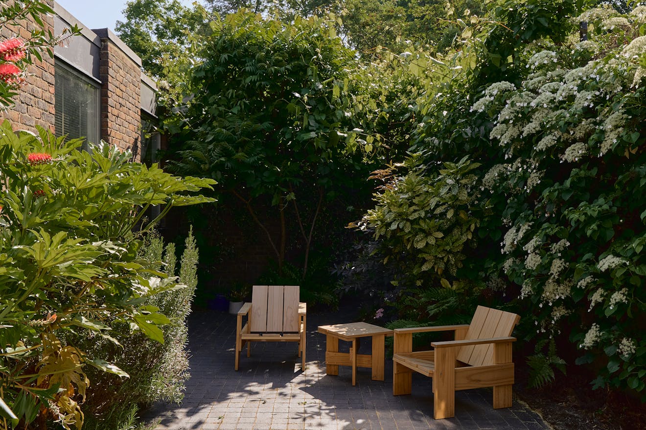 The rear garden, redesigned by Casswell Bank, acts as a natural extension of the home. Paved in soft grey and enclosed by climbing shrubs and mature planting, it offers year-round greenery and privacy. An established rosemary bush and elder tree provide seasonal scent and shade, while a dining terrace directly mirrors the position of the indoor dining space.