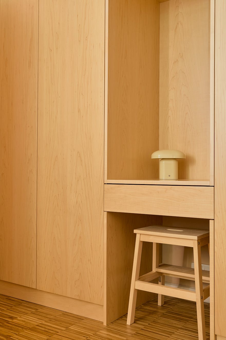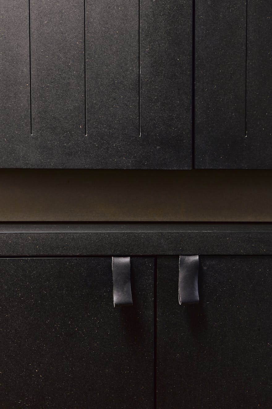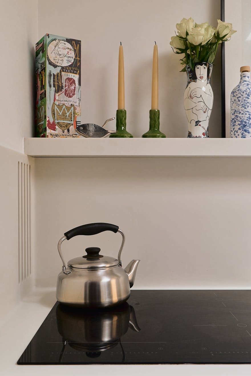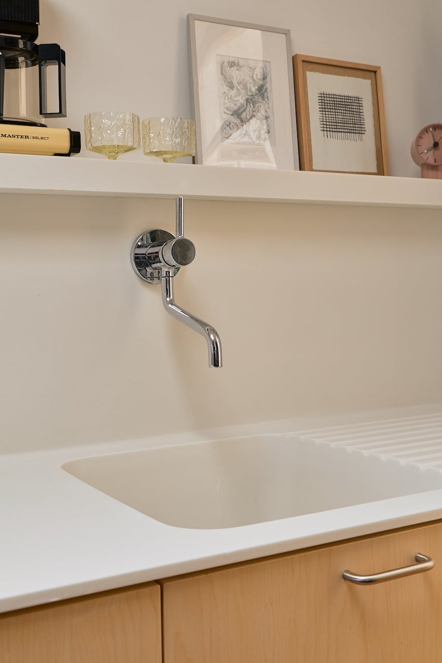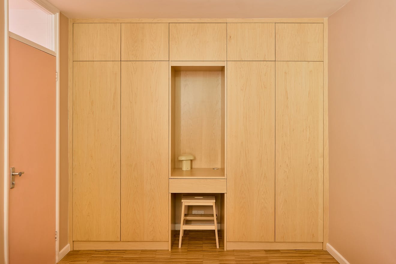 The adjacent kitchen has been conceived as a pair of contrasting yet harmonious galley runs. On one side, black Valchromat cabinetry provides a deep, matte anchor, while white Corian worktops and splashbacks on the other side reflect light back into the space. Integrated appliances, including an induction hob and sink, are seamlessly incorporated. Beyond, a quiet study overlooks the communal green and includes bespoke birch plywood joinery - a considered retreat within the home.