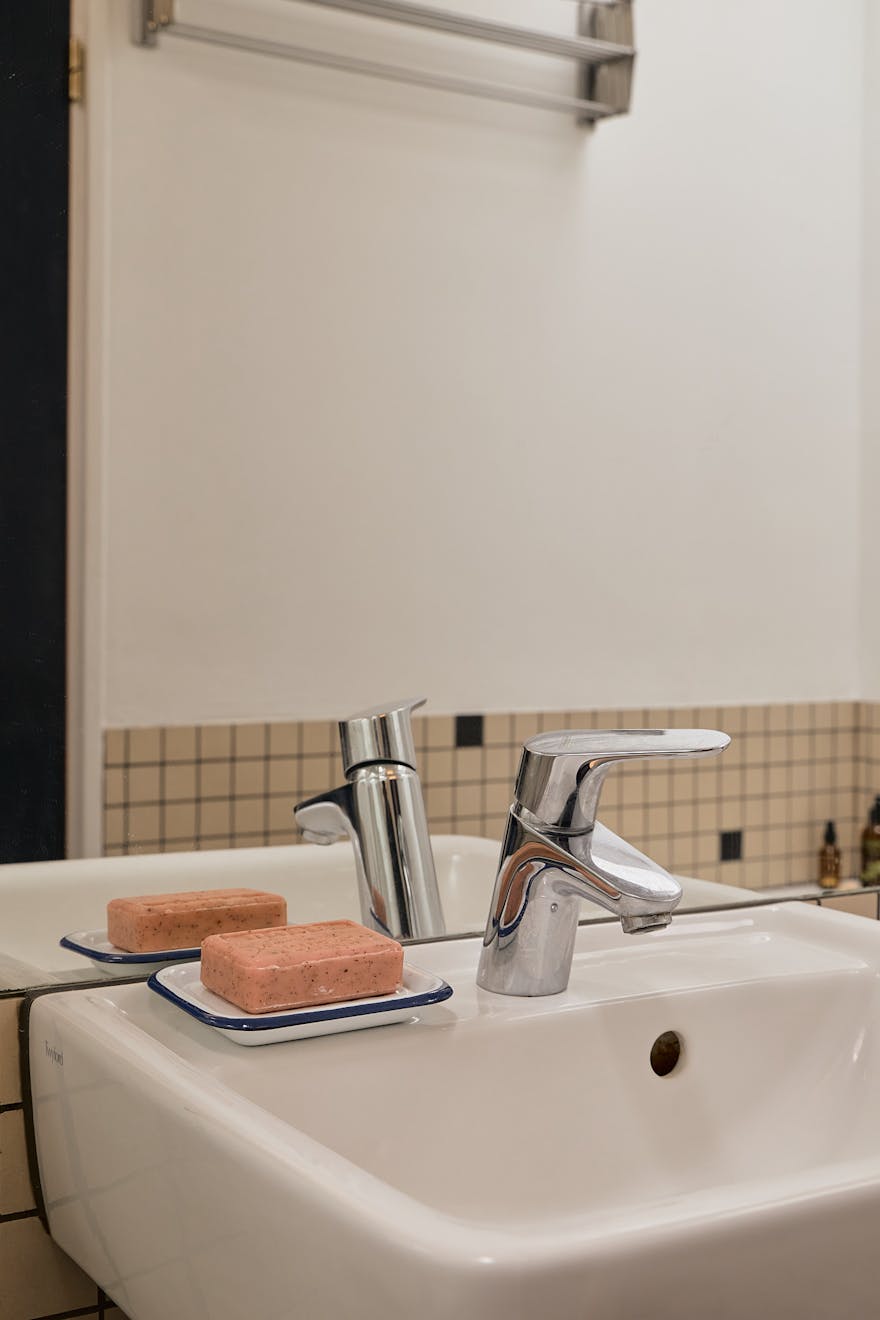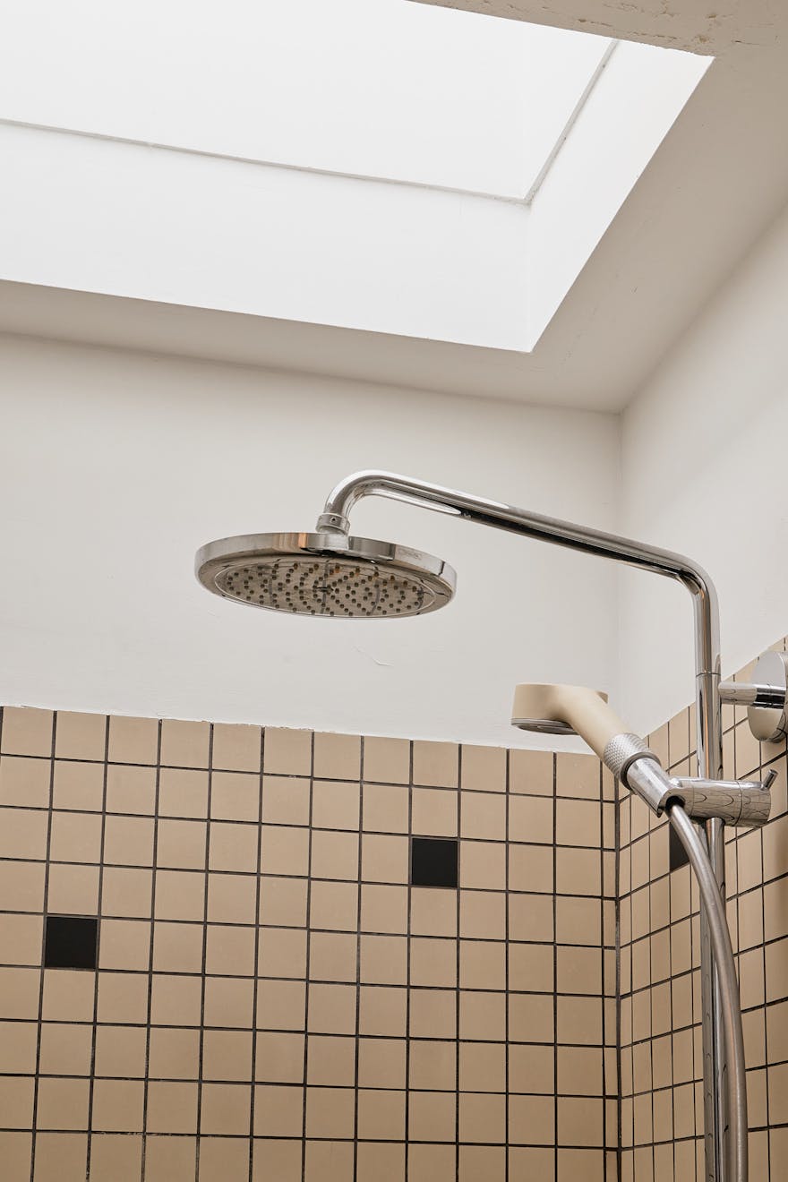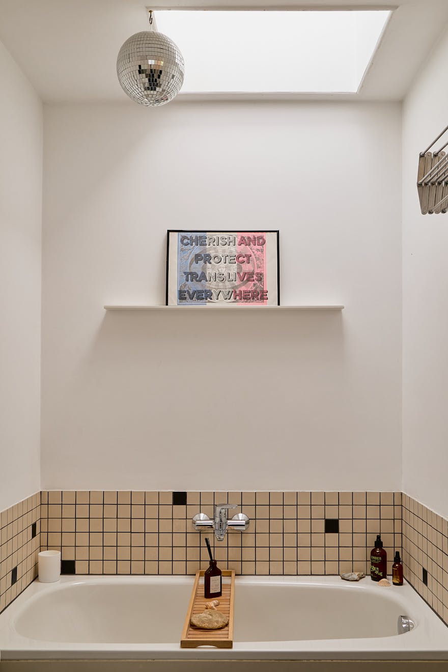 The bedrooms are arranged along a separate corridor, where three generous rooms overlook the lush rear garden. Each has been upgraded with aluminium-framed windows and the walls host soft, tonal colours that carry light that forms from the south-facing aspect. The family bathroom sits opposite, with a skylight above the bath and shower that brings daylight into the heart of the plan. Contrasting tiles and mirrored cabinetry lend the space a functional elegance.