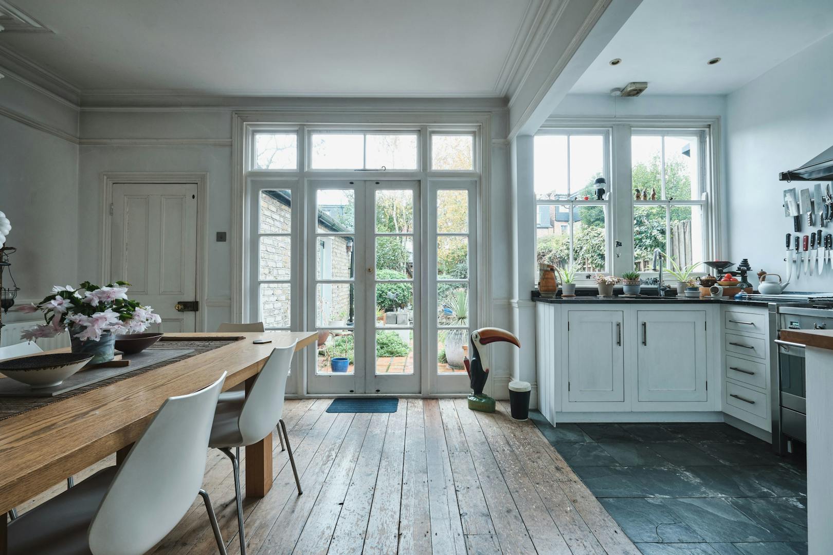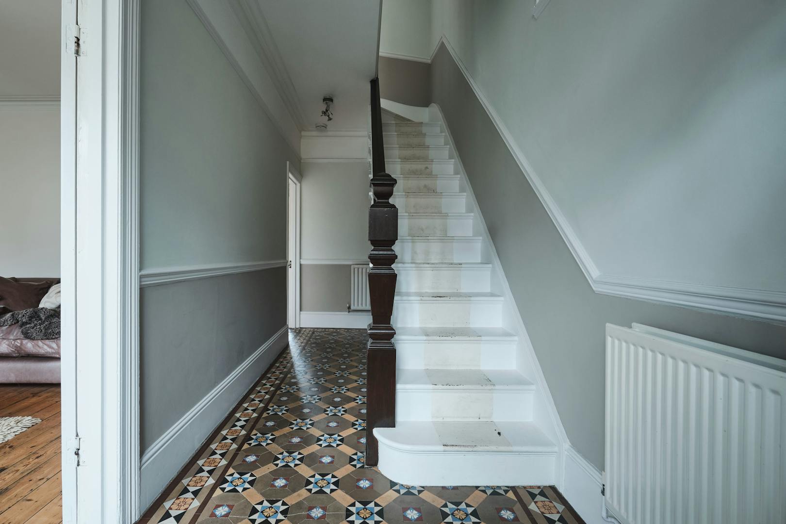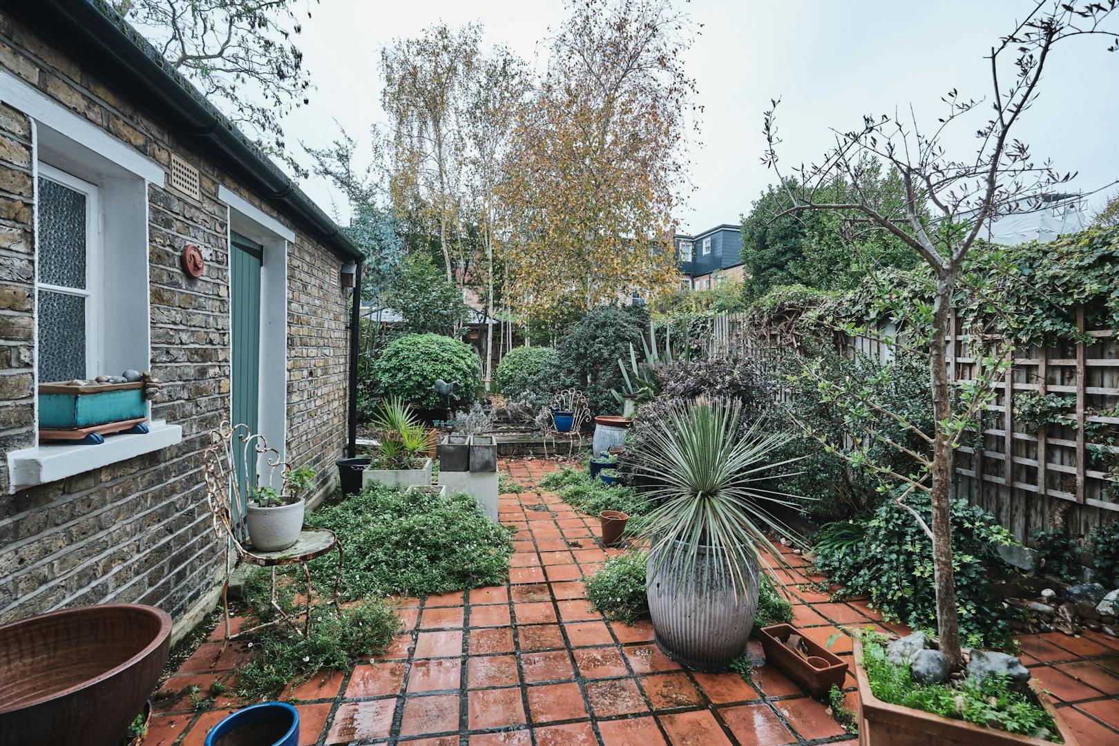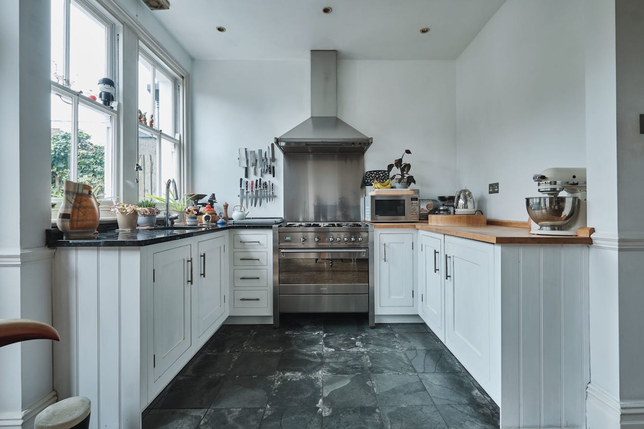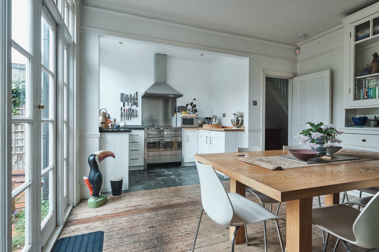From the front door, you enter into a beautiful wide hallway, with original tiled floor. Off to your left is a large reception room at the front and sizeable open plan kitchen diner at the back. There is potential to knock these rooms together, and to do a full-width rear extension – subject to planning permission. Off the kitchen there is a utility/storeroom. The beautiful, south-west facing, subdivided garden, with quarry tiles and and silver birch, also has its own separate access from the street.
