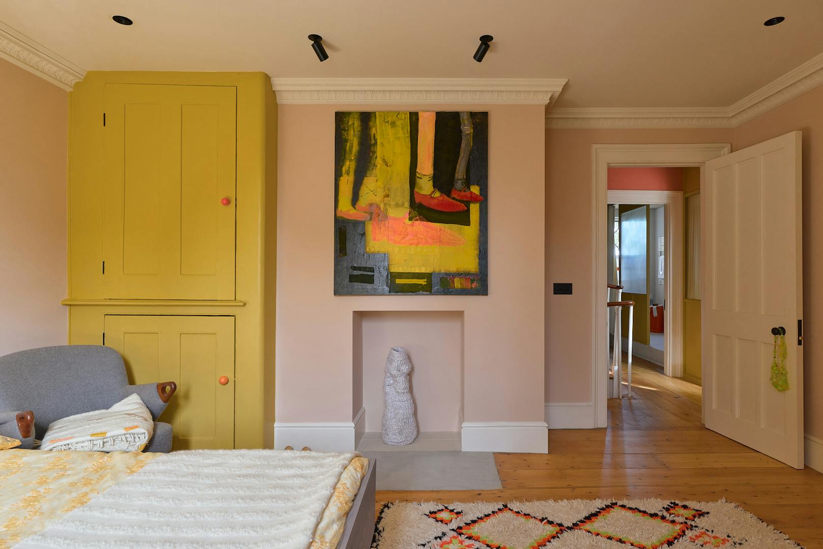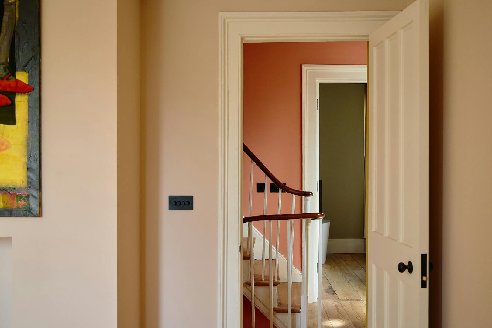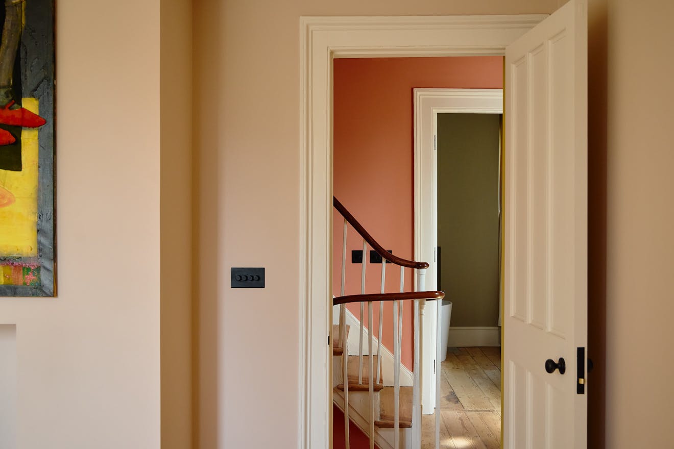 Upstairs, three bedrooms and three reception rooms – one doubling as a snug or fourth bedroom – offer flexible living. The stairwell is painted in Rosa Red, a custom shade developed with Fenwick & Tilbrook, referencing the roses of De Beauvoir Square.