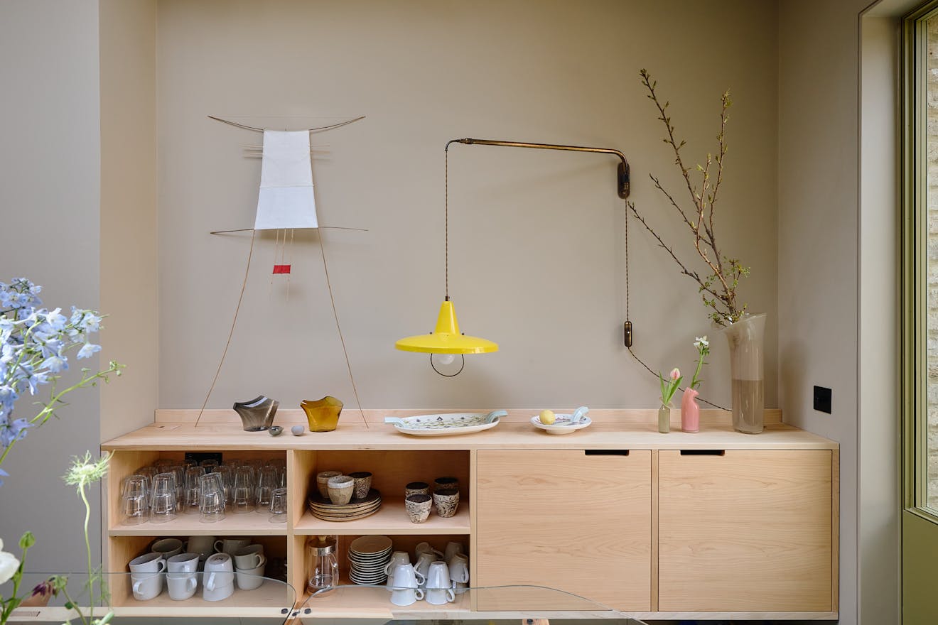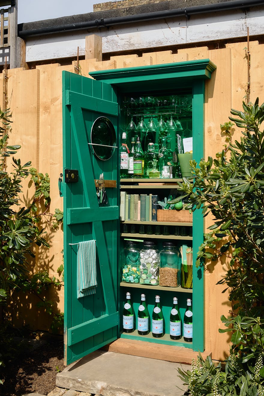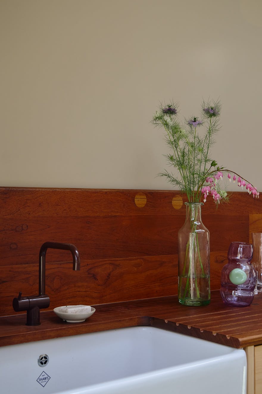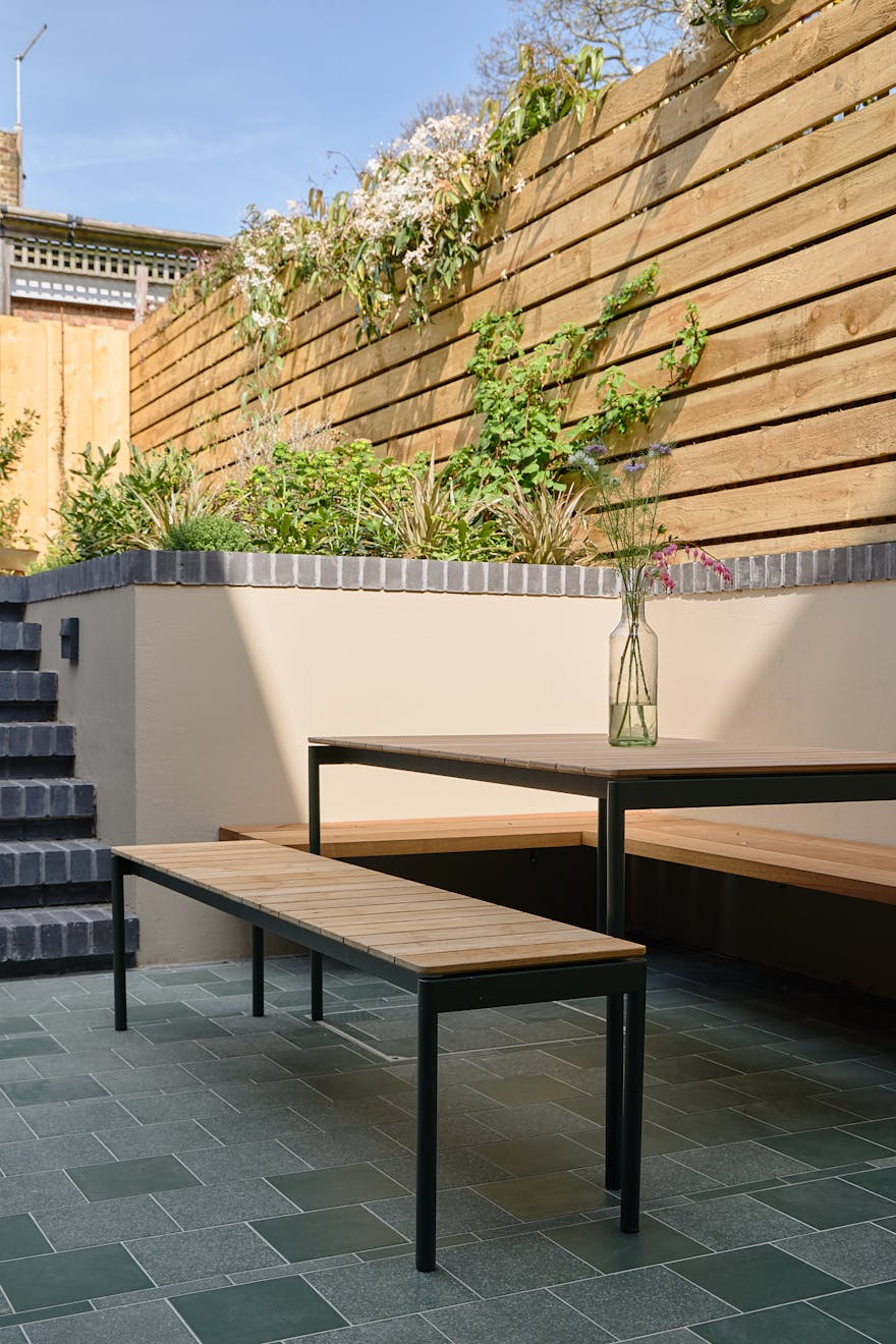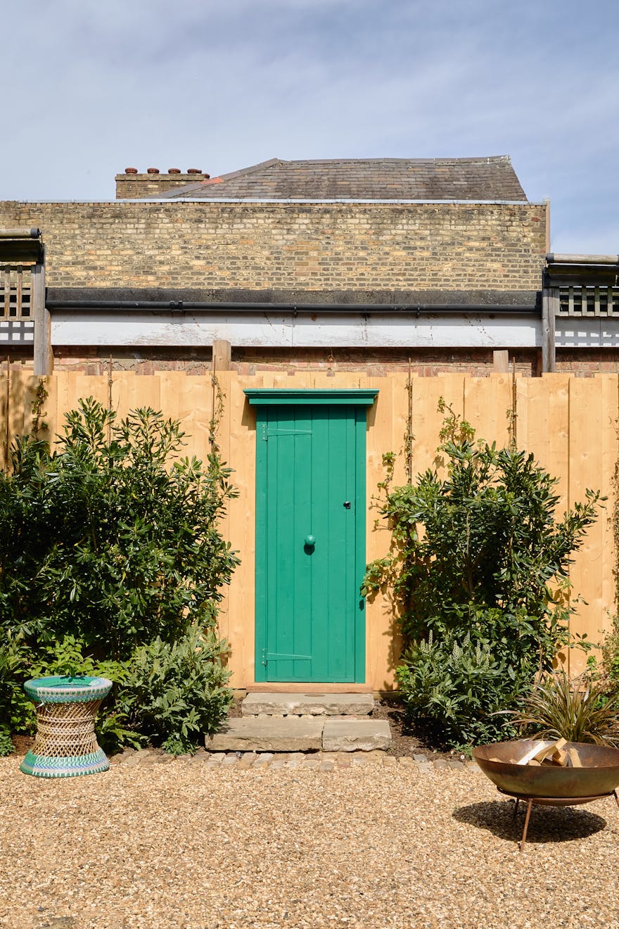 The lower ground floor hosts the kitchen, where an over-head lantern overlooks maple cabinetry and reclaimed Iroko countertops. This space opens onto a terraced garden by award-winning garden designer Peter Beardsley. A welcoming oak-framed bench and seating area offers a chance to unwind in the morning sunshine, while steps lead up to a decorative garden with raised beds and a barbecue area. A reclaimed emerald green door from the original house has been salvaged and now sits as a moment of intrigue at the end of the garden, aptly named the cupboard of curiosity.