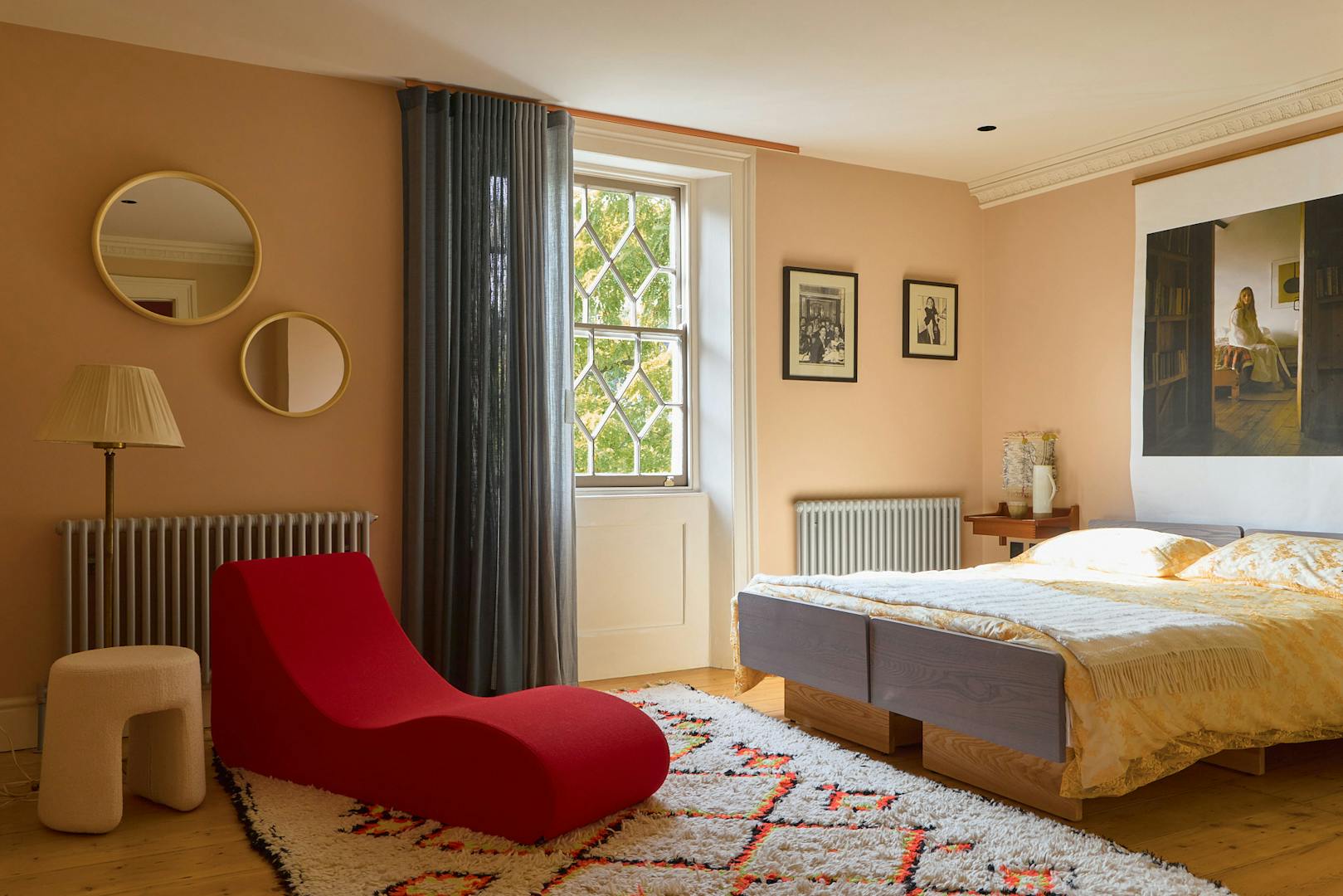 Every detail has been considered, from the diamond-patterned tiled floors that mirror the leaded windows, to the curated selection of furniture and art by designers including Bethan Laura Wood, Peter Pilotto, and Flavia Brändle. The result is a home that feels both rooted in history and alive with contemporary creativity.