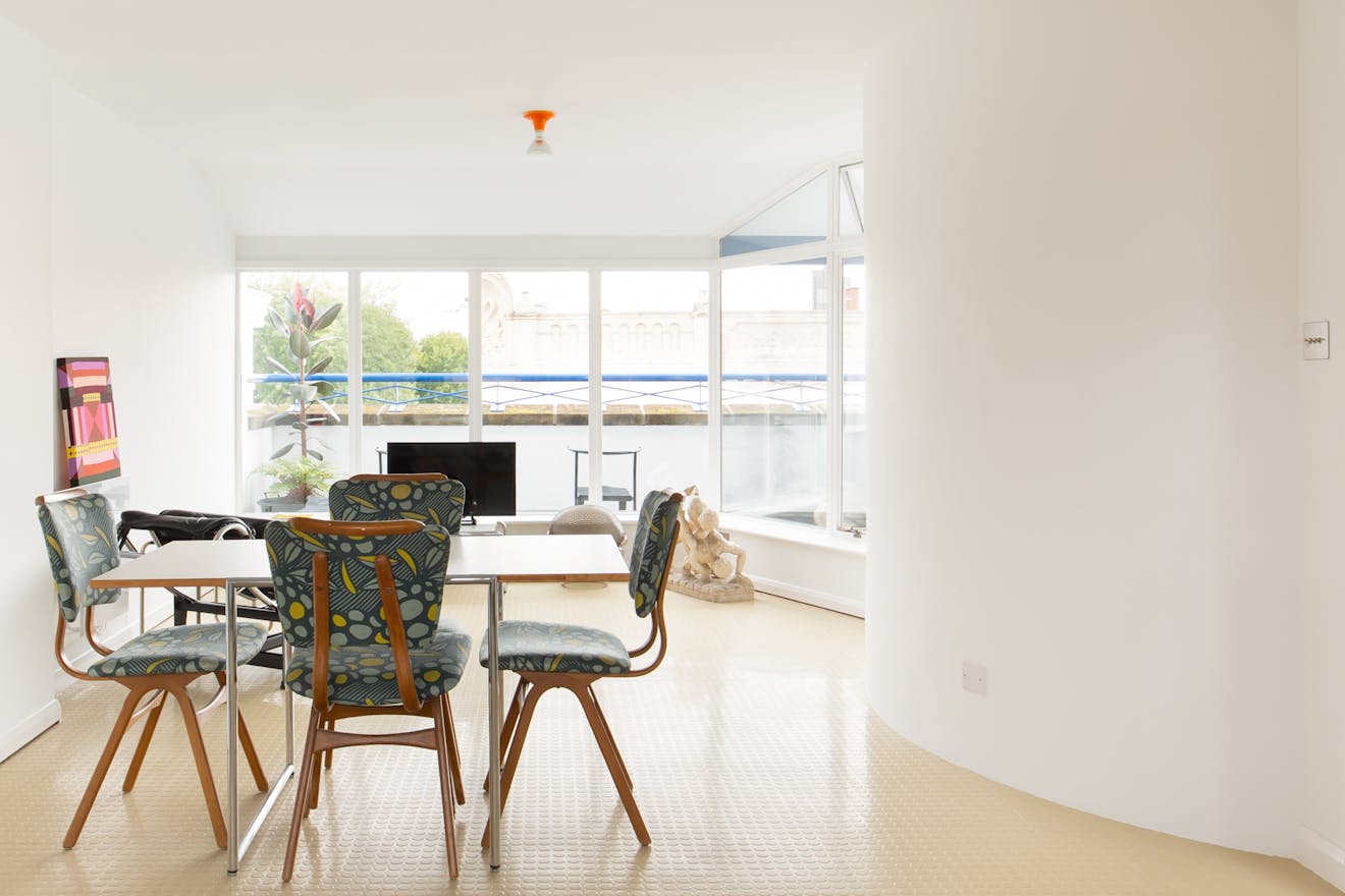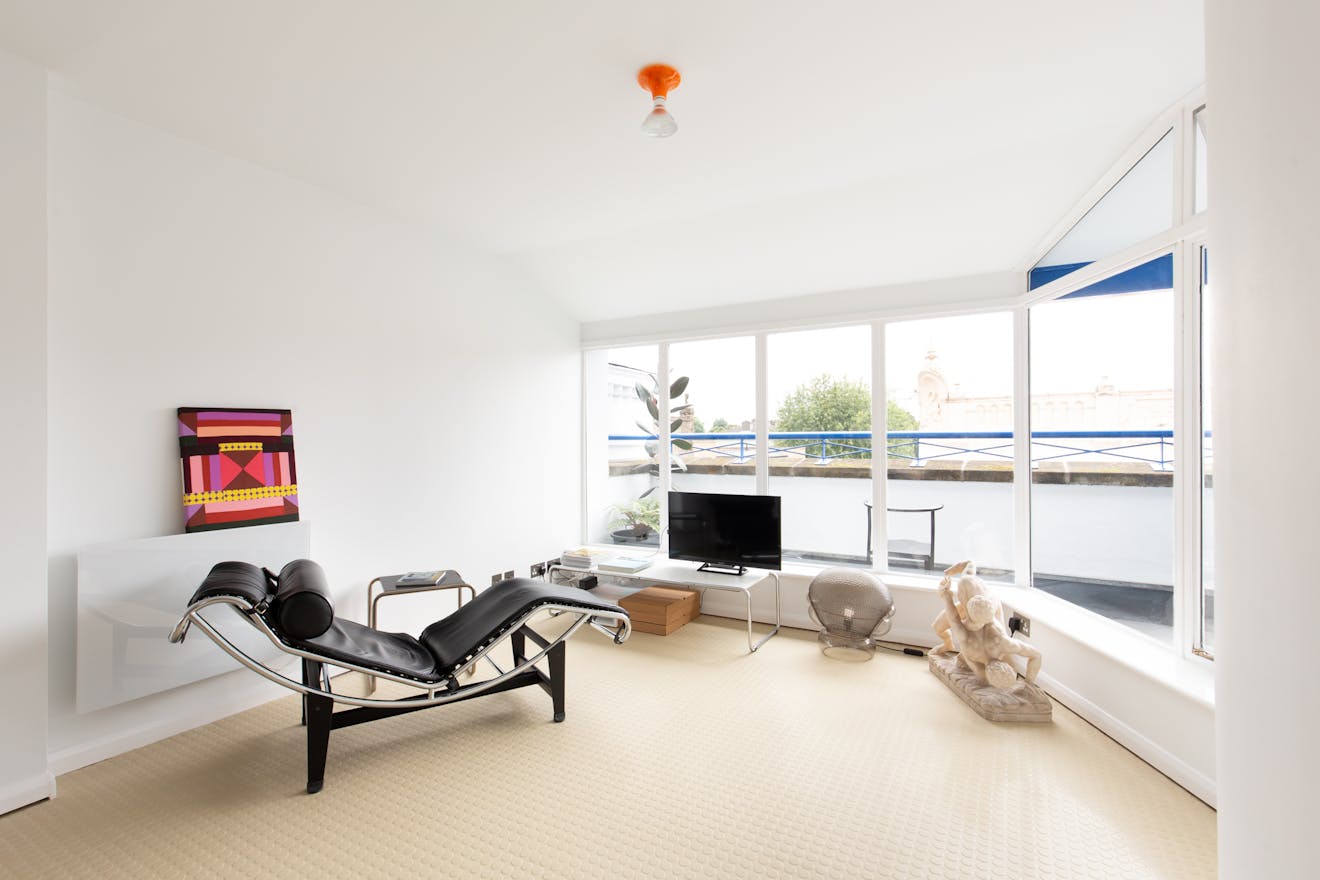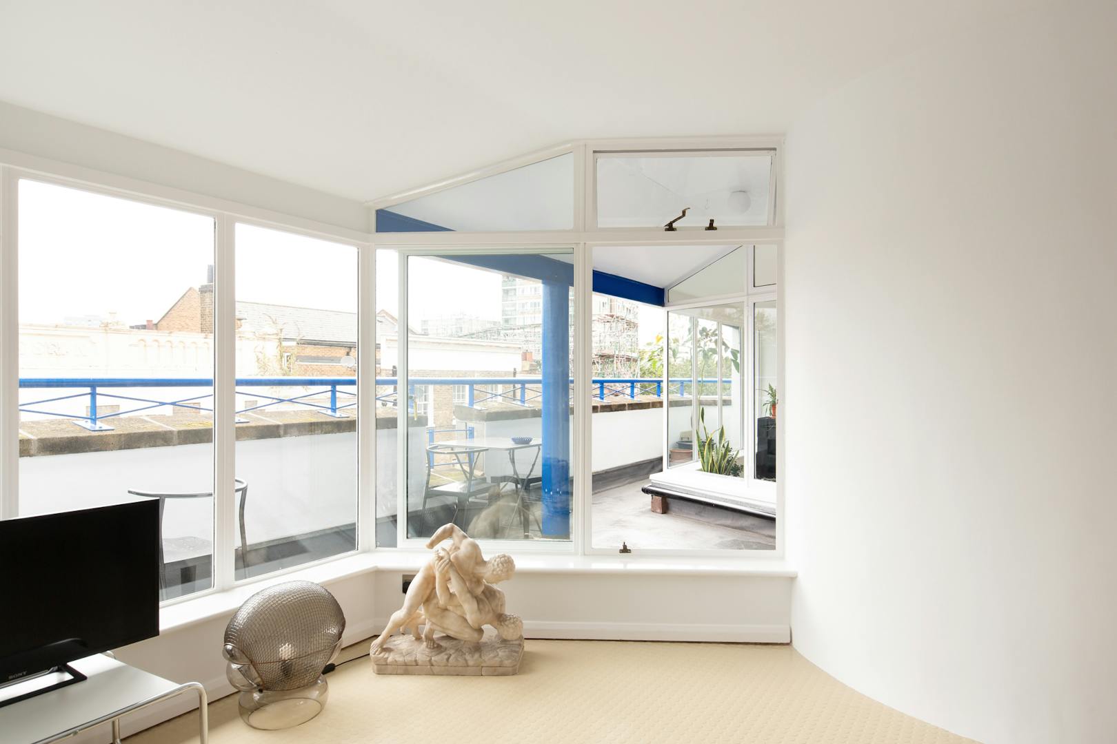 The kitchen and living room area, with its beautiful curved wall - reminiscent of something you'd find in a Corbusier masterpiece - opens out onto a full-width balcony, with views over the rooftops and green spaces beyond. This unique aspect is mirrored to create a second bedroom, which could also make an appealing home studio or office. There is also enough light and space in the hallway for a desk, if you need to work from home and want to create a separate area.
