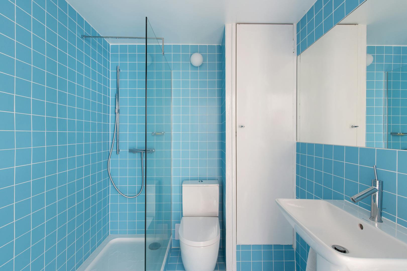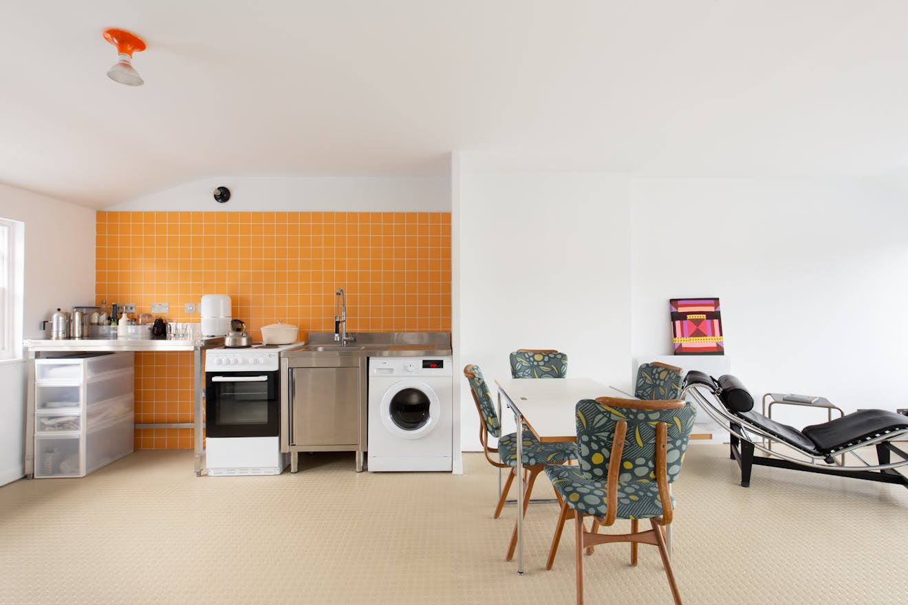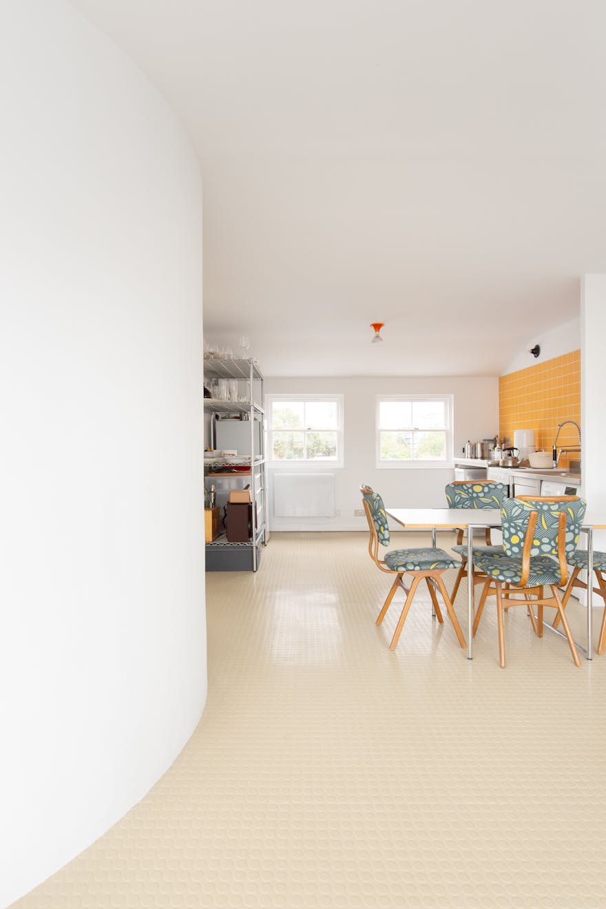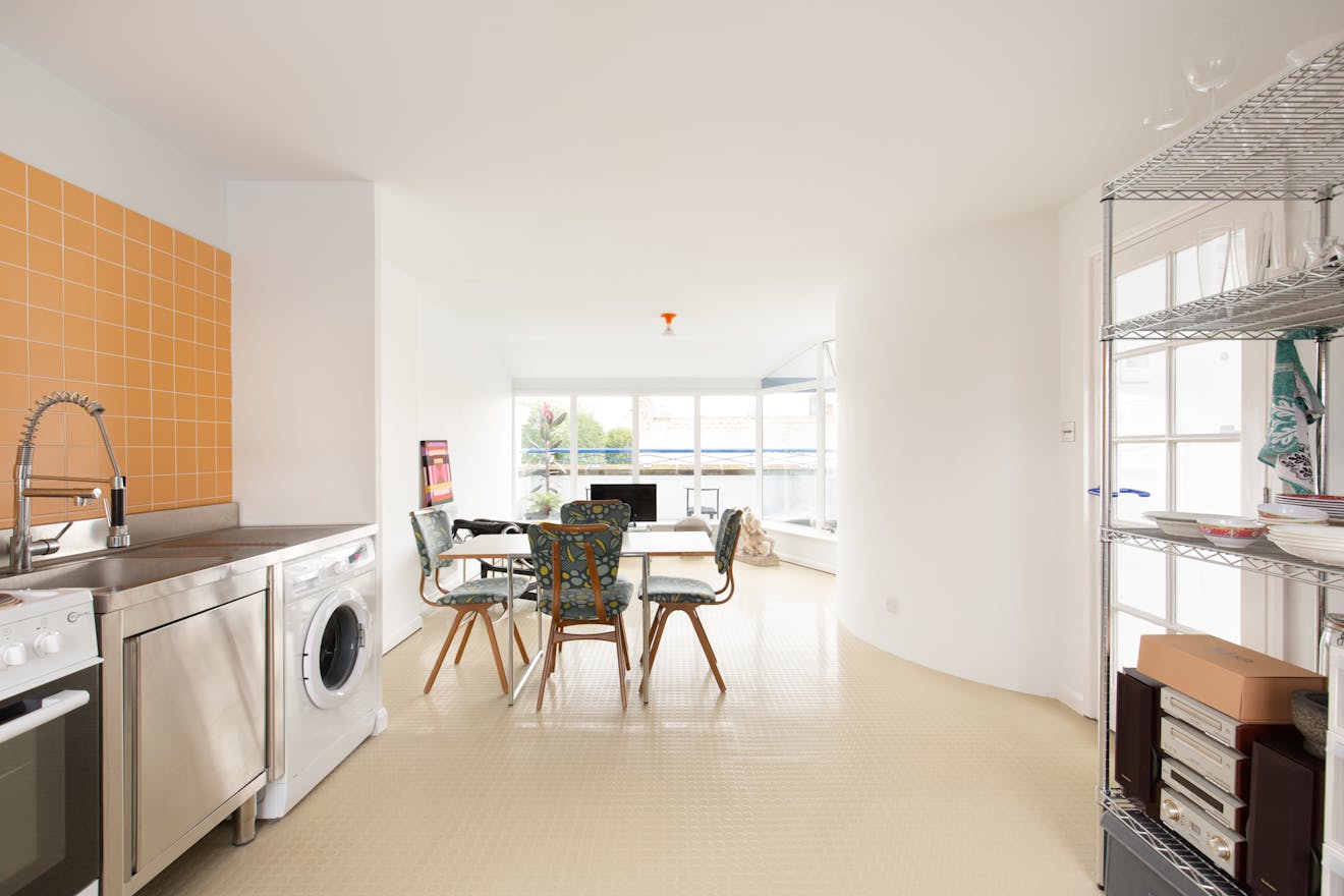 Colour-popping, Italian tiles create character in the kitchen and bathroom, whilst brilliant white sees its way through all the walls and ceilings for an ultra minimalist ambience. A neutral-toned, dotted Italian rubber flooring runs throughout; modern and durable, it's reminiscent of that which was originally designed for Milan's underground system in 1962.