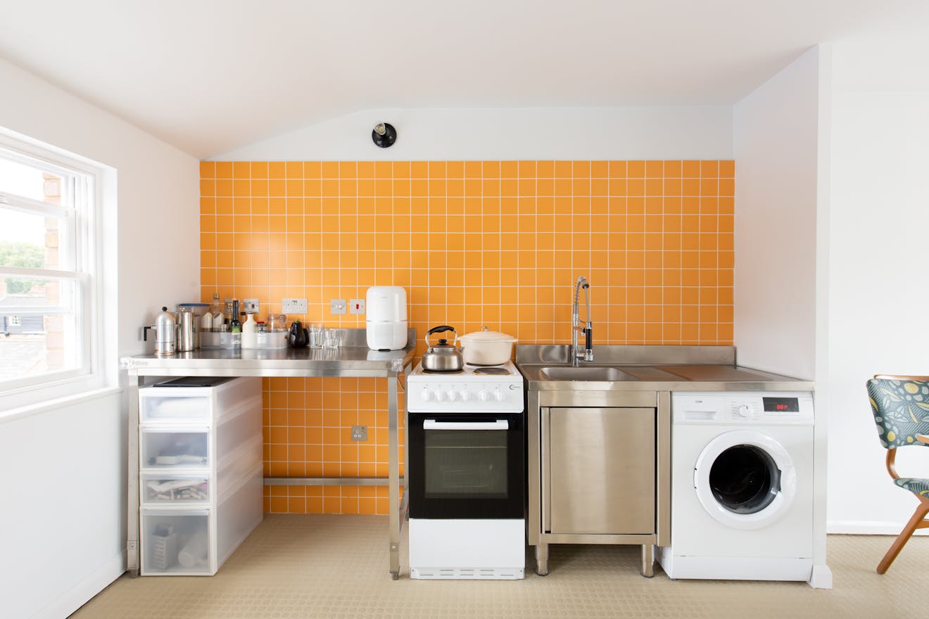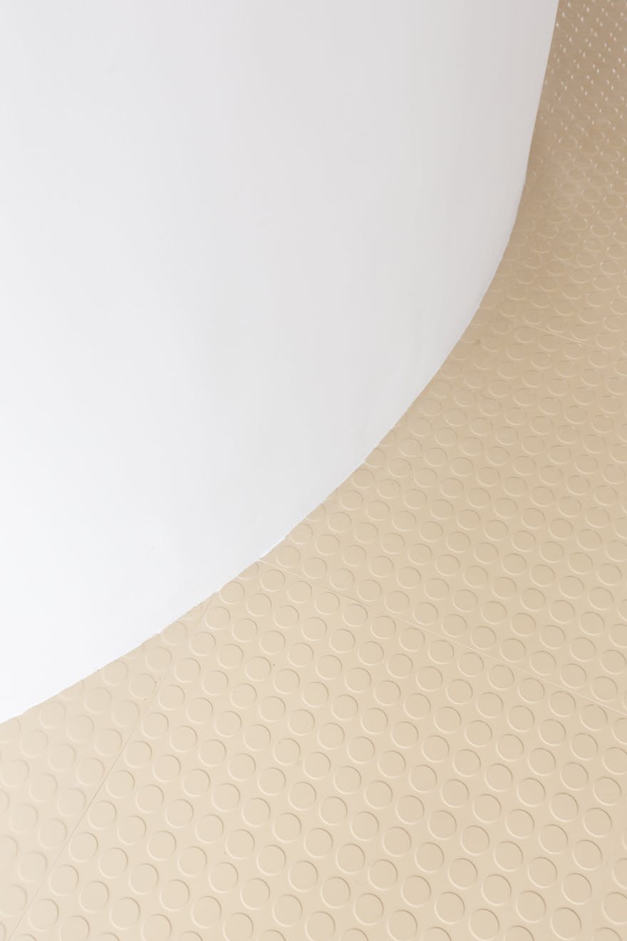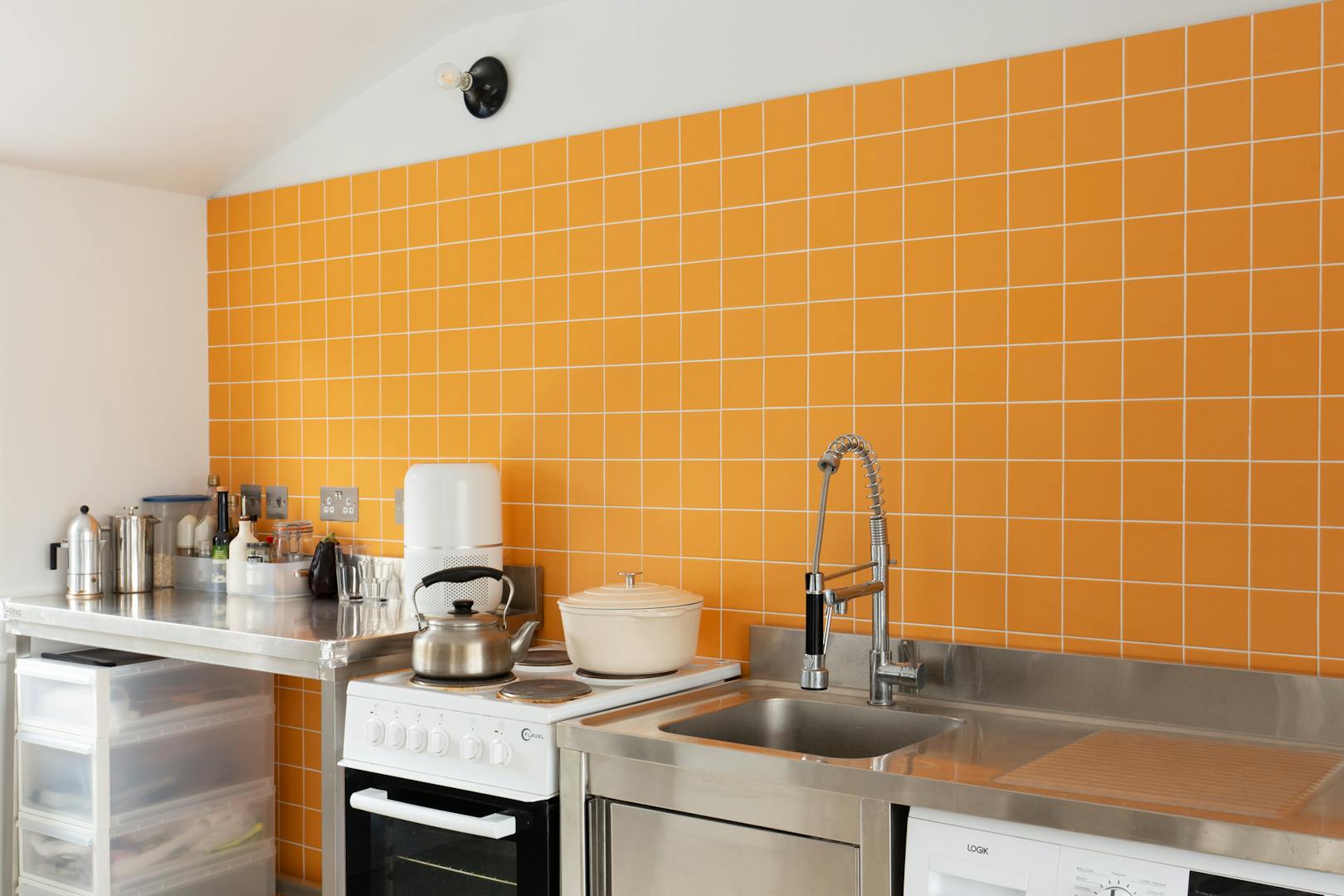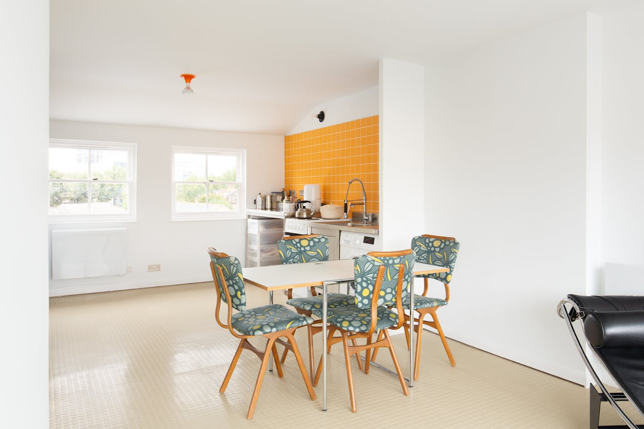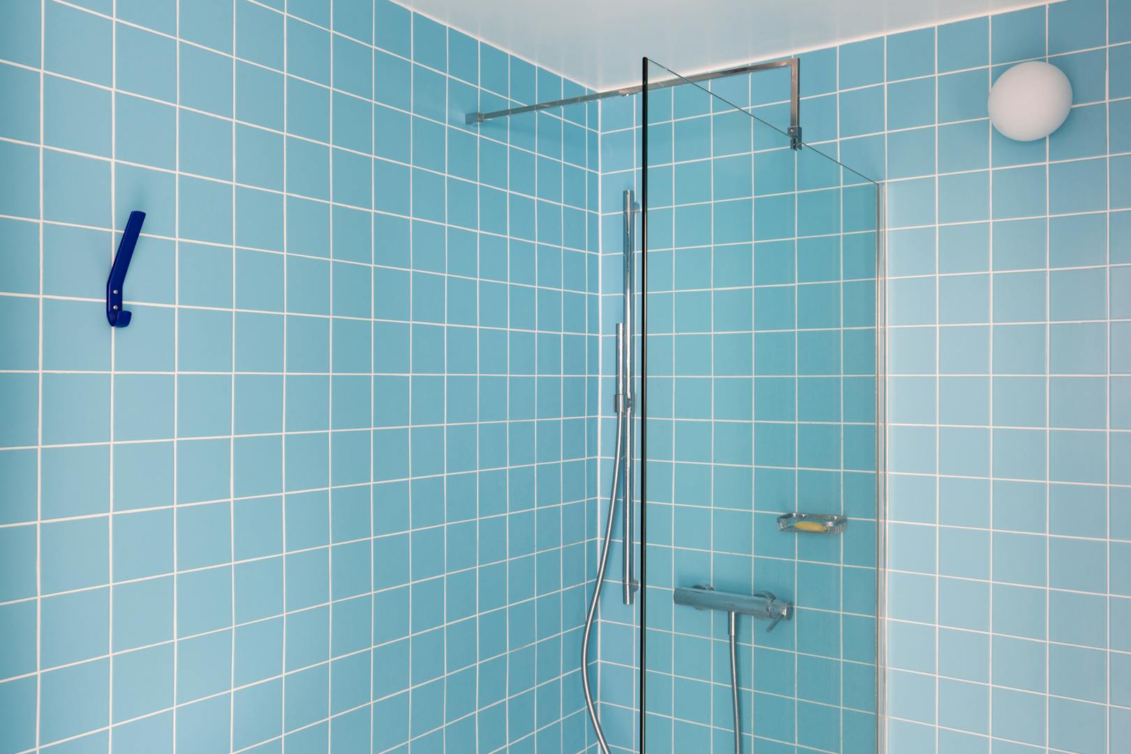 Colour-popping, Italian tiles create character in the kitchen and bathroom, whilst brilliant white sees its way through all the walls and ceilings for an ultra minimalist ambience. A neutral-toned, dotted Italian rubber flooring runs throughout; modern and durable, it's reminiscent of that which was originally designed for Milan's underground system in 1962.