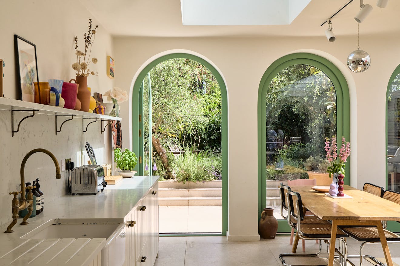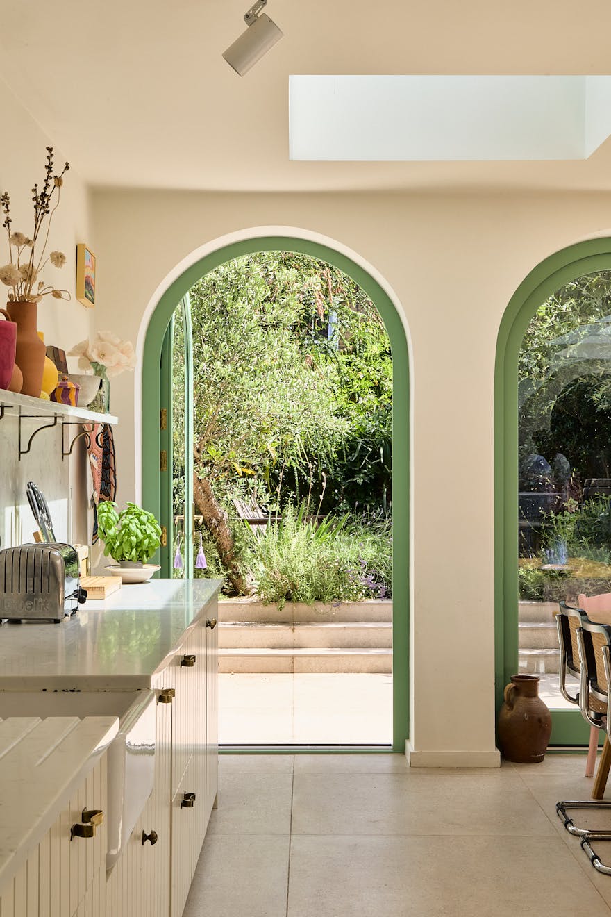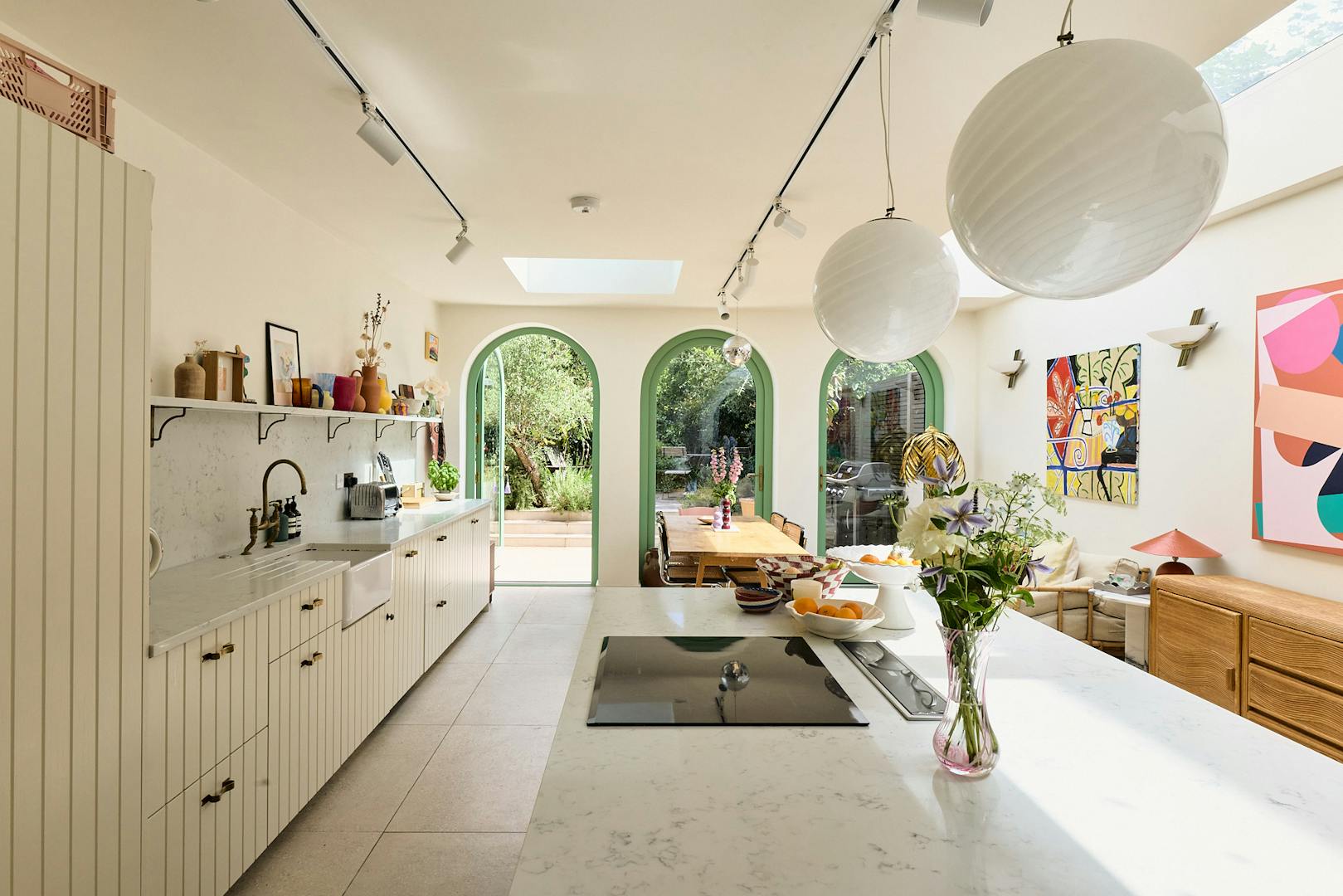 A sunlit expanse defined by soft Romanesque arches and a material palette that feels at once grounded and uplifting. A generous island in natural timber offers a tactile counterpoint to the fluted cabinetry by Naked Kitchens and brass detailing, while an expanse of terrazzo-style flooring grounds the space with calm permanence.