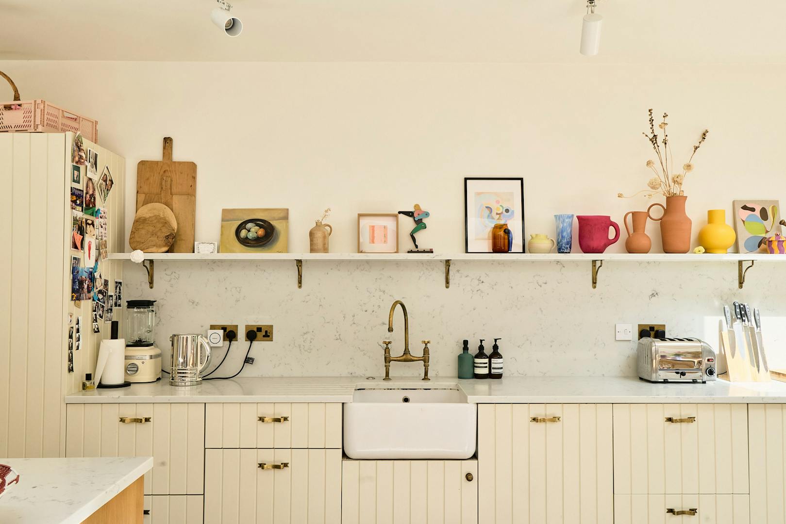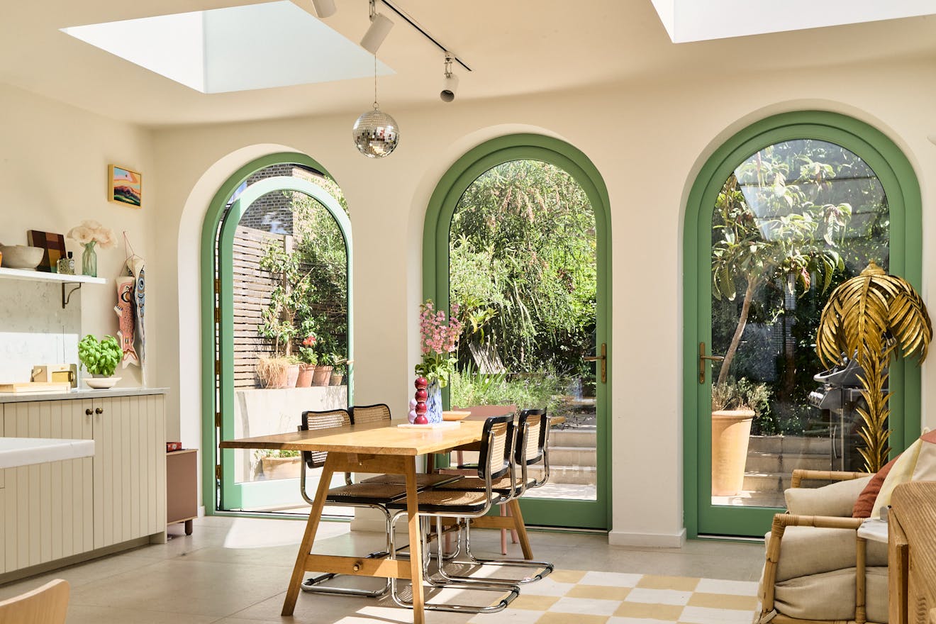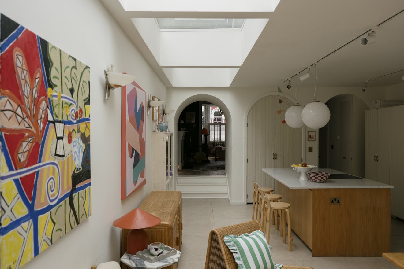 A sunlit expanse defined by soft Romanesque arches and a material palette that feels at once grounded and uplifting. A generous island in natural timber offers a tactile counterpoint to the fluted cabinetry by Naked Kitchens and brass detailing, while an expanse of terrazzo-style flooring grounds the space with calm permanence.