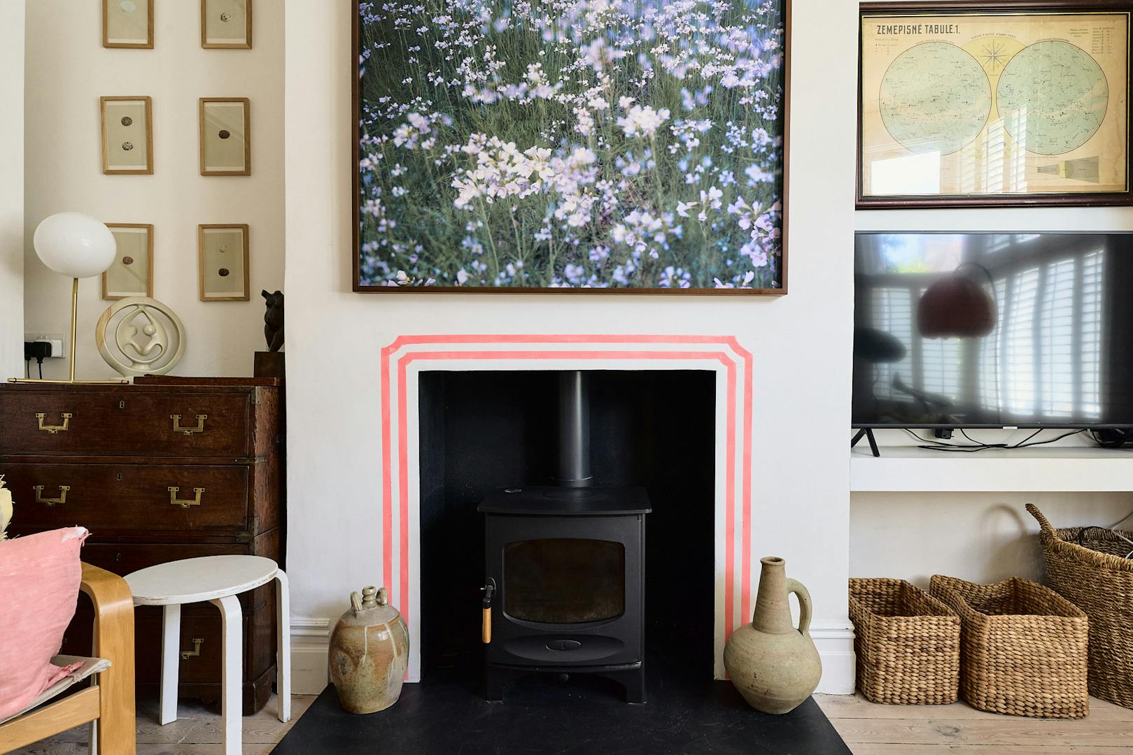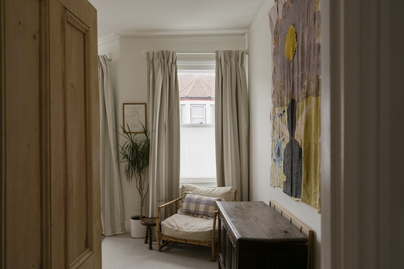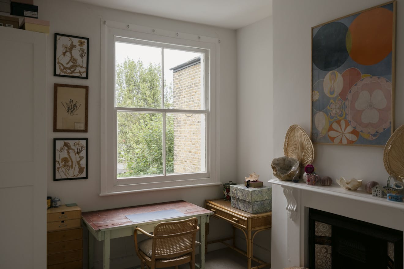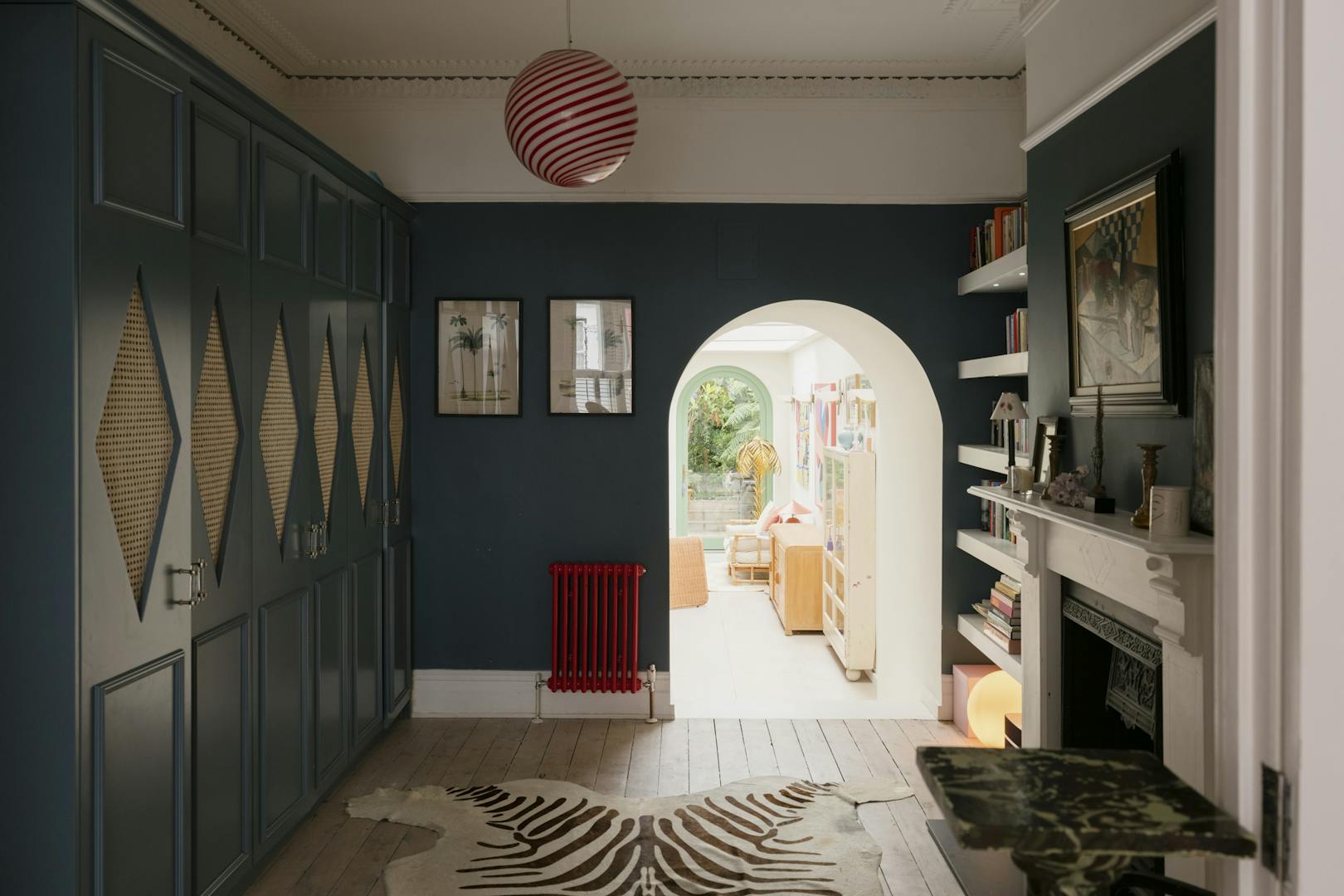 Stepping into the front of the house, a traditional double reception room sets the tone, a calm, elegant space framed by original cornicing, deep bay windows and restored sash windows that invite light through both morning and afternoon. A wood-burning stove anchors the front half of the room, offering a quiet sense of comfort. Toward the rear, walls and joinery are finished in a rich navy, with bespoke built-in wardrobes and a striking visual fireplace, creating a moody, intimate contrast ideal for evenings or quieter moments. The symmetry starts through the arch connecting the double reception room and exceptional kitchen area while guiding the eye through house to garden.