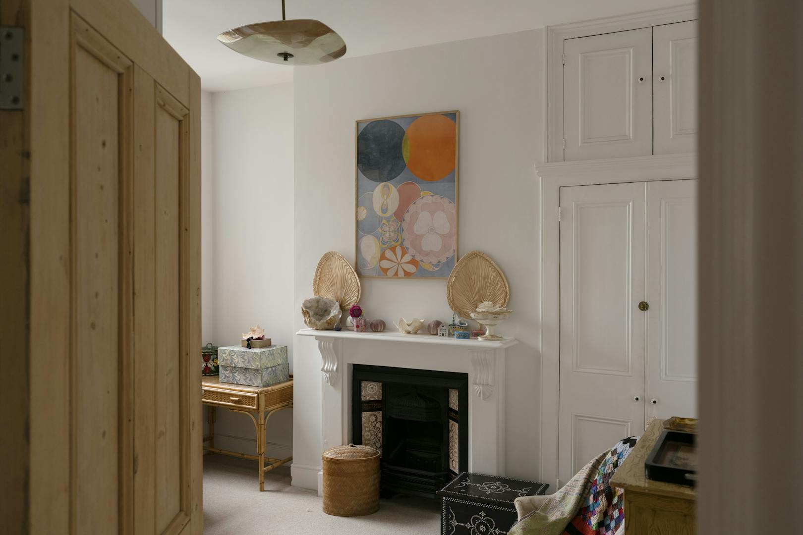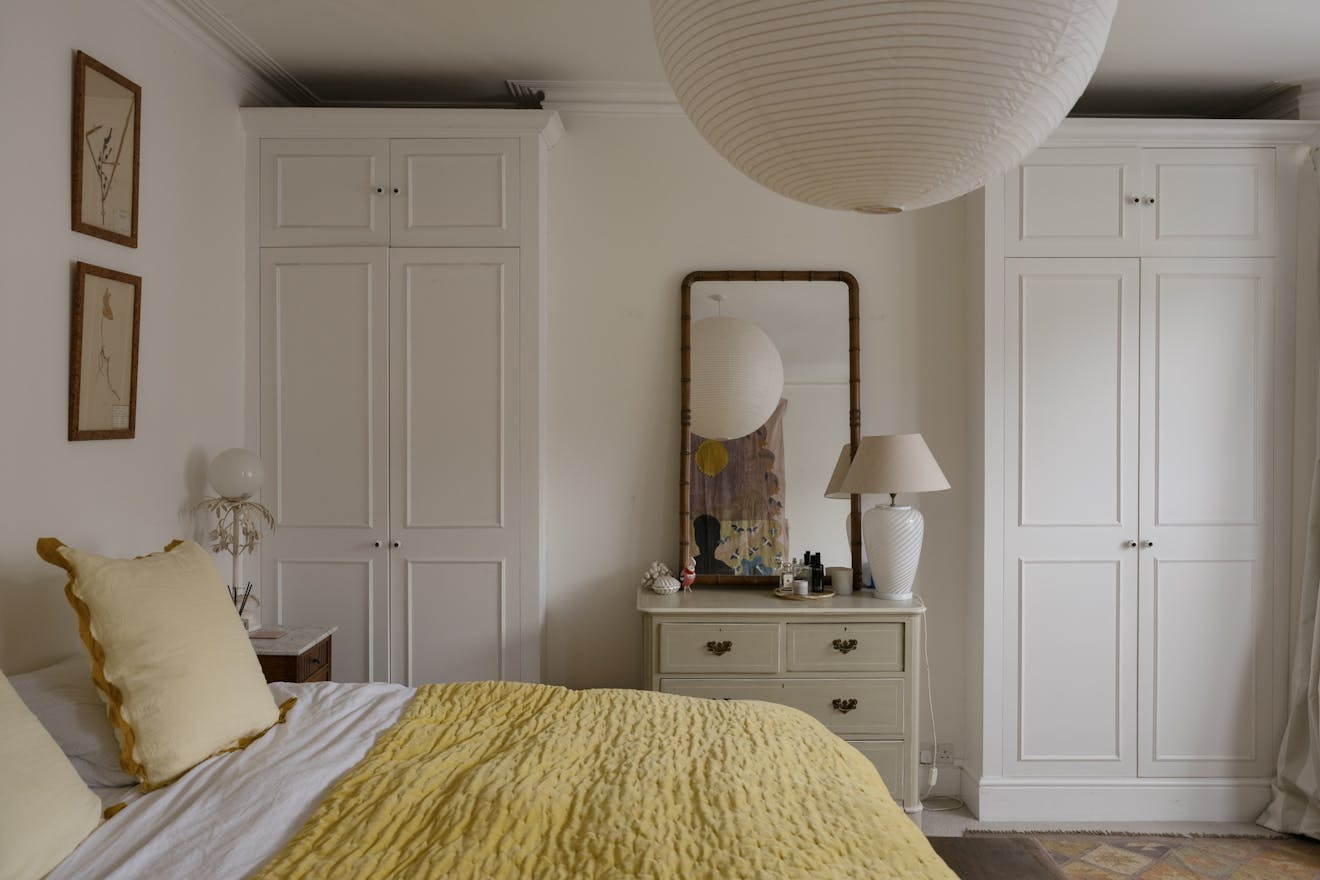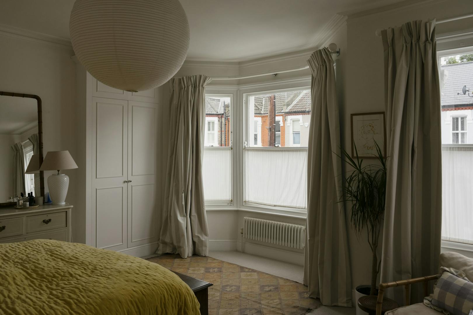 Stepping into the front of the house, a traditional double reception room sets the tone, a calm, elegant space framed by original cornicing, deep bay windows and restored sash windows that invite light through both morning and afternoon. A wood-burning stove anchors the front half of the room, offering a quiet sense of comfort. Toward the rear, walls and joinery are finished in a rich navy, with bespoke built-in wardrobes and a striking visual fireplace, creating a moody, intimate contrast ideal for evenings or quieter moments. The symmetry starts through the arch connecting the double reception room and exceptional kitchen area while guiding the eye through house to garden.