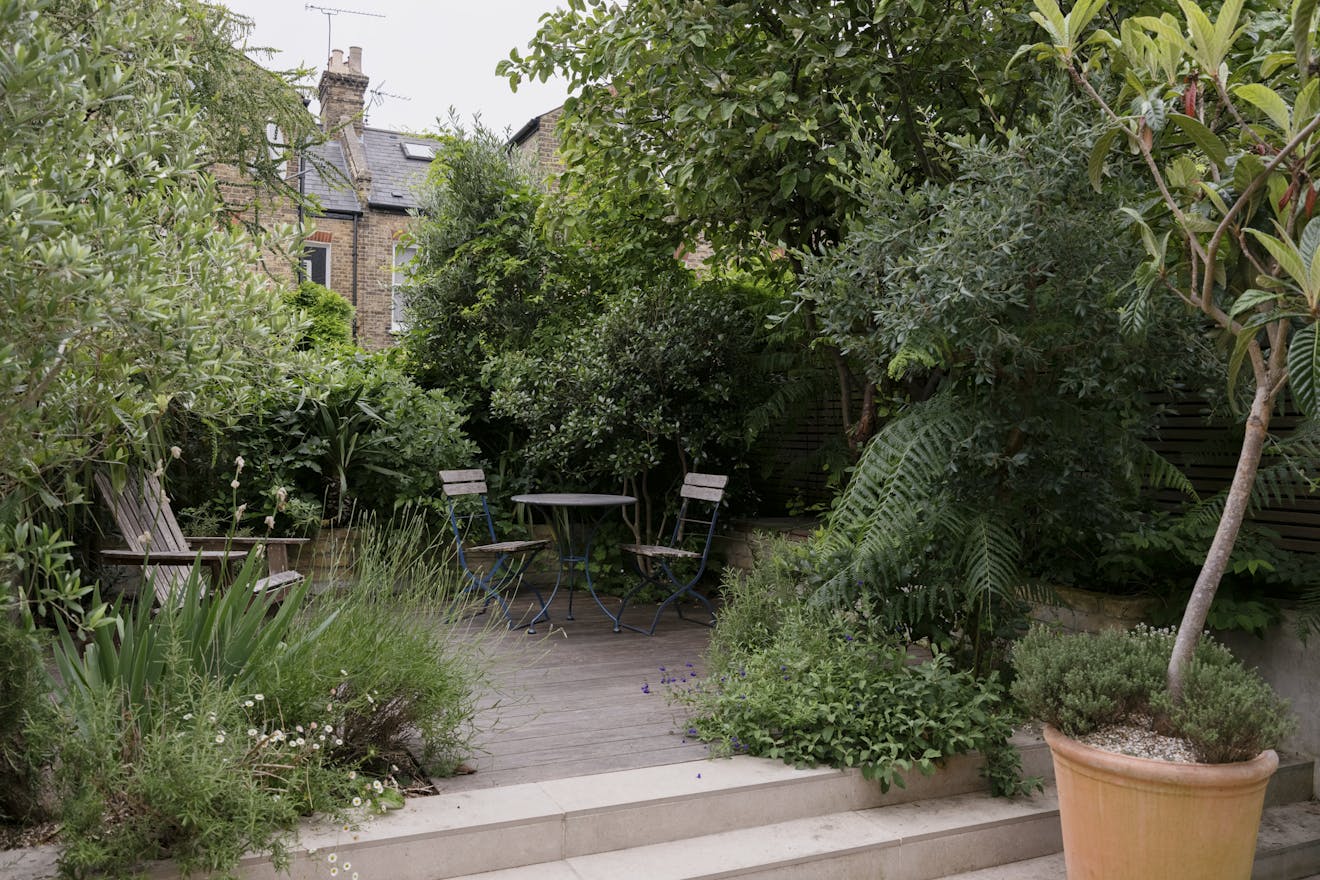 Oversized tiles extend out into the garden, creating a seamless transition between indoor and outdoor spaces. The rear garden, landscaped by garden designer Marco O'Neil, is thoughtfully arranged with a few gentle steps that define the shift from an extension of the living space to a more secluded area for relaxation, surrounded by mature planting that offers a sense of privacy.