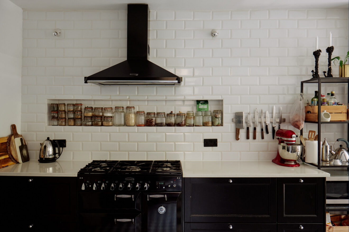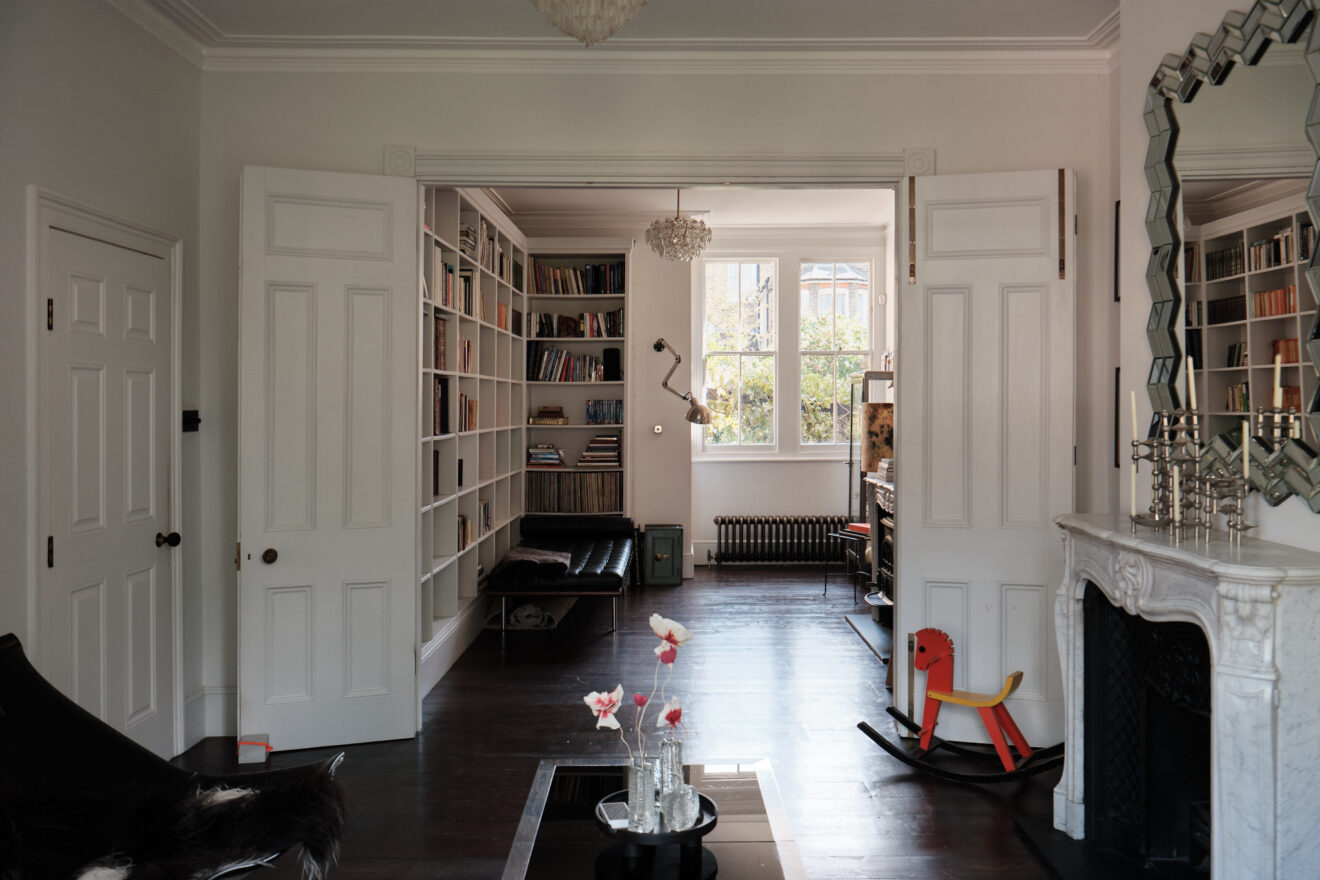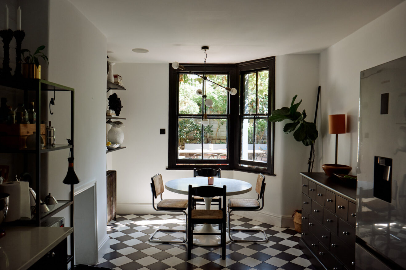 The exterior of the home features traditional sash windows painted in a deep navy hue, offset by the robust red and London stock brick façade. Entry to the home is via a Victorian mosaic tiled path, taking in the exceptional stained glass front door. Inside, original features have been retained and celebrated, including corbels and walnut floorboards, which run underfoot. The reception rooms have a beautiful pair of matching marble fireplaces, which bespoke bookshelves taking up the corner of the dining room. The kitchen sits at the rear of the plan, with traditional checkerboard tiles underfoot and shaker style units.