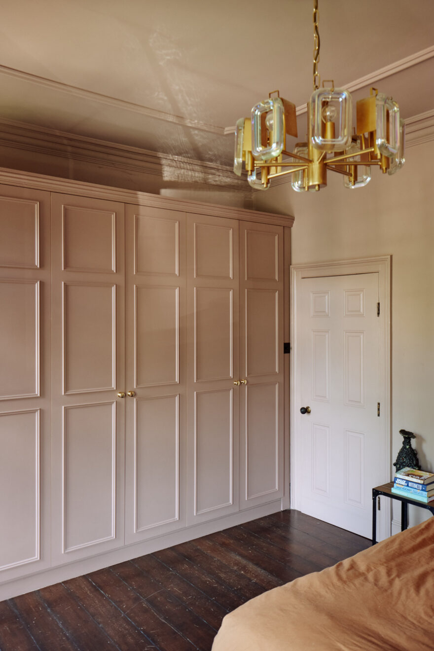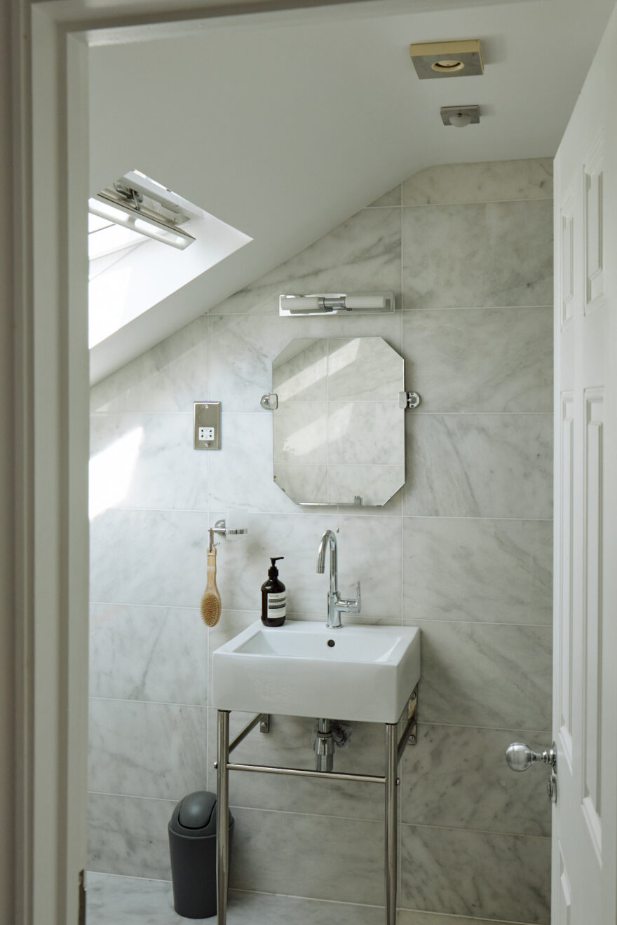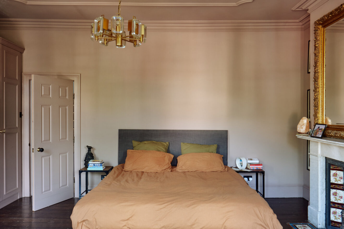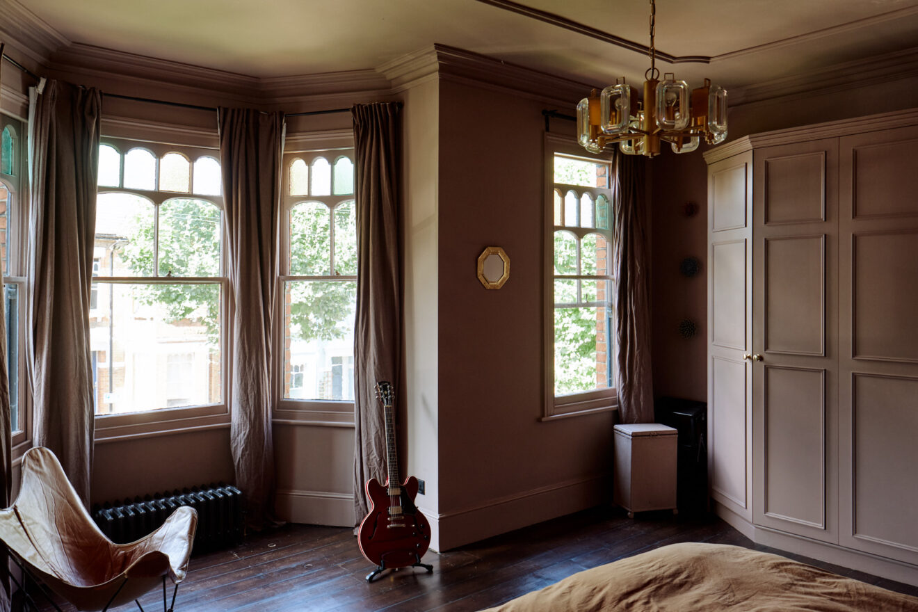 On the first floor, there are three spacious bedrooms and a family bathroom. The bathroom features a slipper, freestanding bath and classic white tiling. One of two principle bedrooms is found at the front of the plan, decorated in a dusty pink hue, with a marble fireplace flanked by original tiling. There is also a bespoke wardrobe running along the wall, providing plenty of storage space.