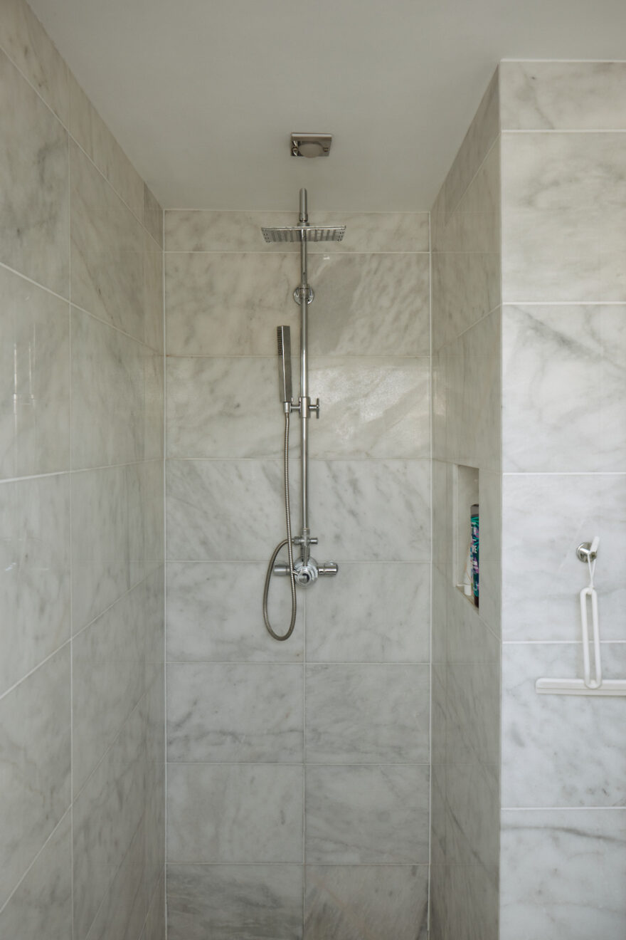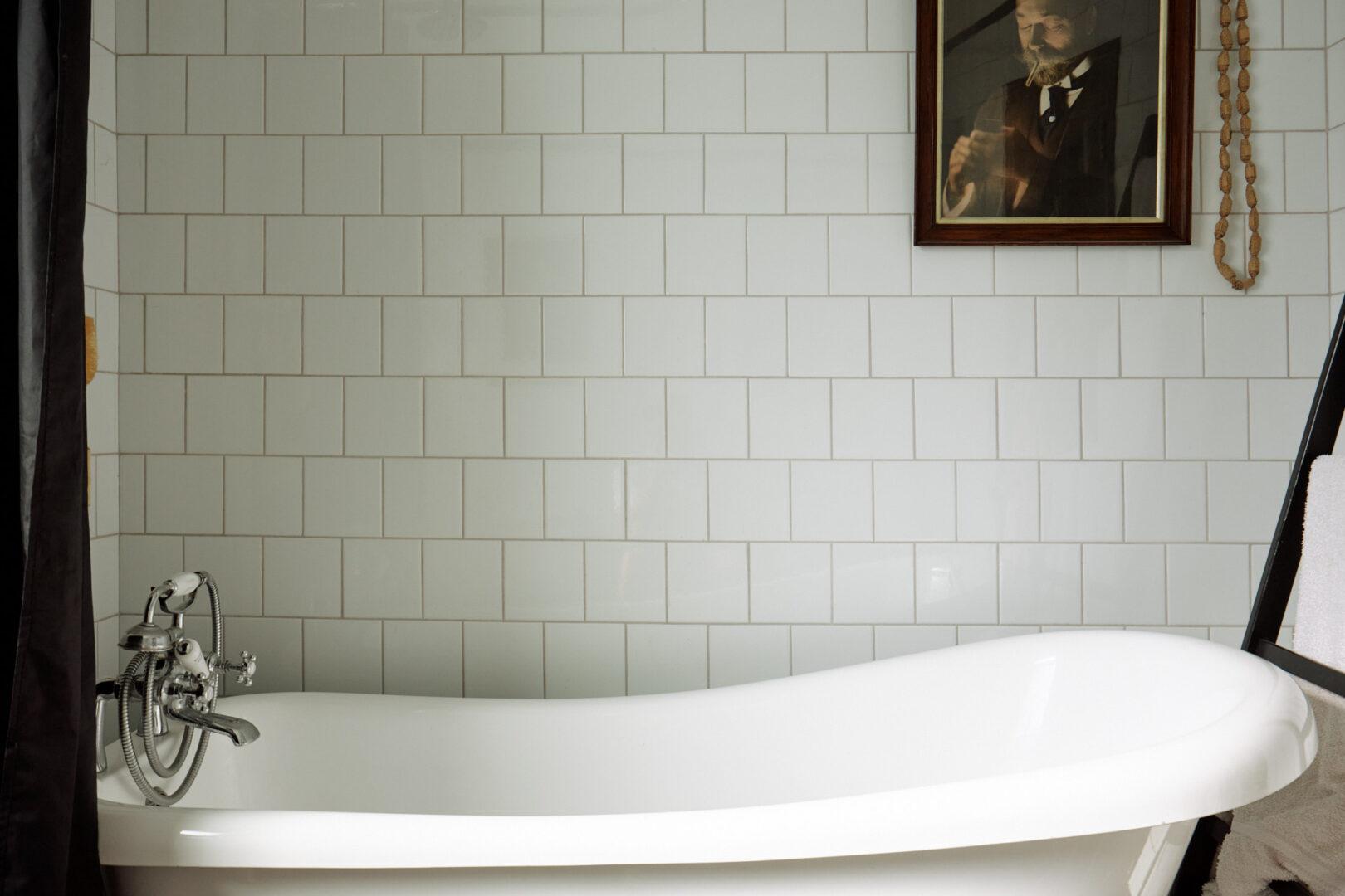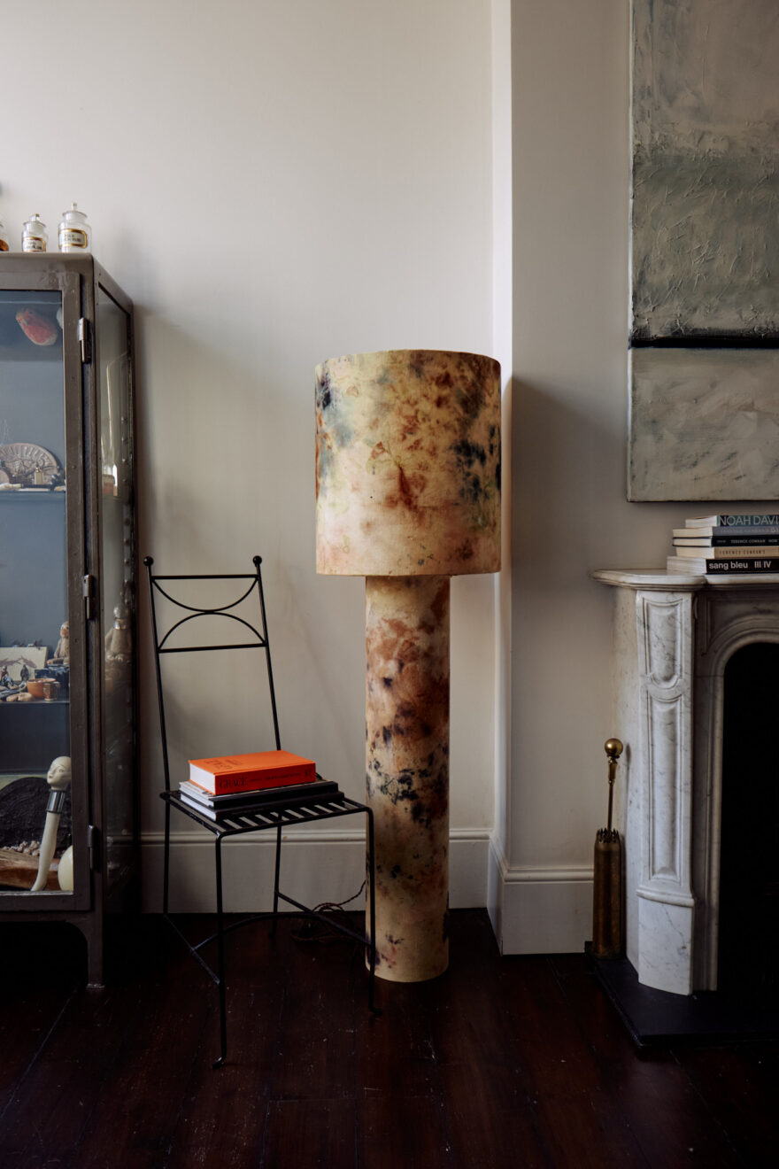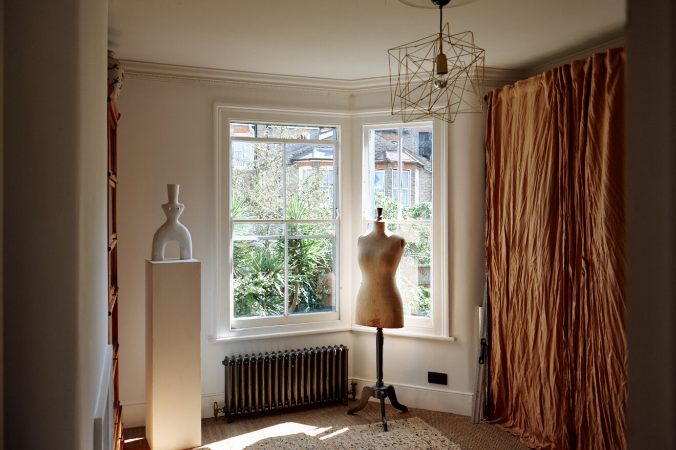 On the first floor, there are three spacious bedrooms and a family bathroom. The bathroom features a slipper, freestanding bath and classic white tiling. One of two principle bedrooms is found at the front of the plan, decorated in a dusty pink hue, with a marble fireplace flanked by original tiling. There is also a bespoke wardrobe running along the wall, providing plenty of storage space.