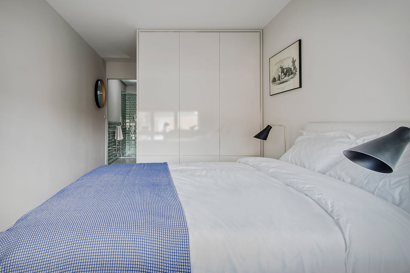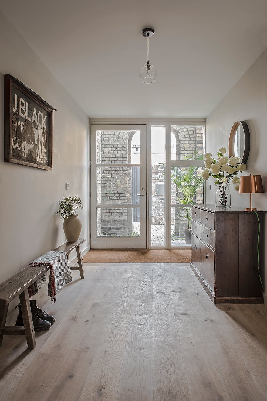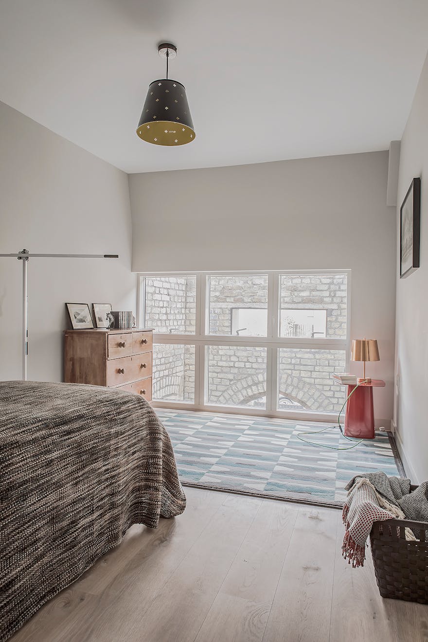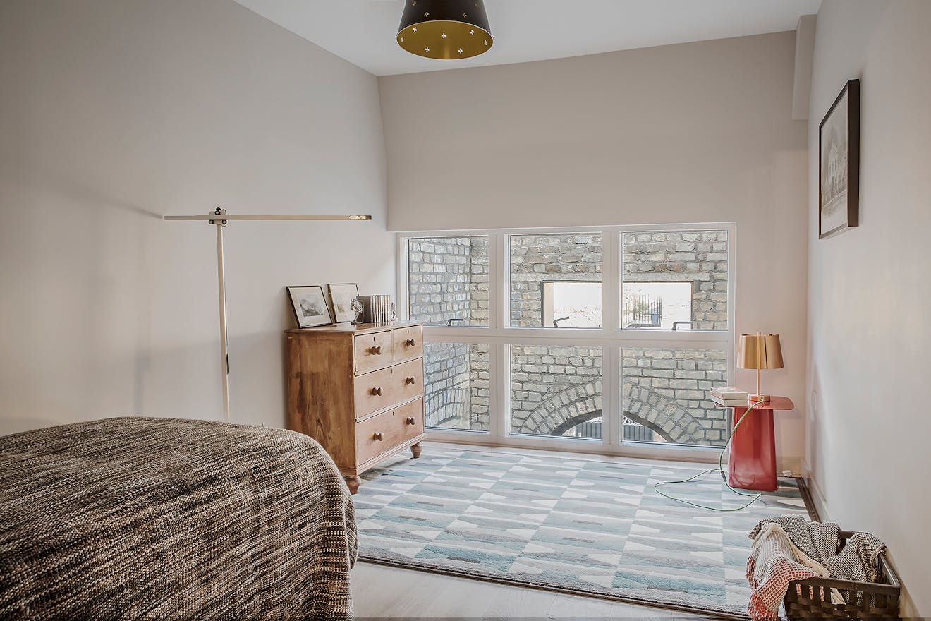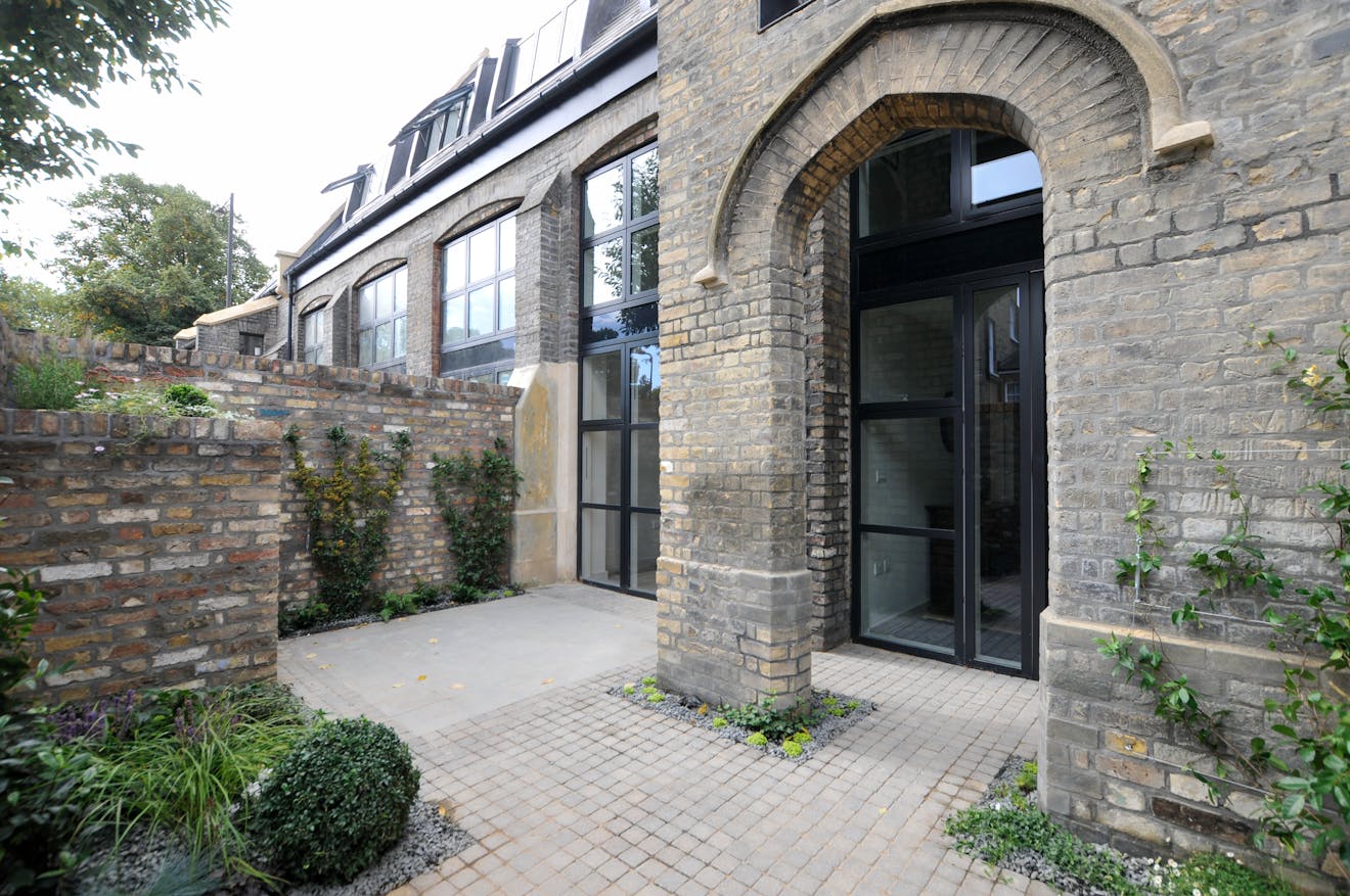 Set over three stories, a well thought out plan puts the main living space and kitchen at the top of the house to maximise natural light and to make full use of the wood-clad pitched ceiling. A magnificent top-floor living space with unique arched side windows, the space feels like a welcoming sanctuary. The hand-built British Standard Kitchen by Plain English is handmade in their Suffolk workshop and painted on site with Little Greene’s ‘Obsidian Green’. The kitchen also features a 30mm thick Carrera marble worktop with oversized splash back. On the middle floor are two double bedrooms (one en suite with bespoke wardrobes and storage spaces that have been custom-designed and laid out to make maximum use of space) and a family bathroom. The largest bedroom is on the ground floor and hosts a walk-in dressing room and en suite bathroom. This room could also easily become a second living area or study dependent on your needs. At ground level you’ll also find a utility room provisioned with a purpose-made stainless-steel catering table and sink. A large, wide hallway leads you out into a landscaped private courtyard that references English walled gardens and where the school’s original arched vestibule has been converted into a unique open-air folly. There is secure, gated access out on to the street beyond with a video entry-phone system.