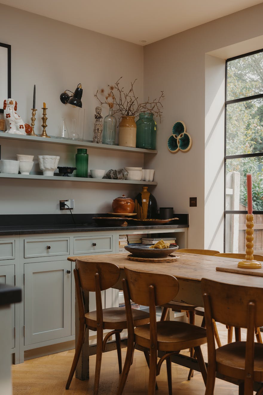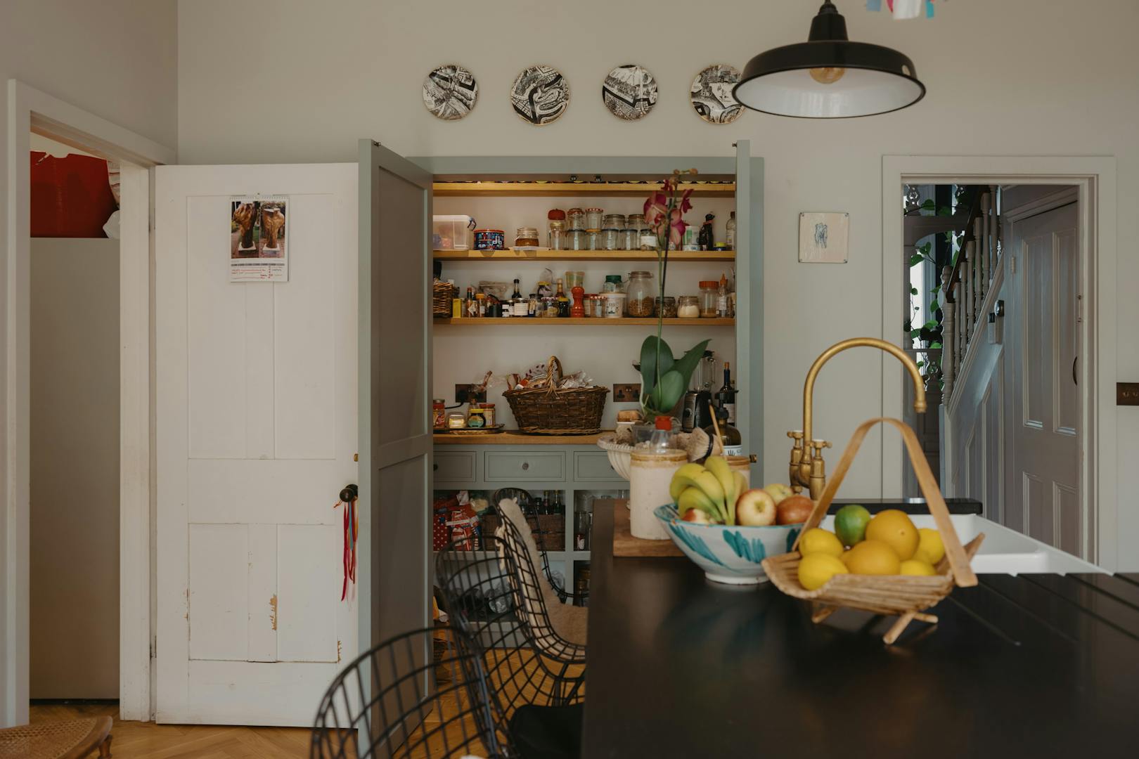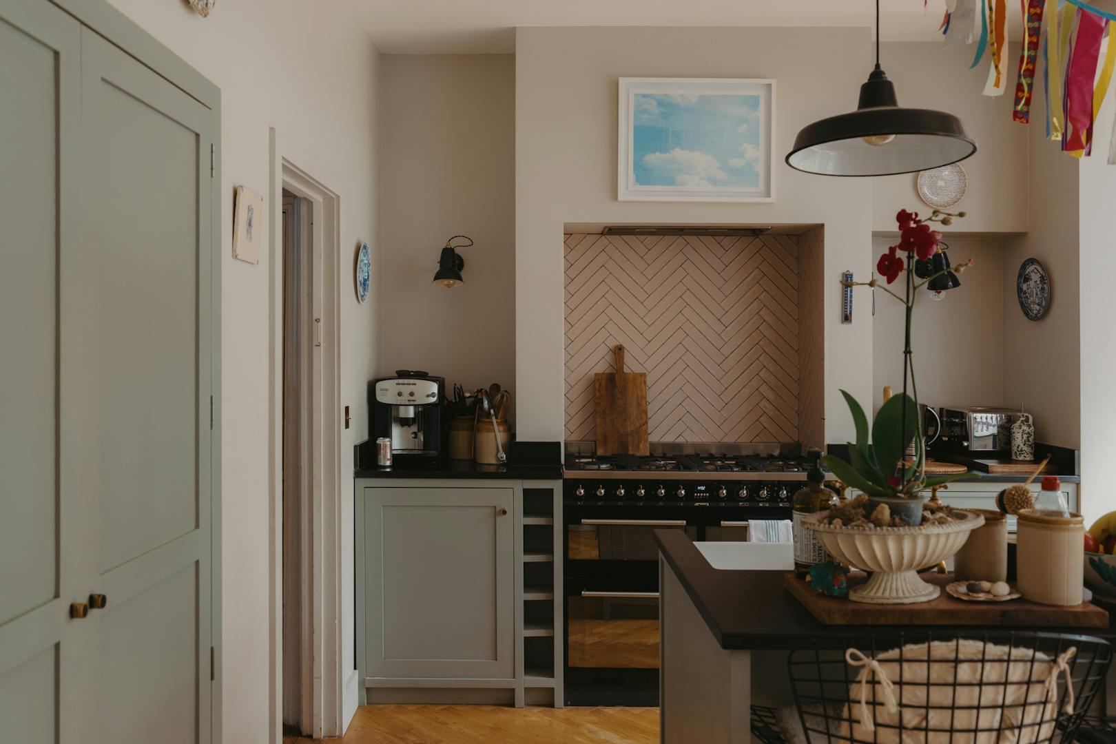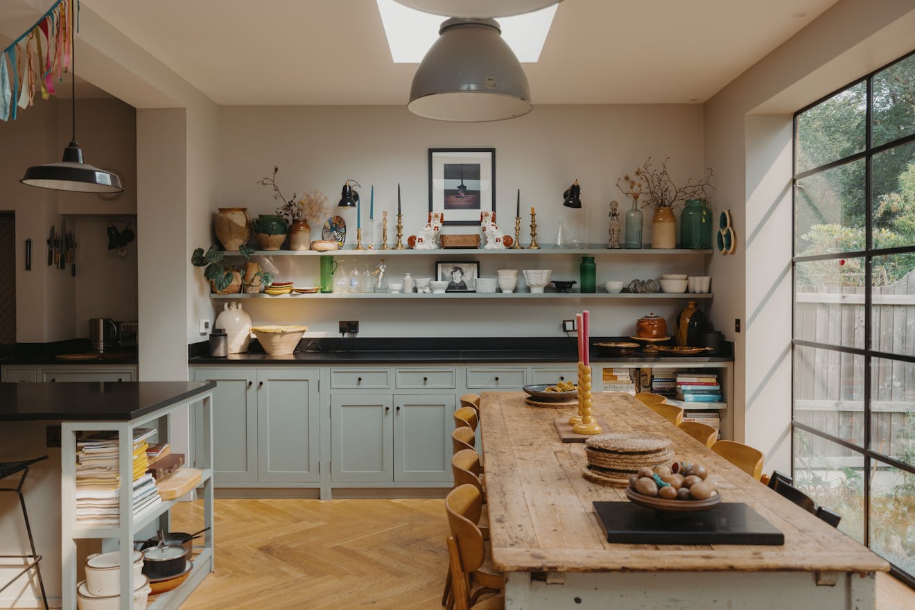 At the rear, an expansive kitchen and breakfast room stretches the full width of the house. Featuring large Crittall-style windows and doors, this space offers uninterrupted views of the south-facing rear garden. Designed in collaboration with Kent & London, the layout is both functional and versatile, with a Shaker-style kitchen, custom walk-in pantry, and a spacious island, perfect for family gatherings and entertaining. The extension is enhanced by overhead skylights, positioned directly above the dining area and family snug. Additionally, a utility room and cloakroom, with wall coverings by House of Hackney adds character to the practicality of the space. There is also access to a cellar which can be accessed via the hallway.