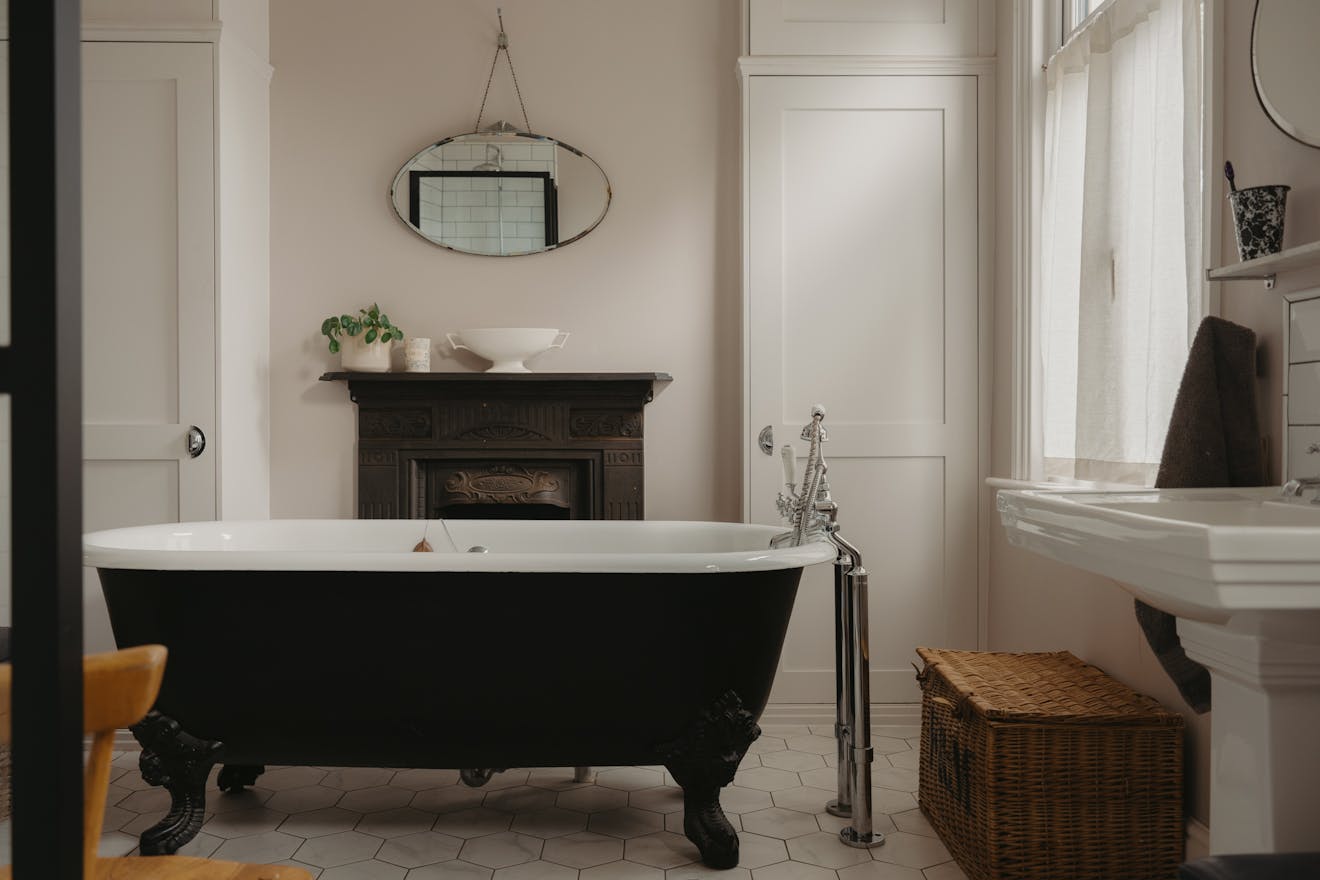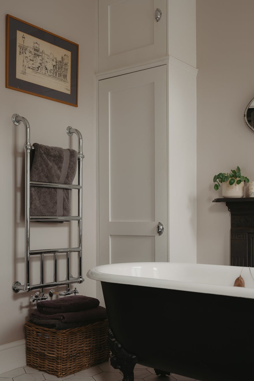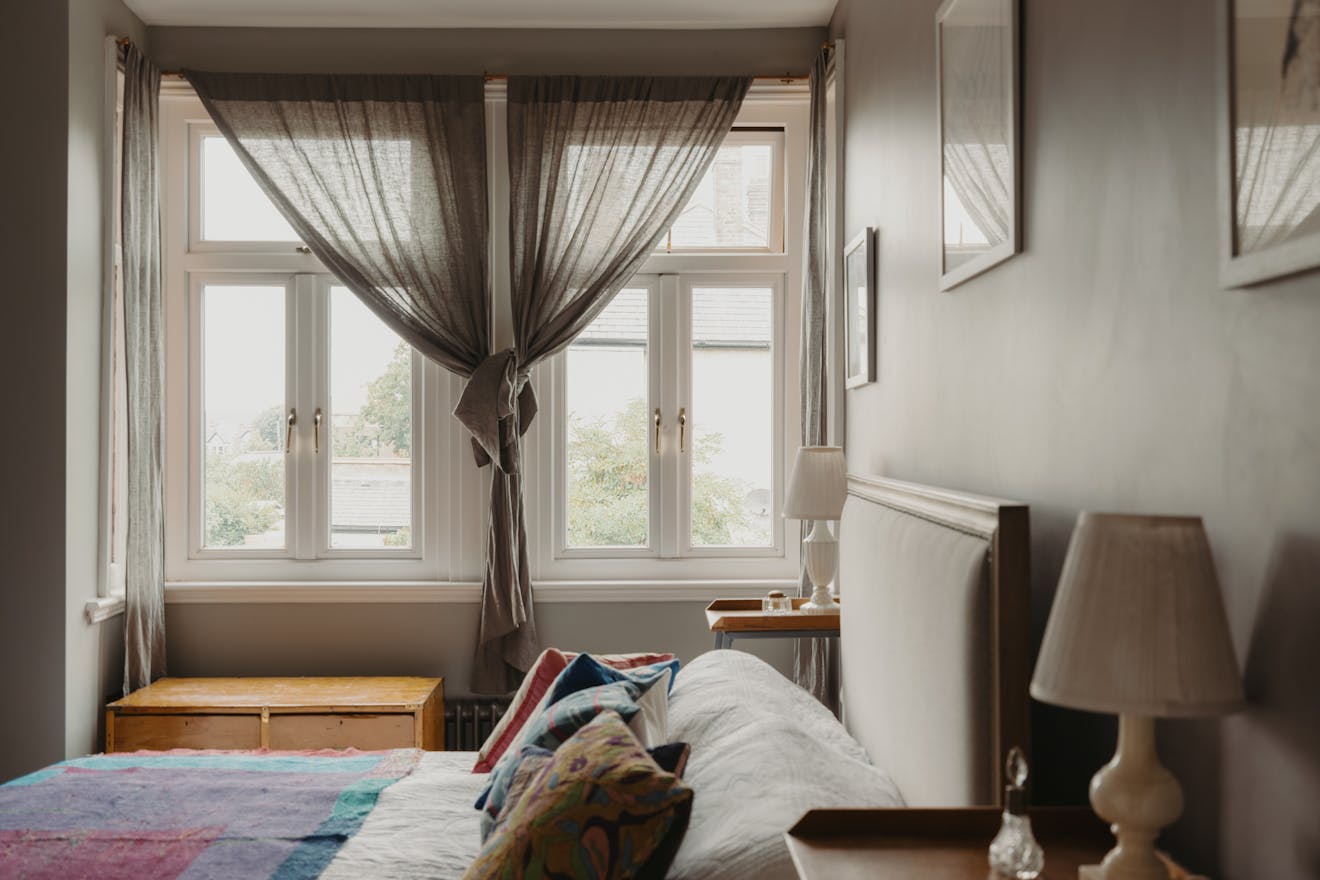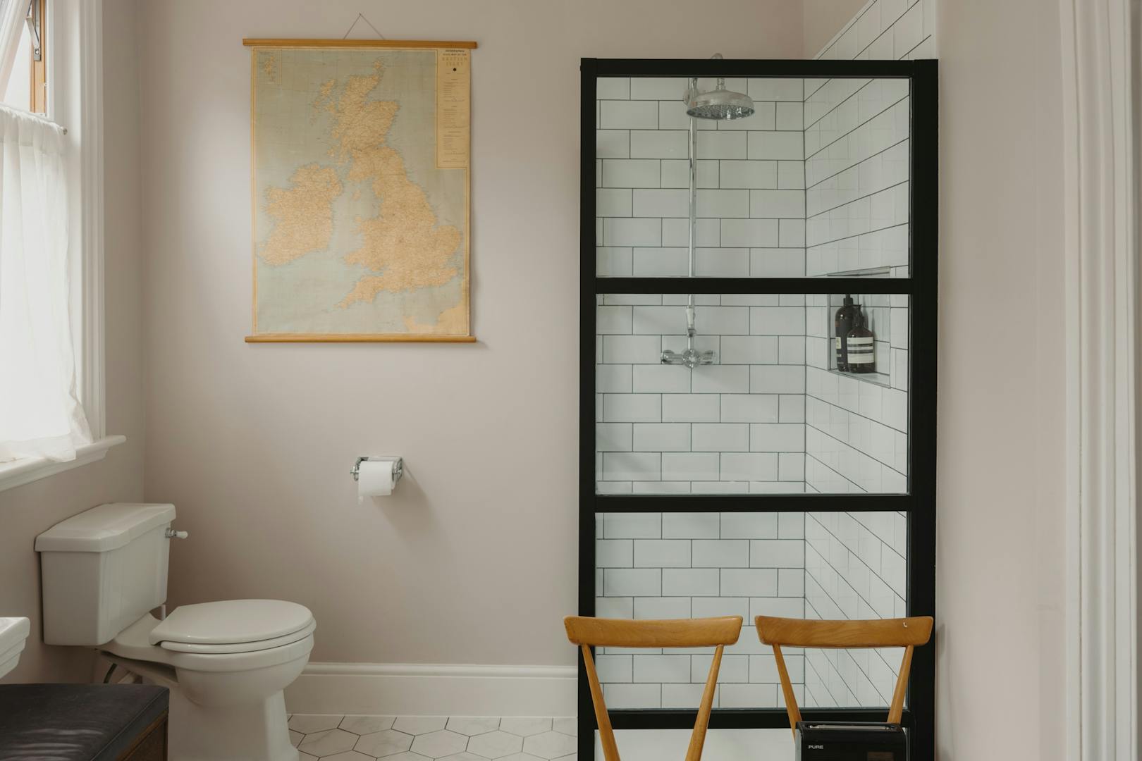 A well planned family bathroom hosts a feature cast-iron roll-top bath which sits in the centre of the room. Burlington sanitaryware complements the soft, tonal palette, while a feature cast-iron fireplace, rain shower, handwash basin, low-level WC, and heated towel rail complete the design.