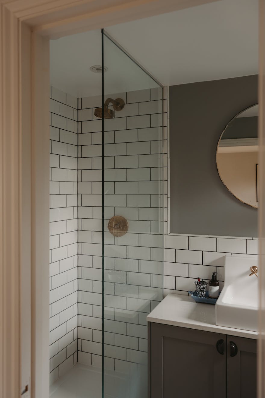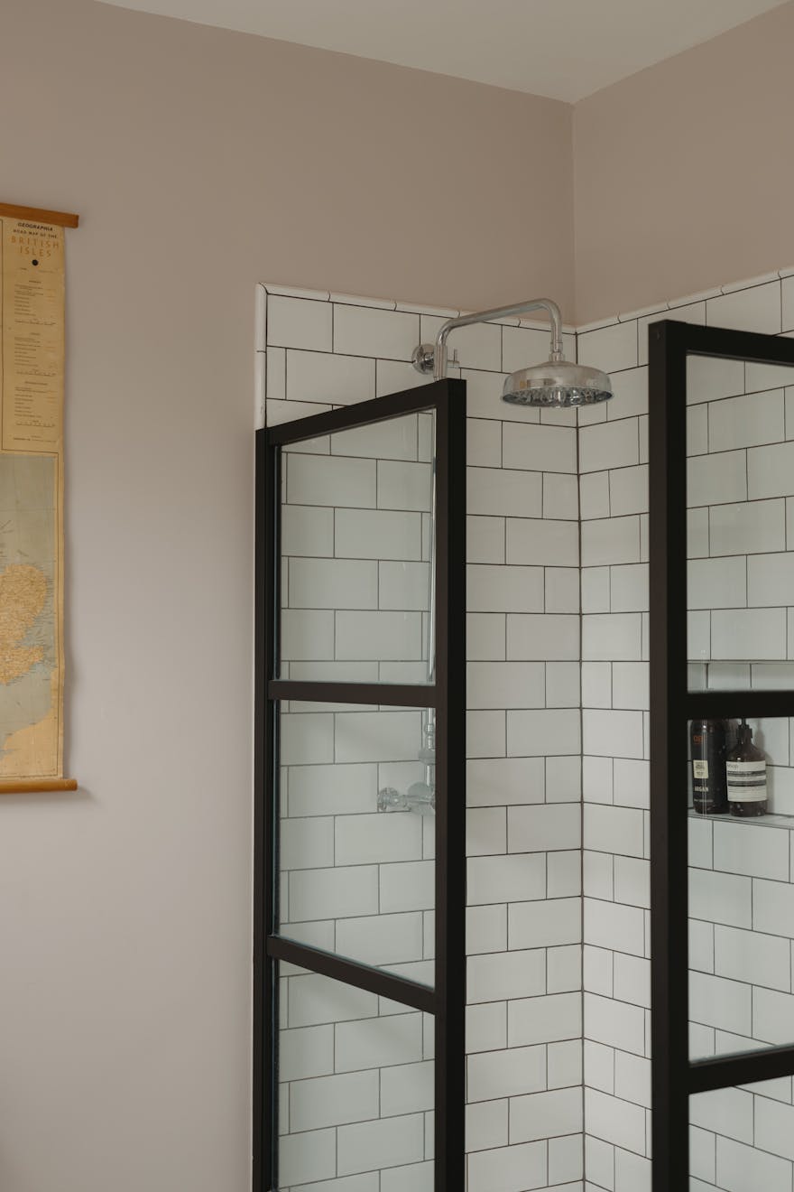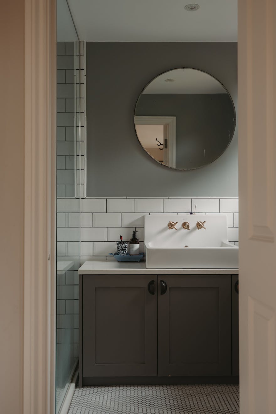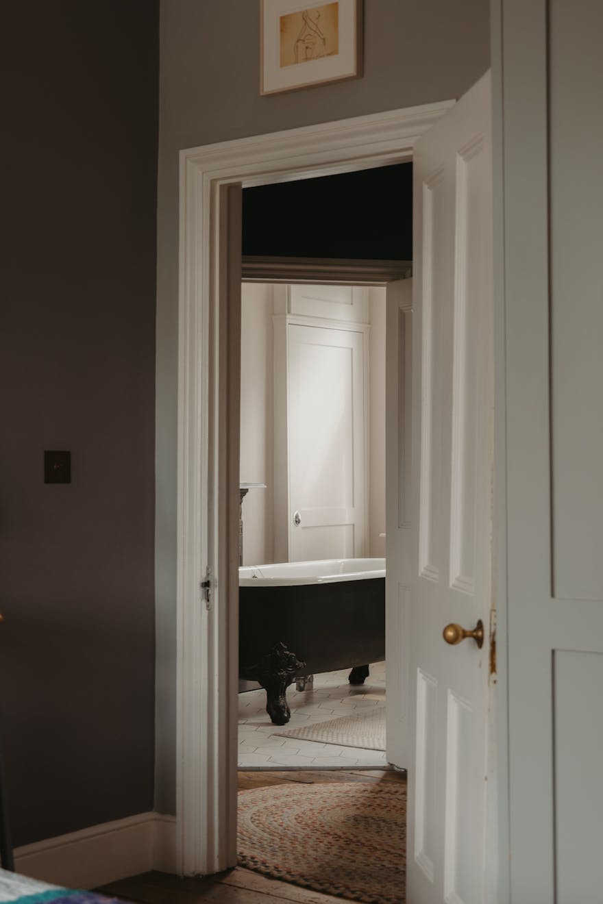 A well planned family bathroom hosts a feature cast-iron roll-top bath which sits in the centre of the room. Burlington sanitaryware complements the soft, tonal palette, while a feature cast-iron fireplace, rain shower, handwash basin, low-level WC, and heated towel rail complete the design.
